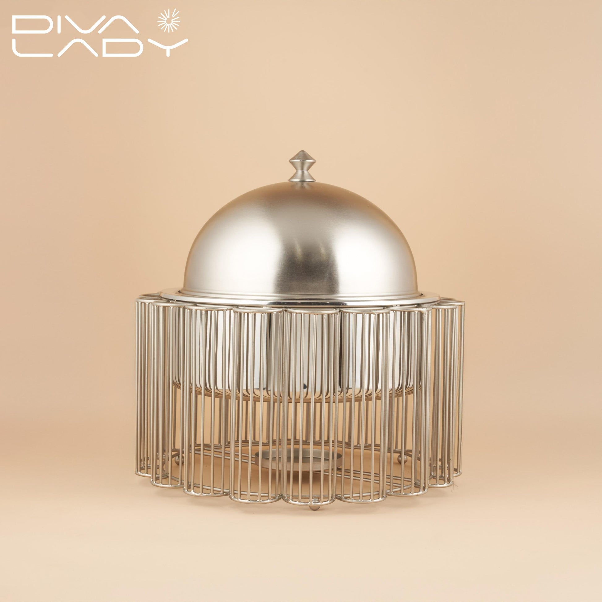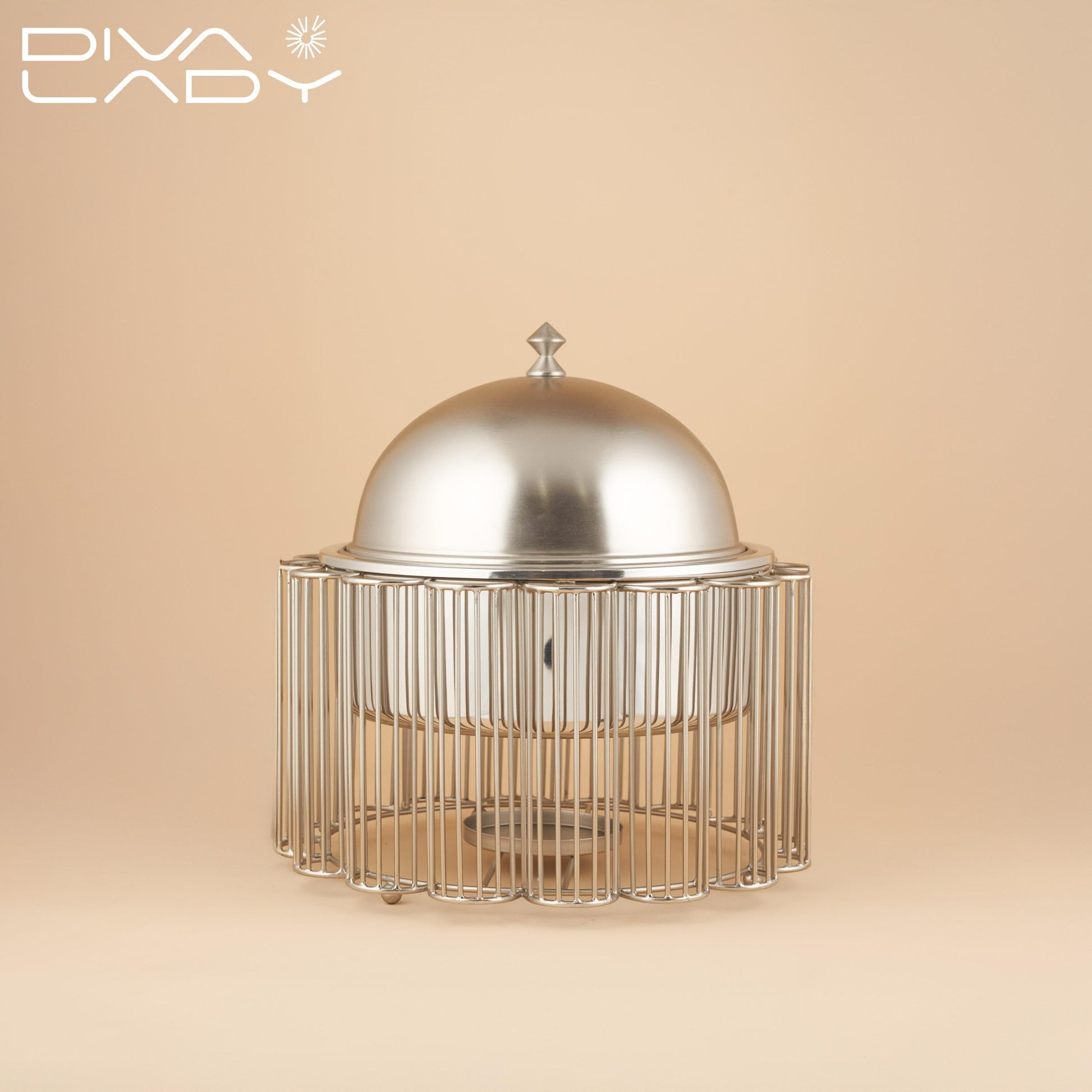 سخان طعام بهيكل متين من الاستيل . حامل فضى اللون و غطاء فضى له مظهر مميز . له حيز لوضع شمعة للتسخين