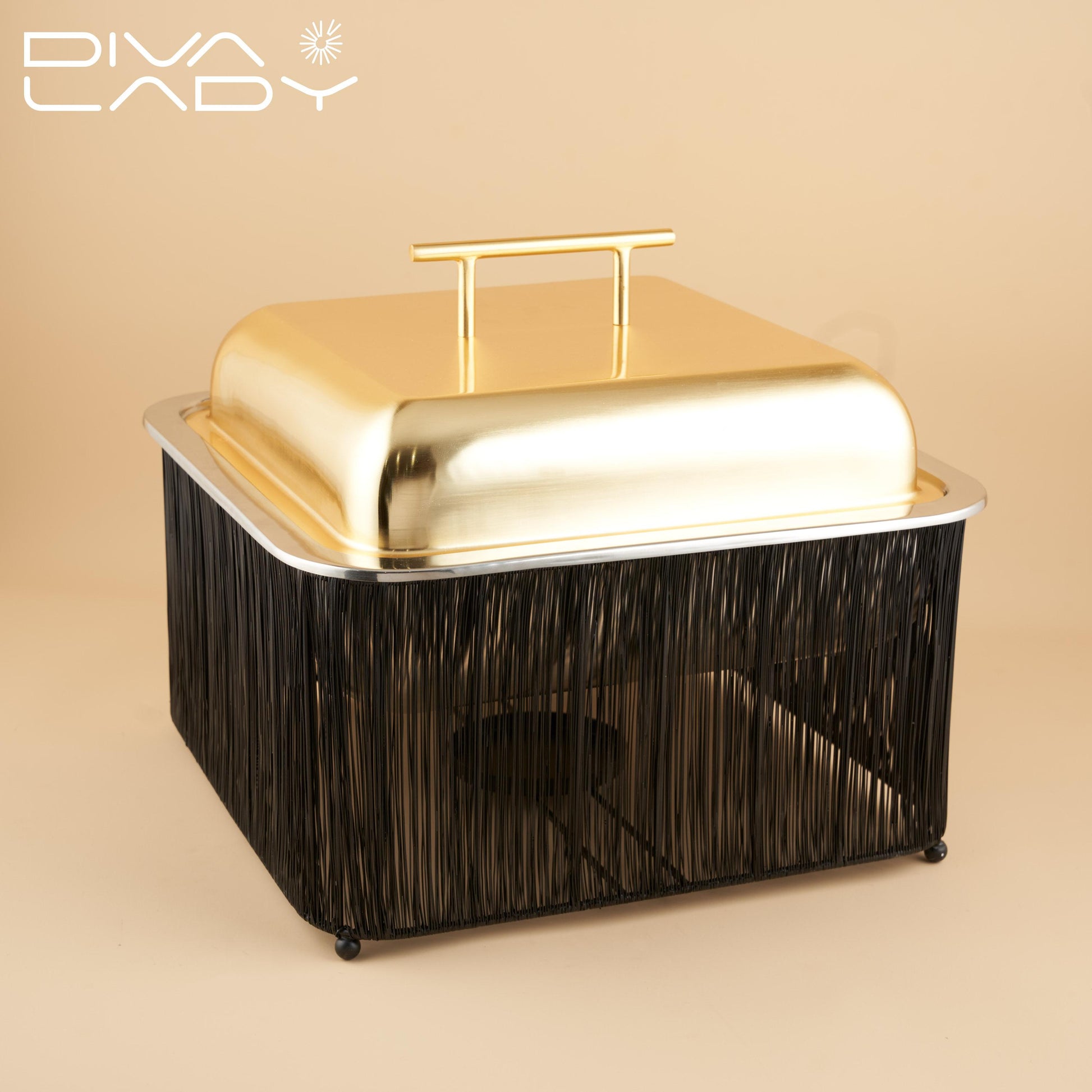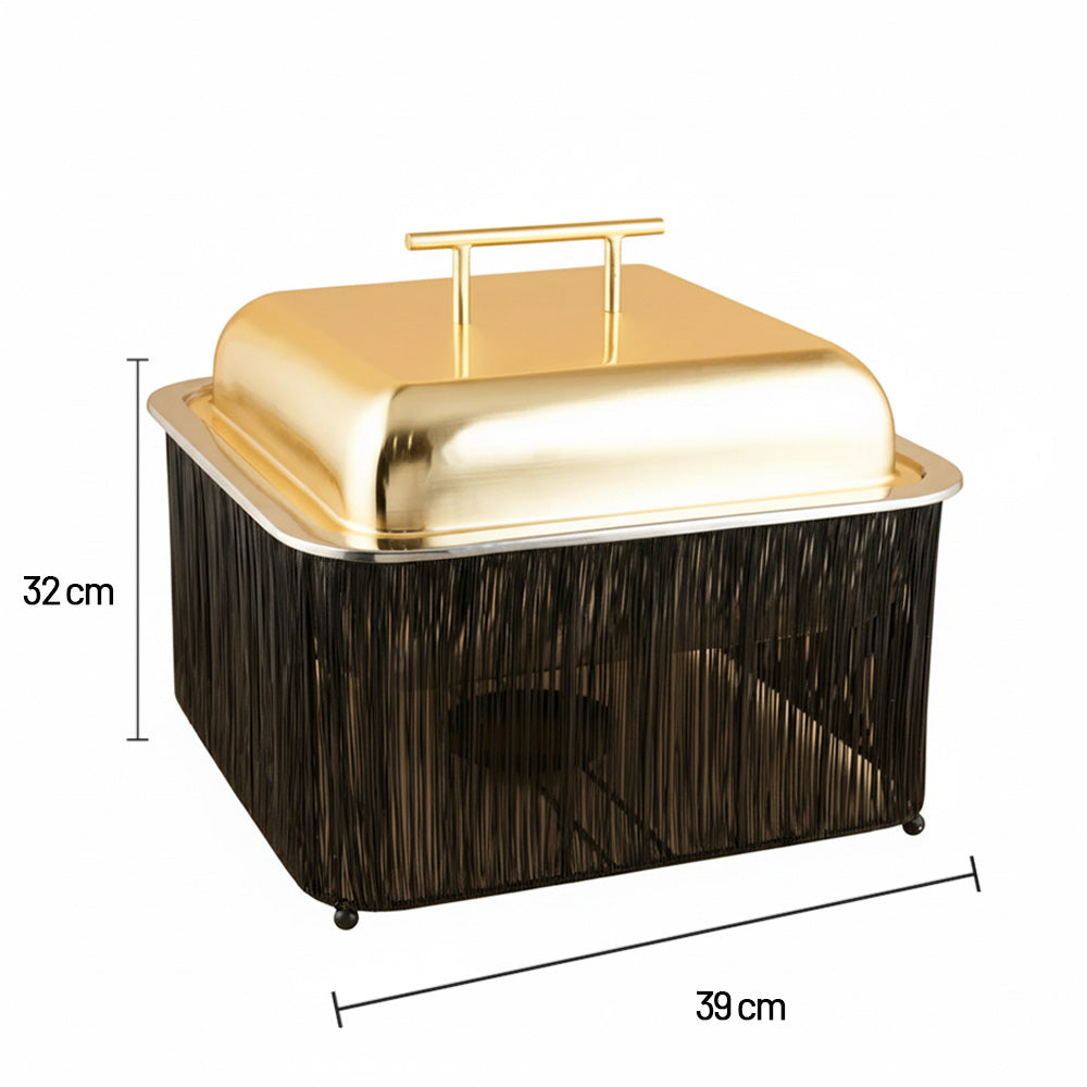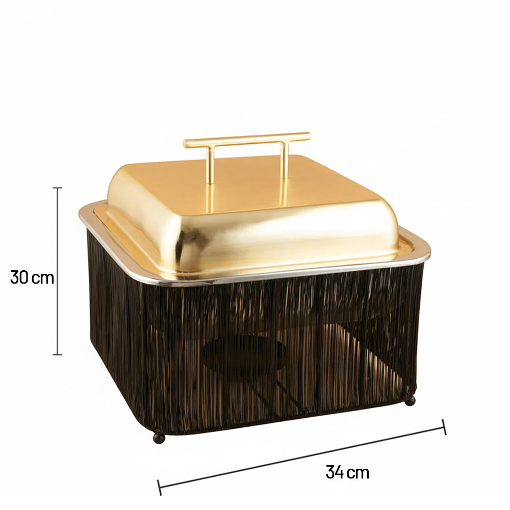 سخان طعام مربع اسود مع الغطاء ذهبى مصنوع من الاستانلس ستيل المقاوم للصدا مما يضيف علية مظهرا عالى الجودة و المتانة و الحماية الجانبية ويحيط بالوعاء قاعدة مصنوعة من الاسلاك المعدنية و التى تكون مصممة لتوفير التهوية افضل