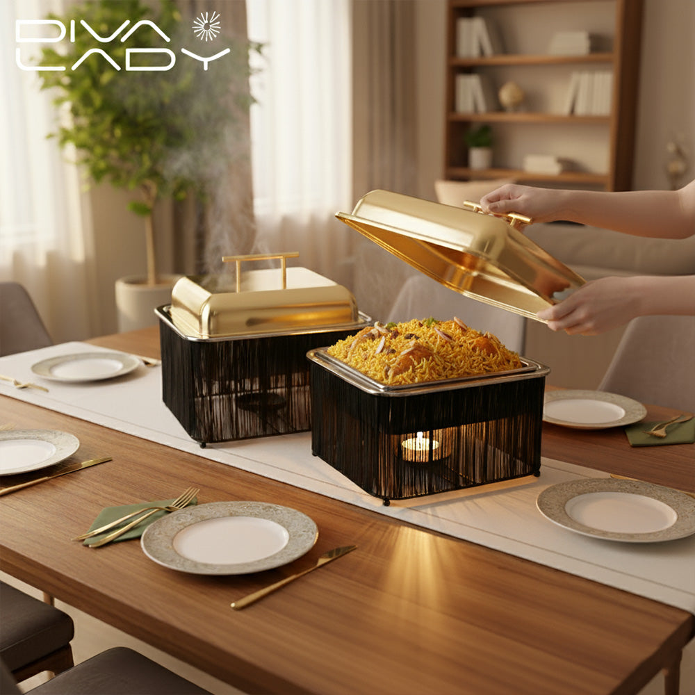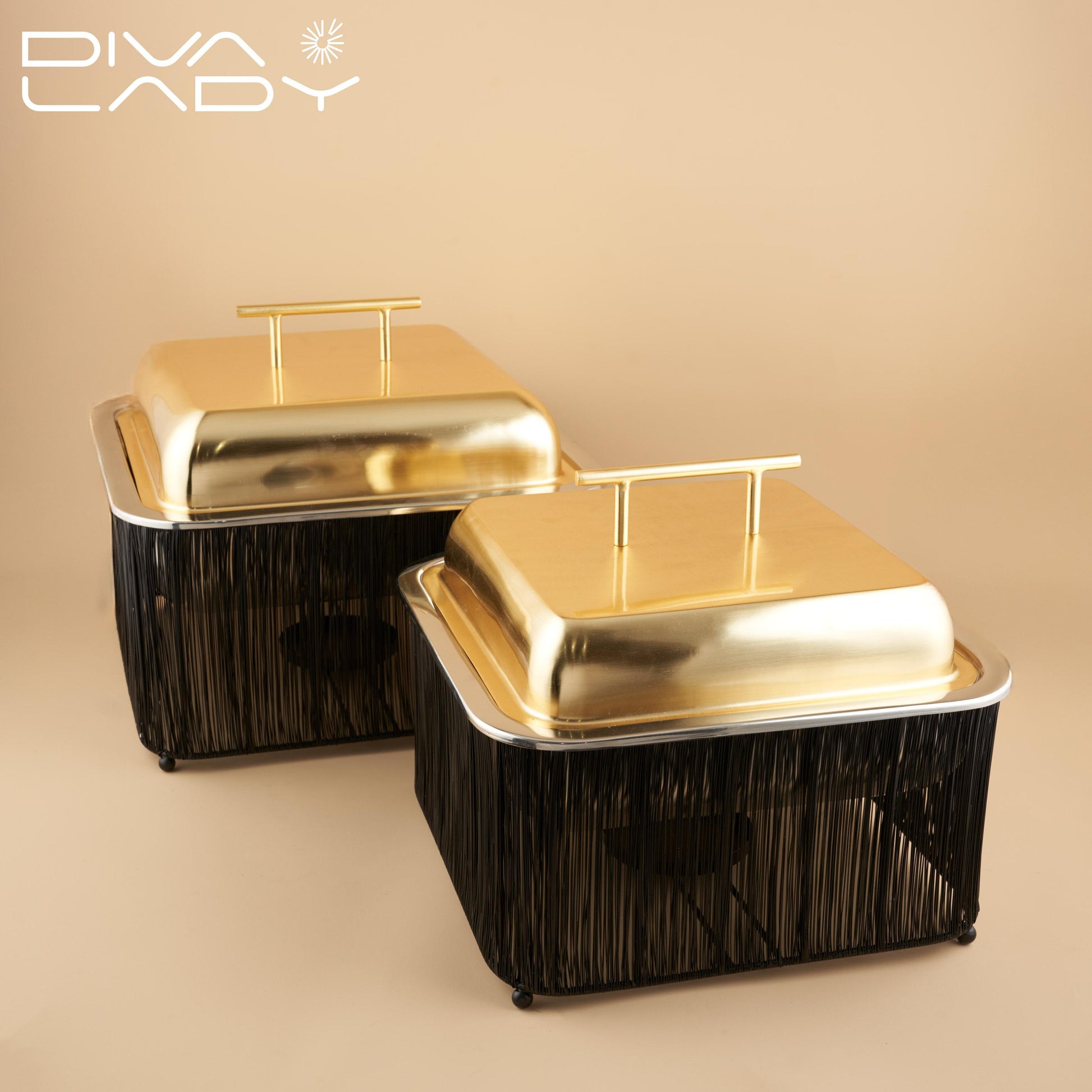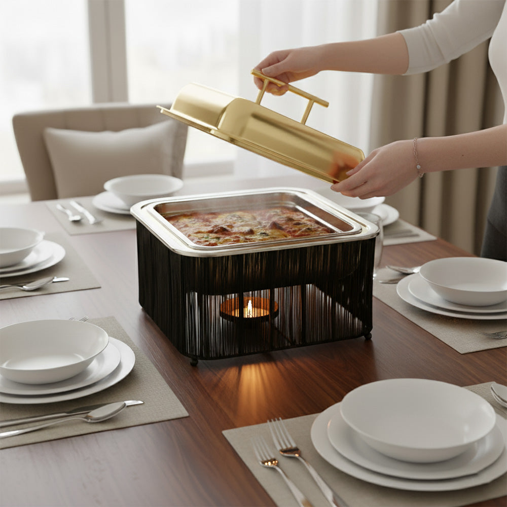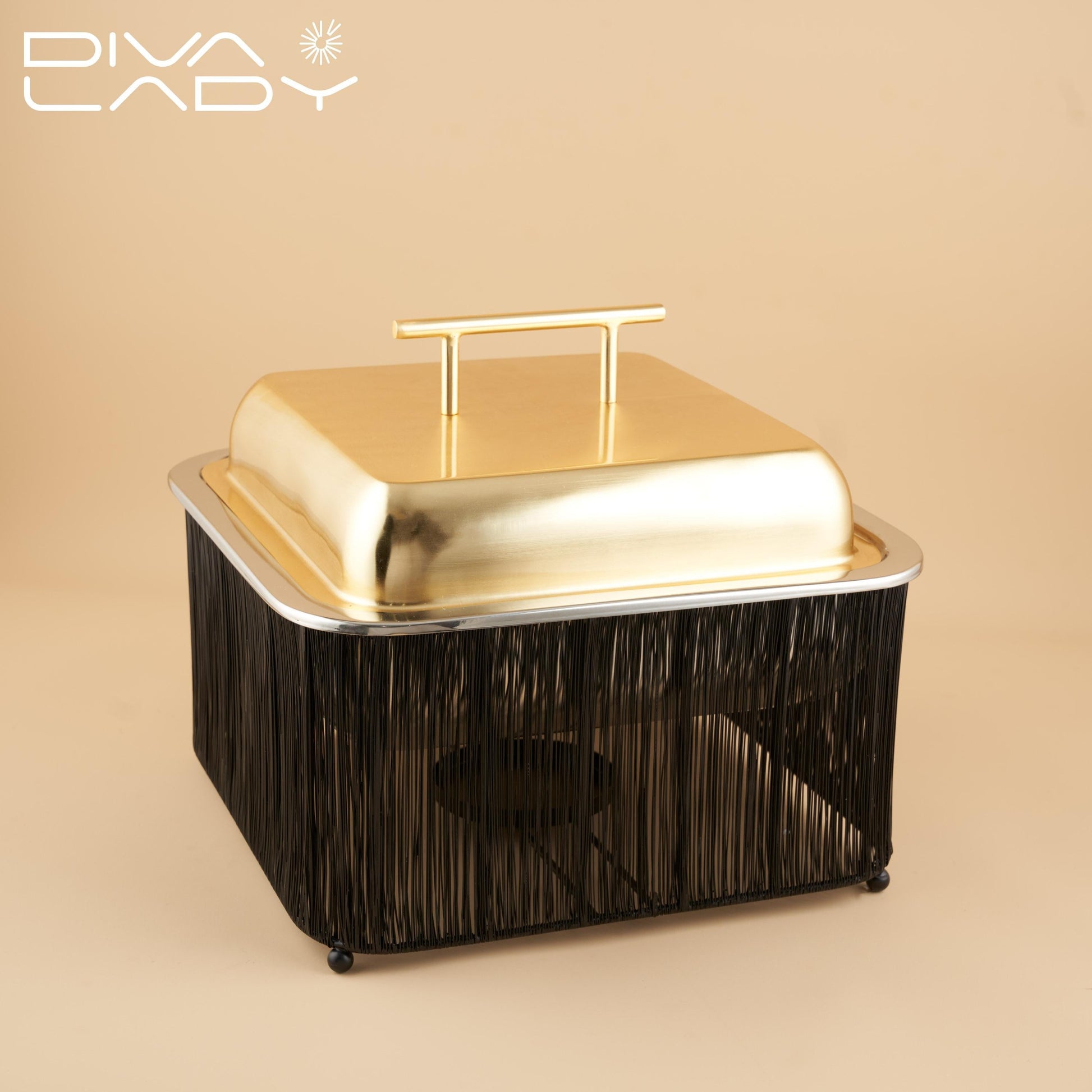 سخان طعام مربع اسود مع الغطاء ذهبى مصنوع من الاستانلس ستيل المقاوم للصدا مما يضيف علية مظهرا عالى الجودة و المتانة و الحماية الجانبية ويحيط بالوعاء قاعدة مصنوعة من الاسلاك المعدنية و التى تكون مصممة لتوفير التهوية افضل
