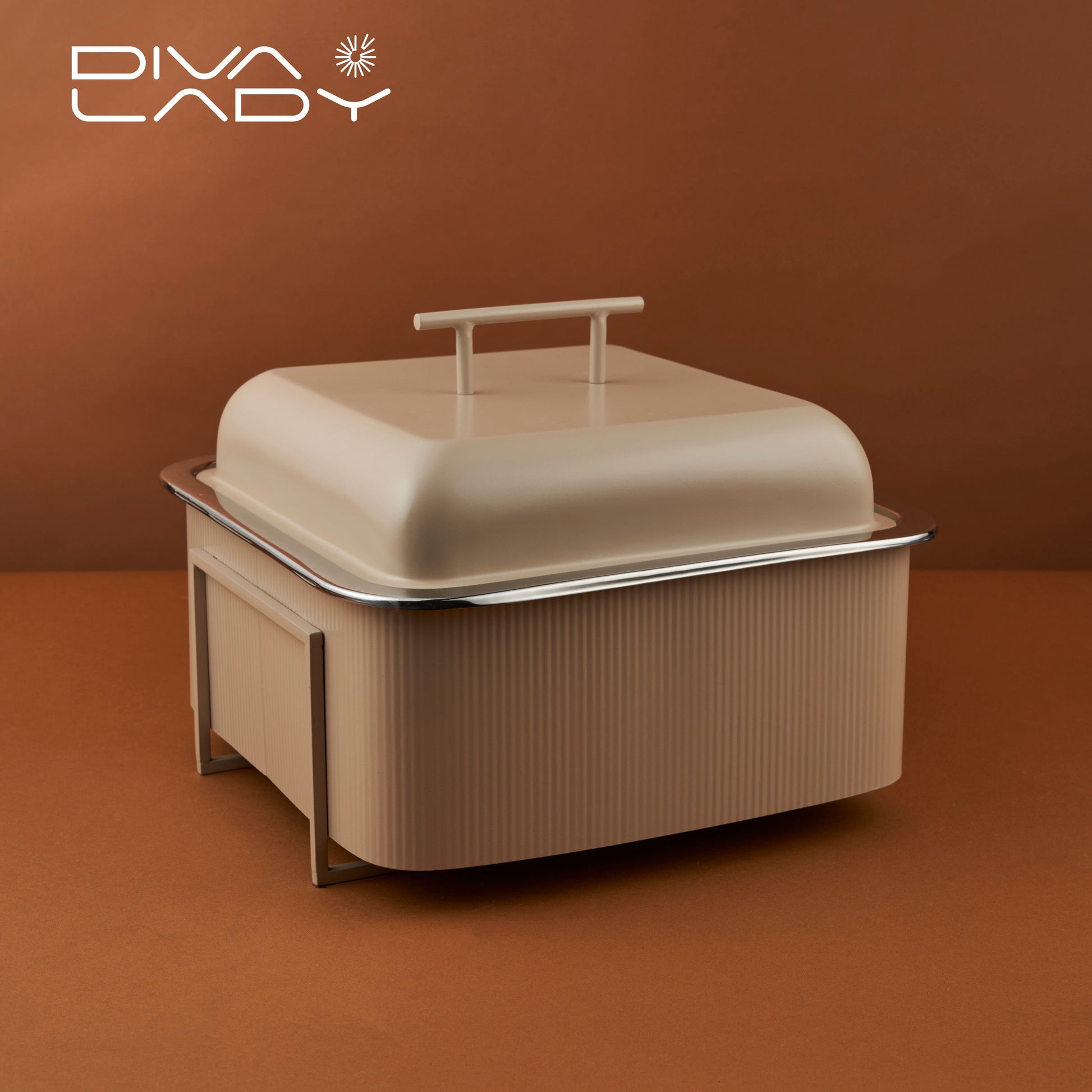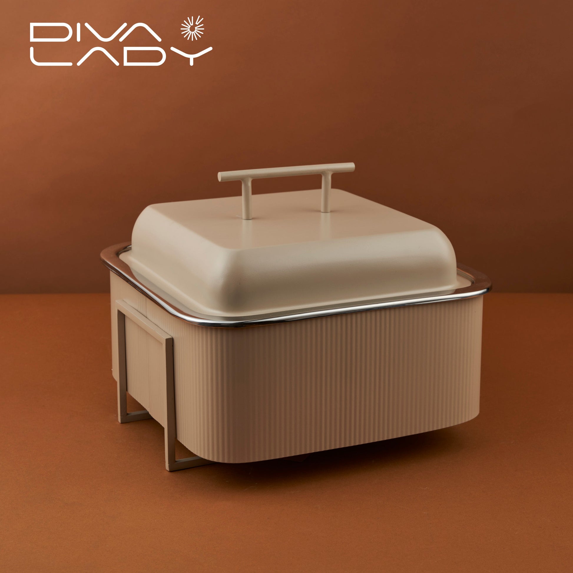 وعاء طعام كبيرمربع الشكل يحتوي على غطاء محكم الإغلاق وحامل معدني. يتميز بشكل جذاب. يمكن استخدامه لتقديم الأطعمة الساخنة والحفاظ عليها دافئة لفترة طويلة.