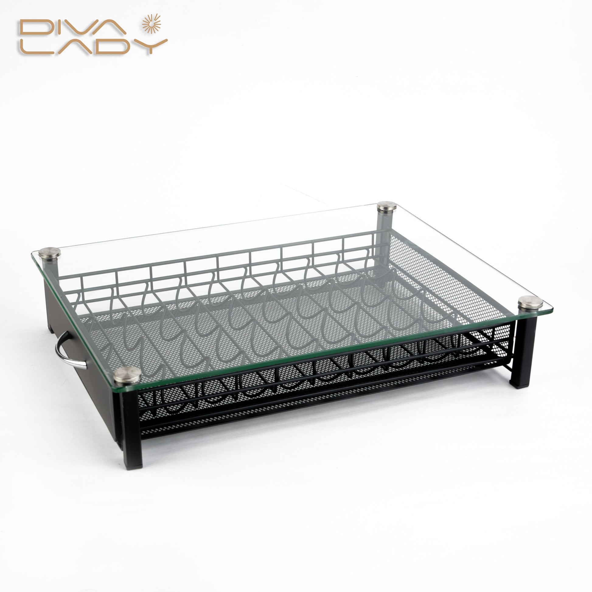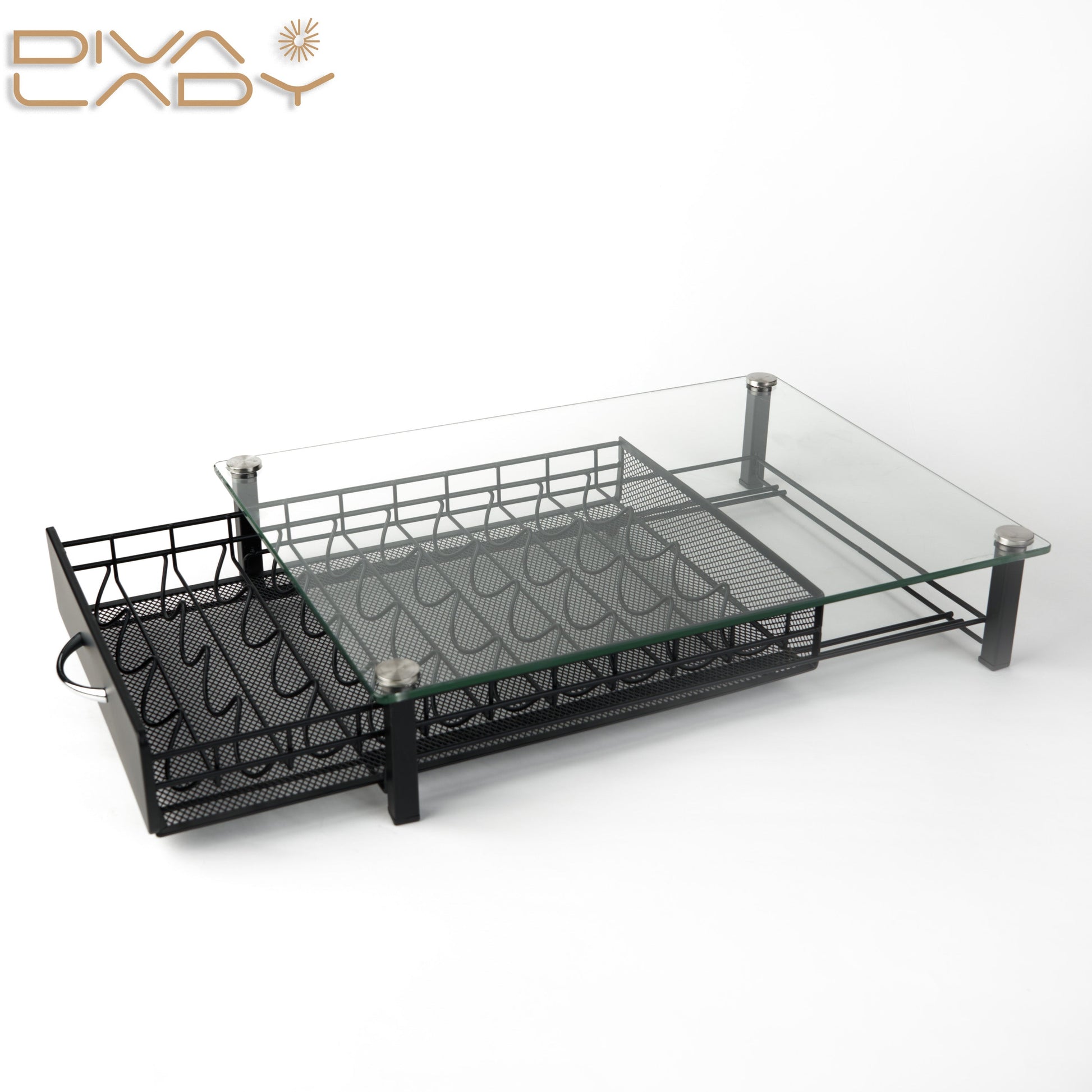 قاعدة معدنية سوداء بتقسيمات دقيقة لحمل عدد كبير من كبسولات القهوة بشكل منظم وسهل الاستخدام.
