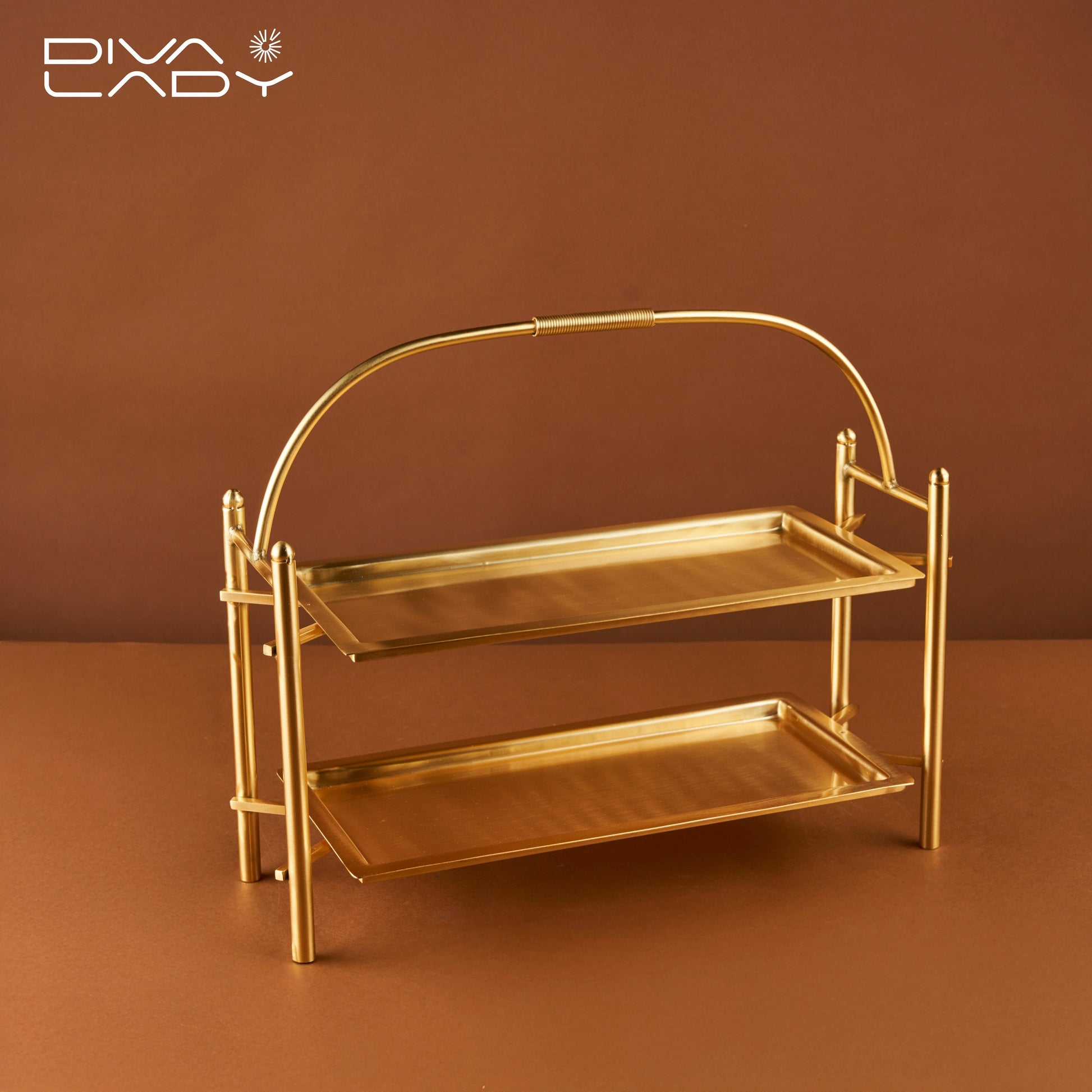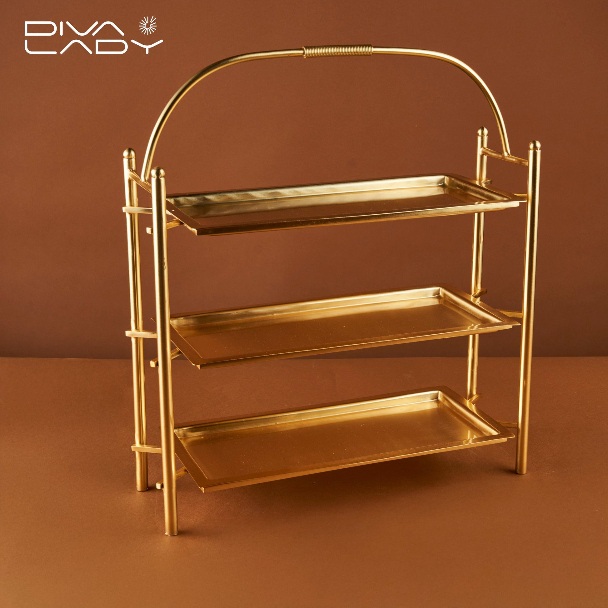 ستاند معدني مستطيلة الشكل يستخدم غالبًا لتقديم الكيك أو الحلويات يتميز بتصميم بسيط وأنيق مع إطار معدني قابل للحمل عبر مقبض منحني في الأعلى الطبقات منظمة بشكل عمودي لعرض الحلويات بطريقة مرتبة وجذابة