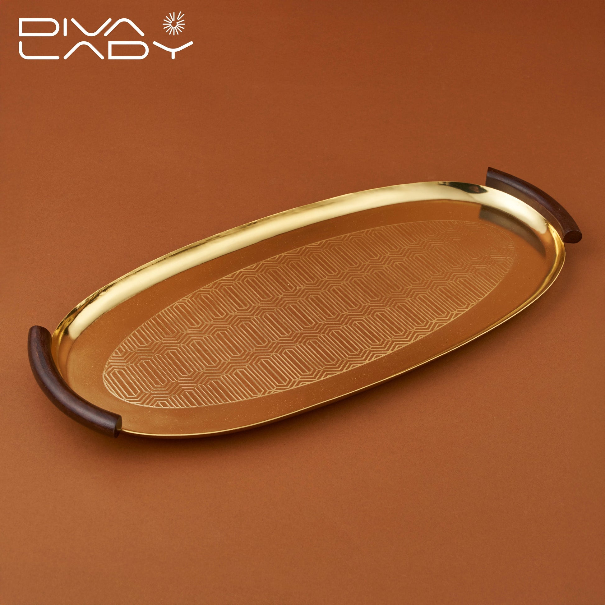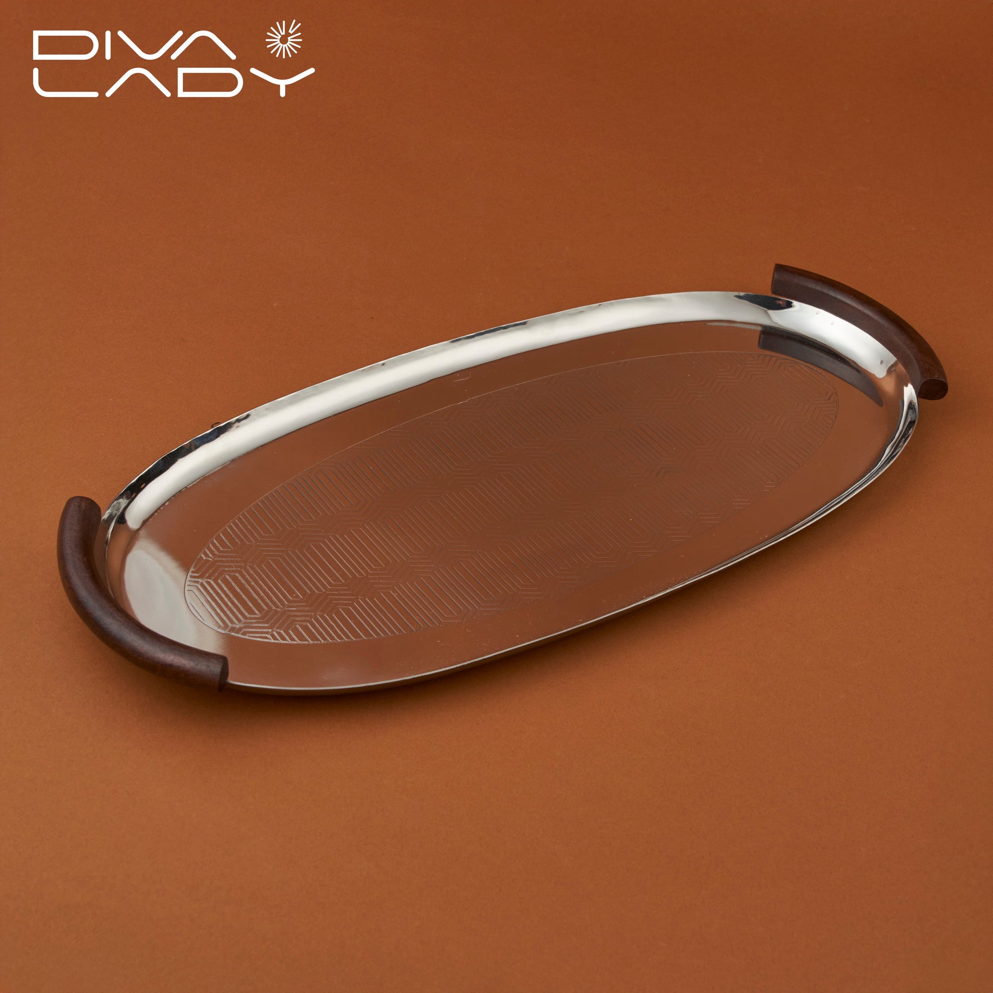 صينية بيضاوية مقبض خشبى , مصنوعة الاستاليس ستيل و لها مقبضان من الخشب , سطح