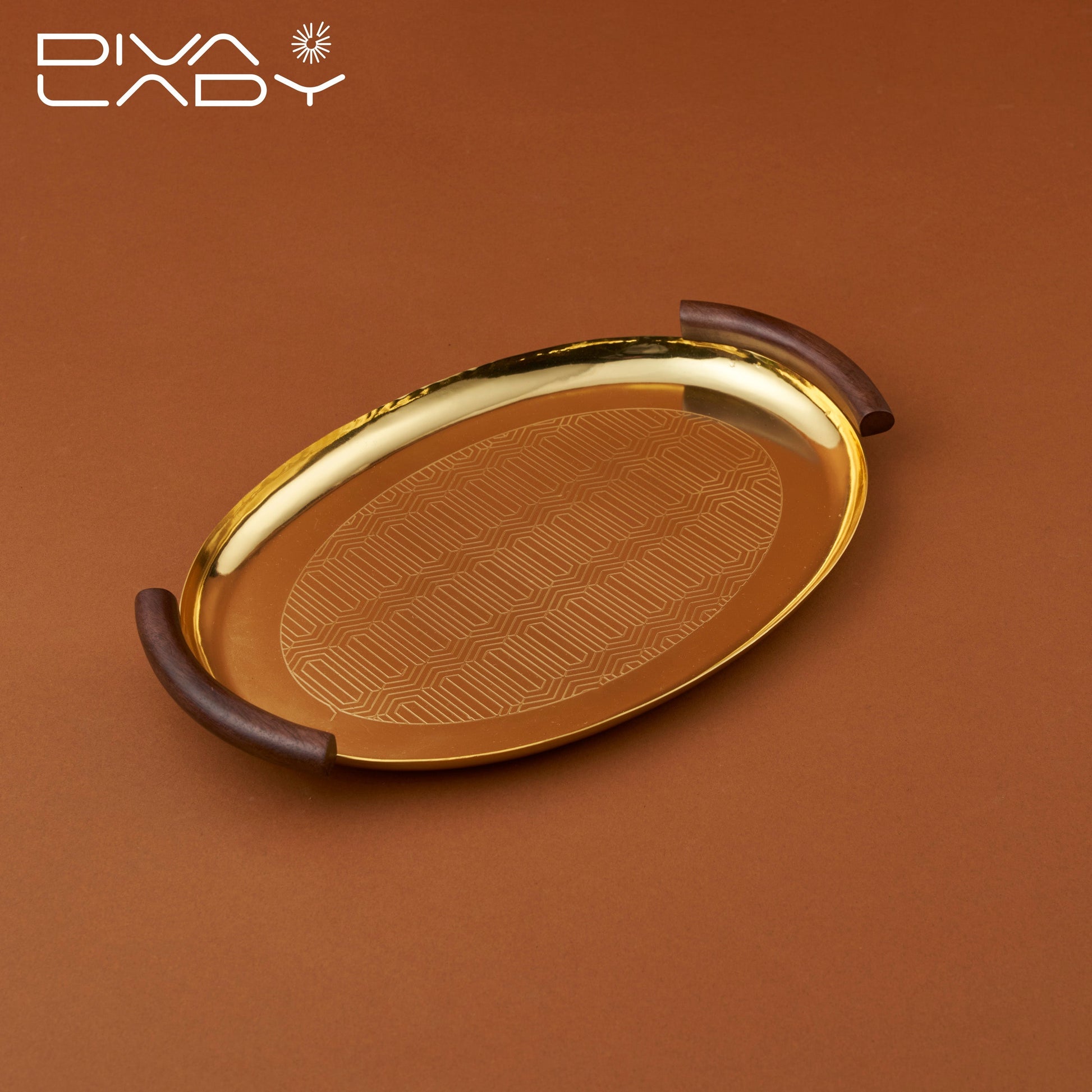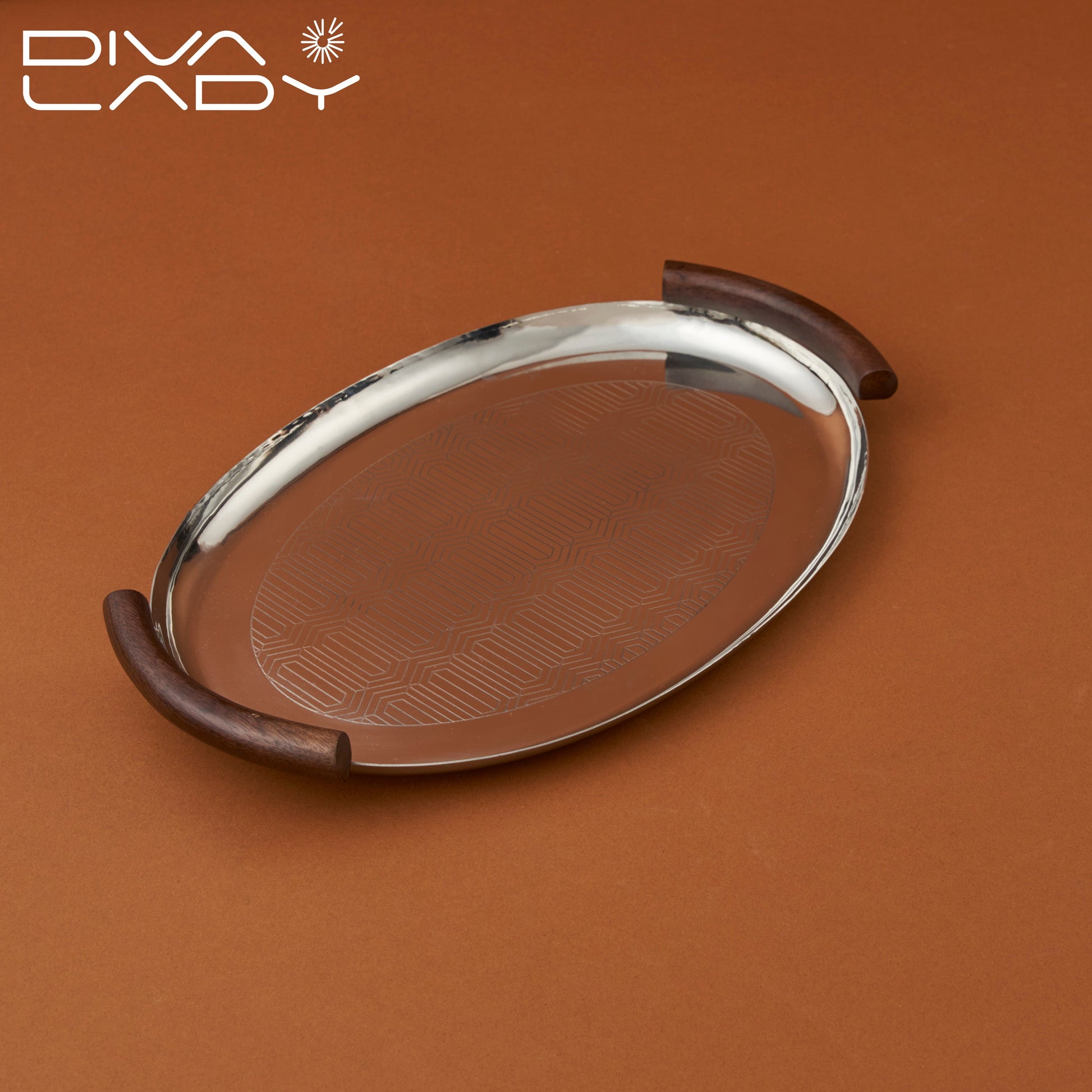 صينية بيضاوية مقبض خشبى مصنوعة الاستاليس ستيل و لها مقبضان من الخشب سطح الصينية مزخرف بنقوش تعطى السطح مظهرا انيقا سهلة التنظيف و مقاومة للصدا