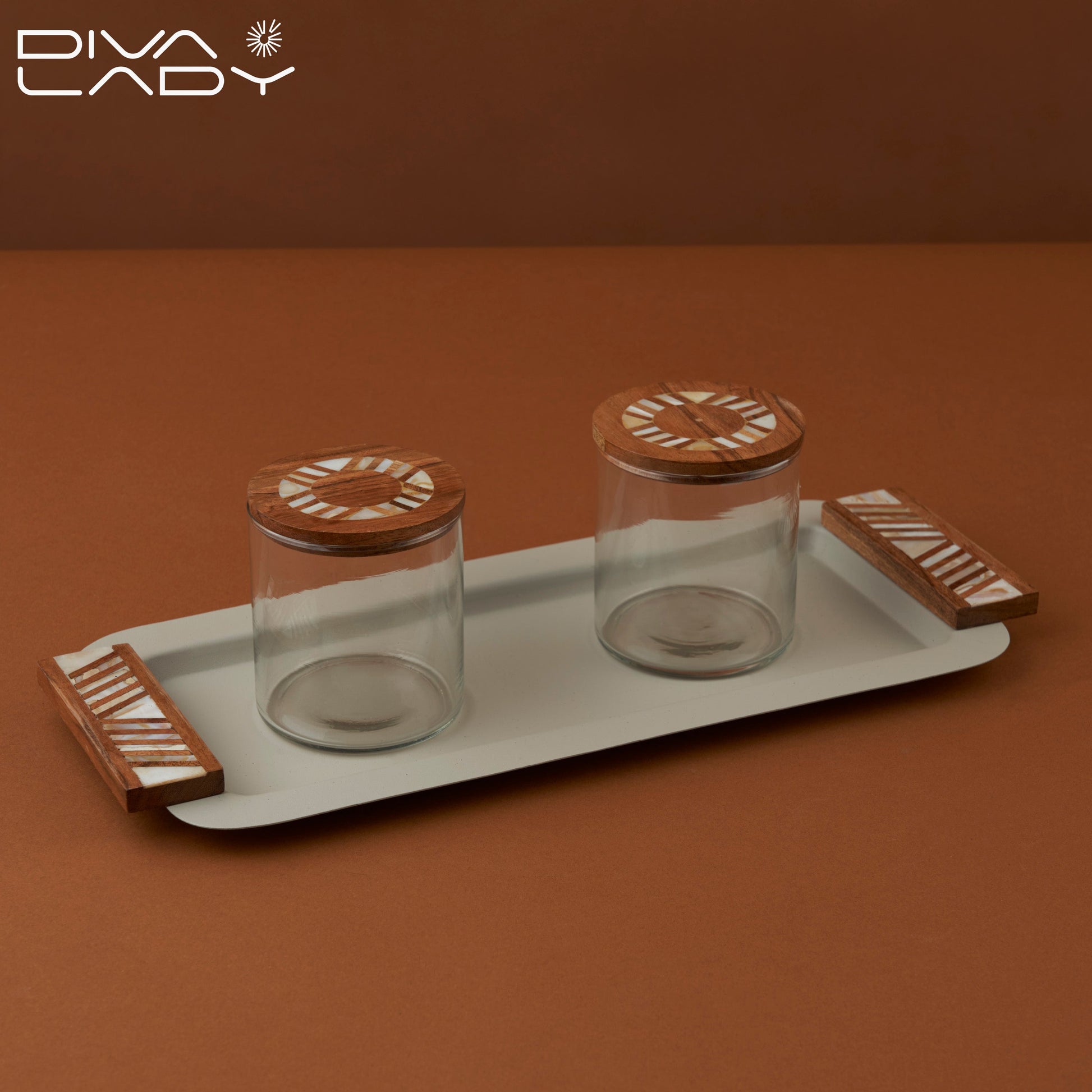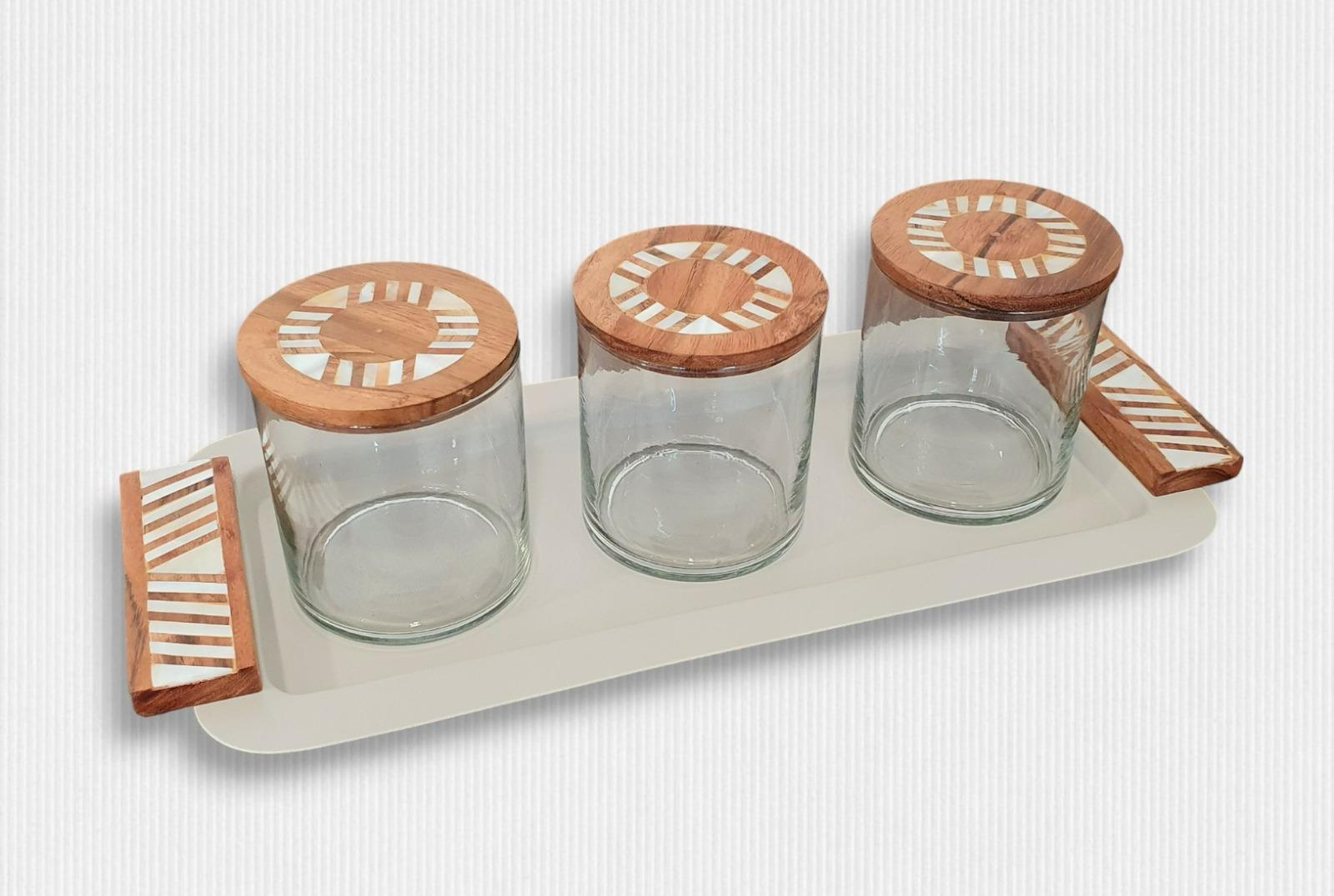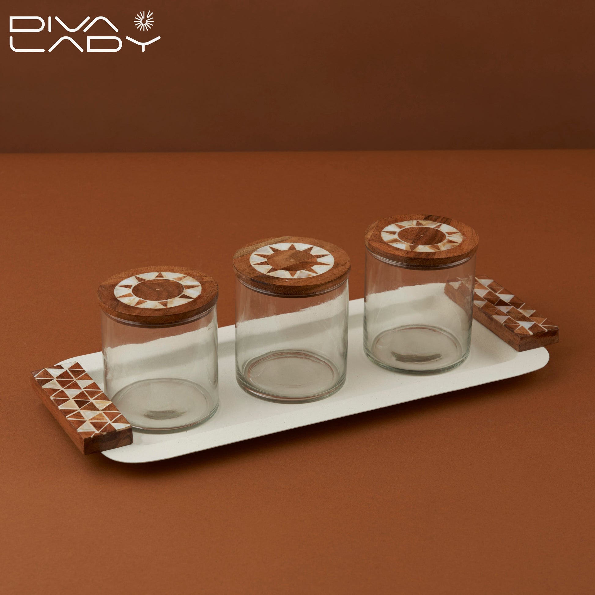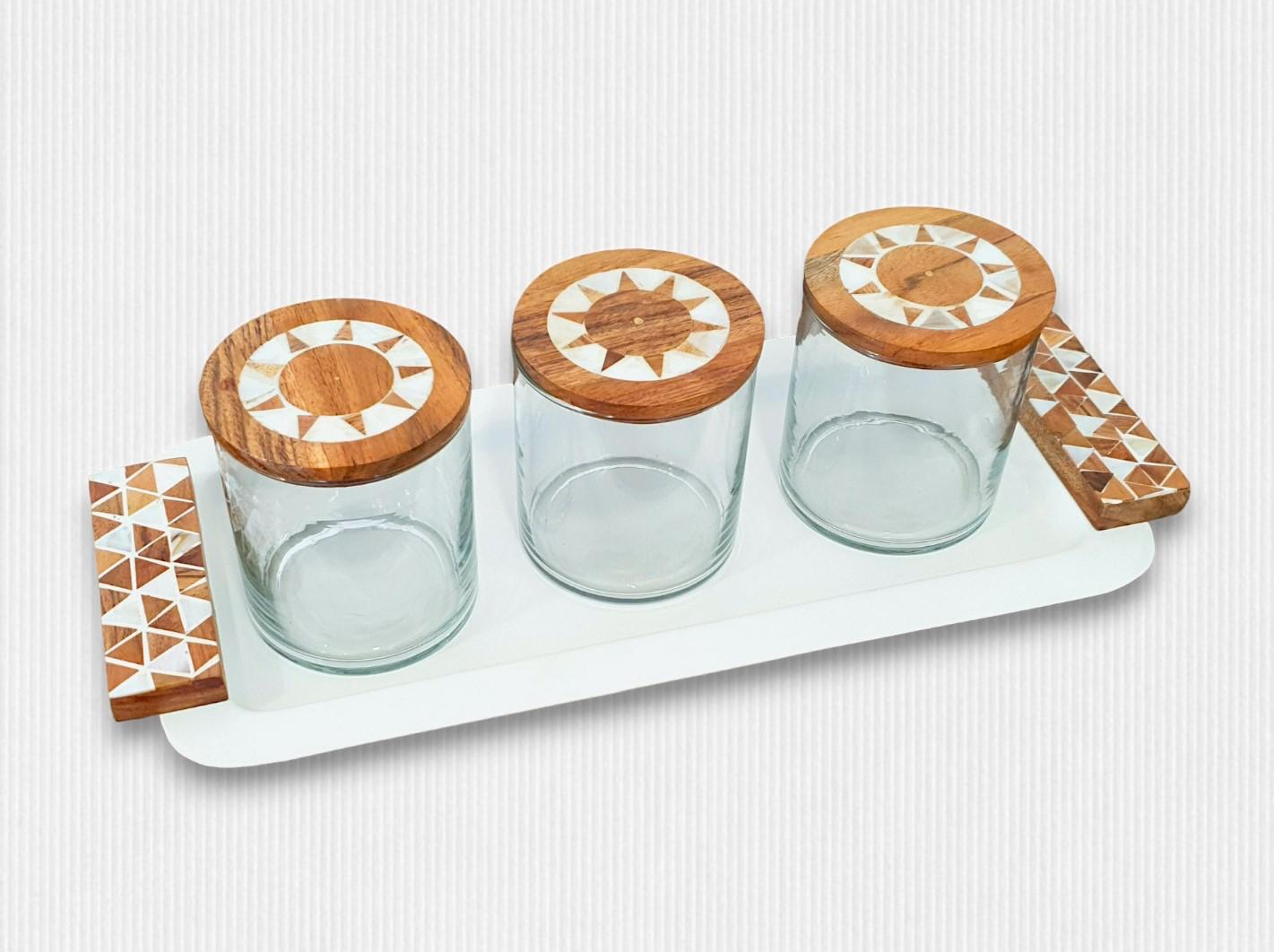مجموعة من ثلاثة أوعية زجاجية شفافة مع أغطية خشبية
