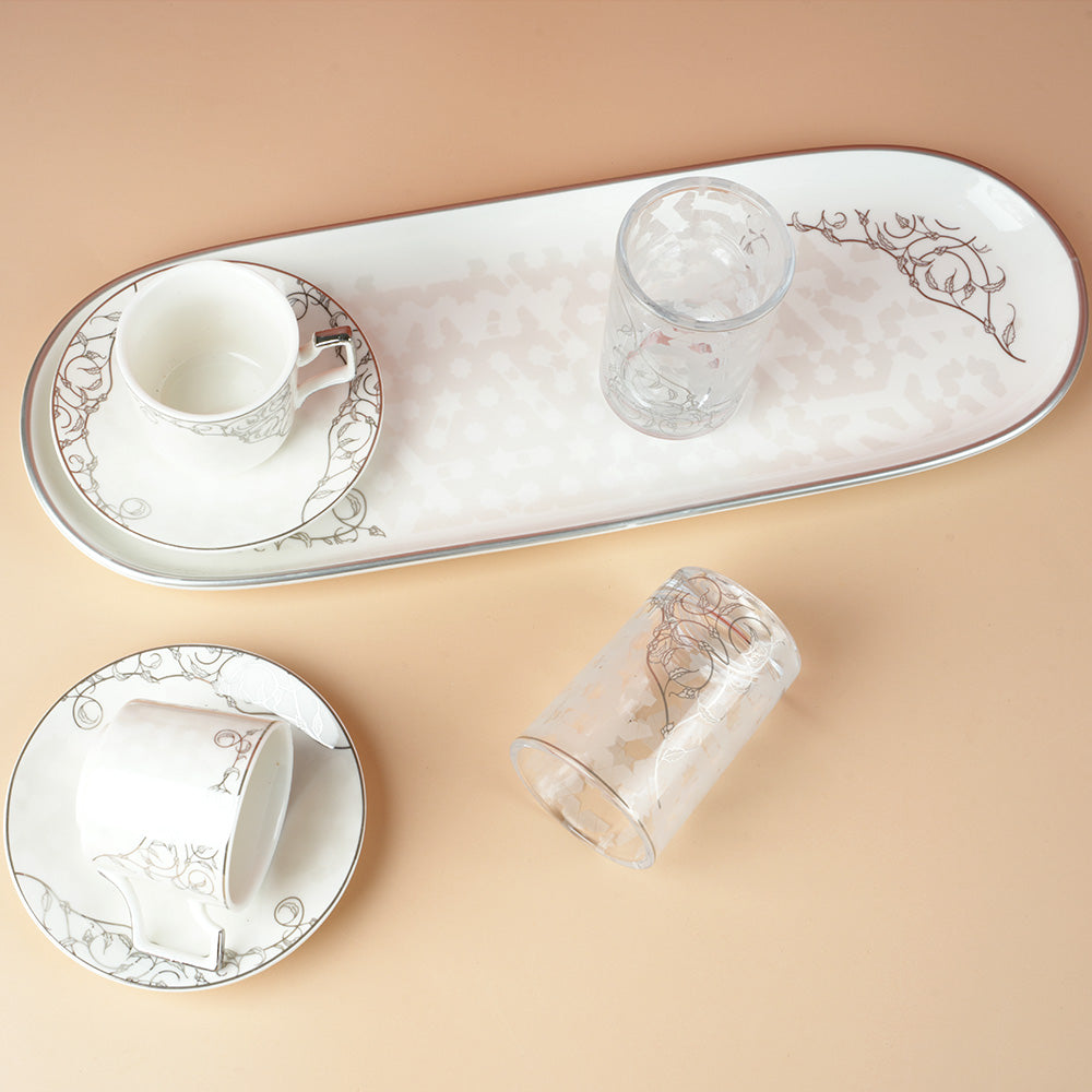 قدّمي الشاي والماء بأناقة مع طقم الشاي والماء الرائع هذا. يتكون من فنجاني شاي من البورسلين بتصميم متقن مع صحنين متناسقين، وكوبين زجاجيين شفافين منقوشين، جميعها مرتبة بأناقة على صينية تقديم بيضاوية أنيقة. مثالي لاستضافة الضيوف أو لإضافة لمسة من الرقي إلى وقت الشاي اليومي. مثالي للمنازل التقليدية والحديثة على حد سواء.