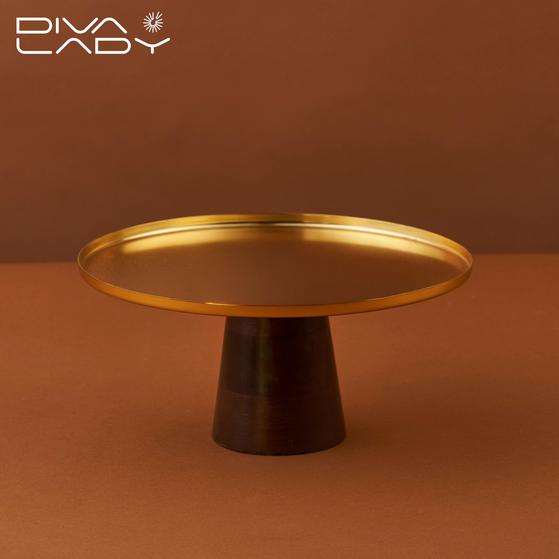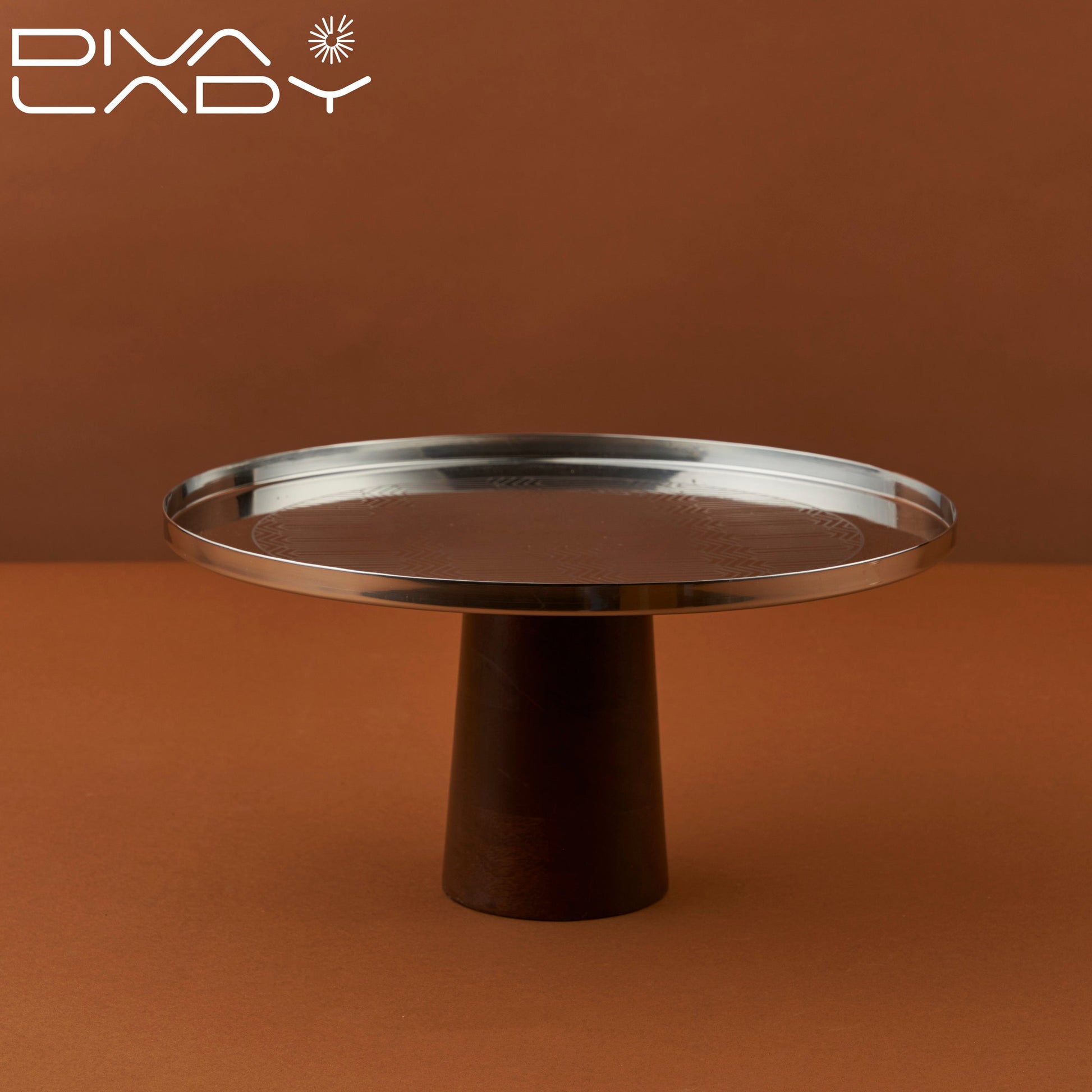 وعاء تقديم كيك بقاعدة خشب . الوعاء مصنوع من الاستاليس استيل الامع يستخدم هذا الوعاء لاغرض زخرفية او عملية مزود بقاعدة خشبية سهل التنظيف
