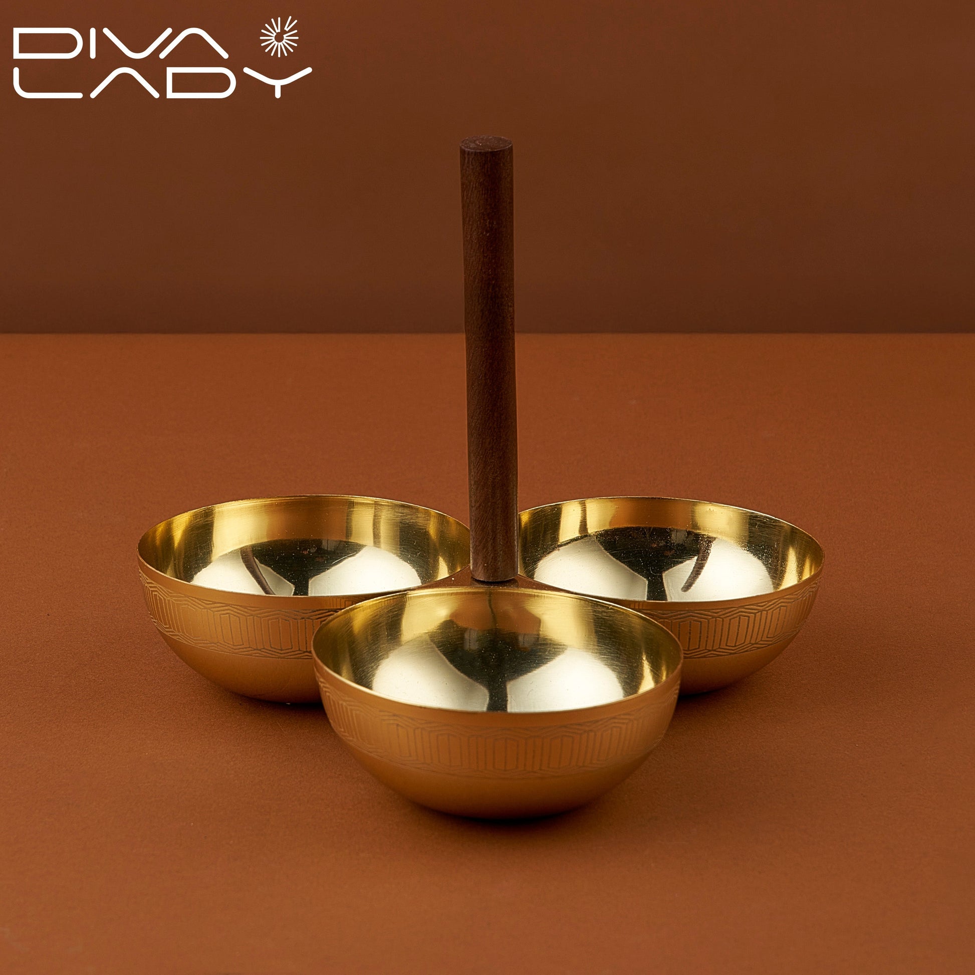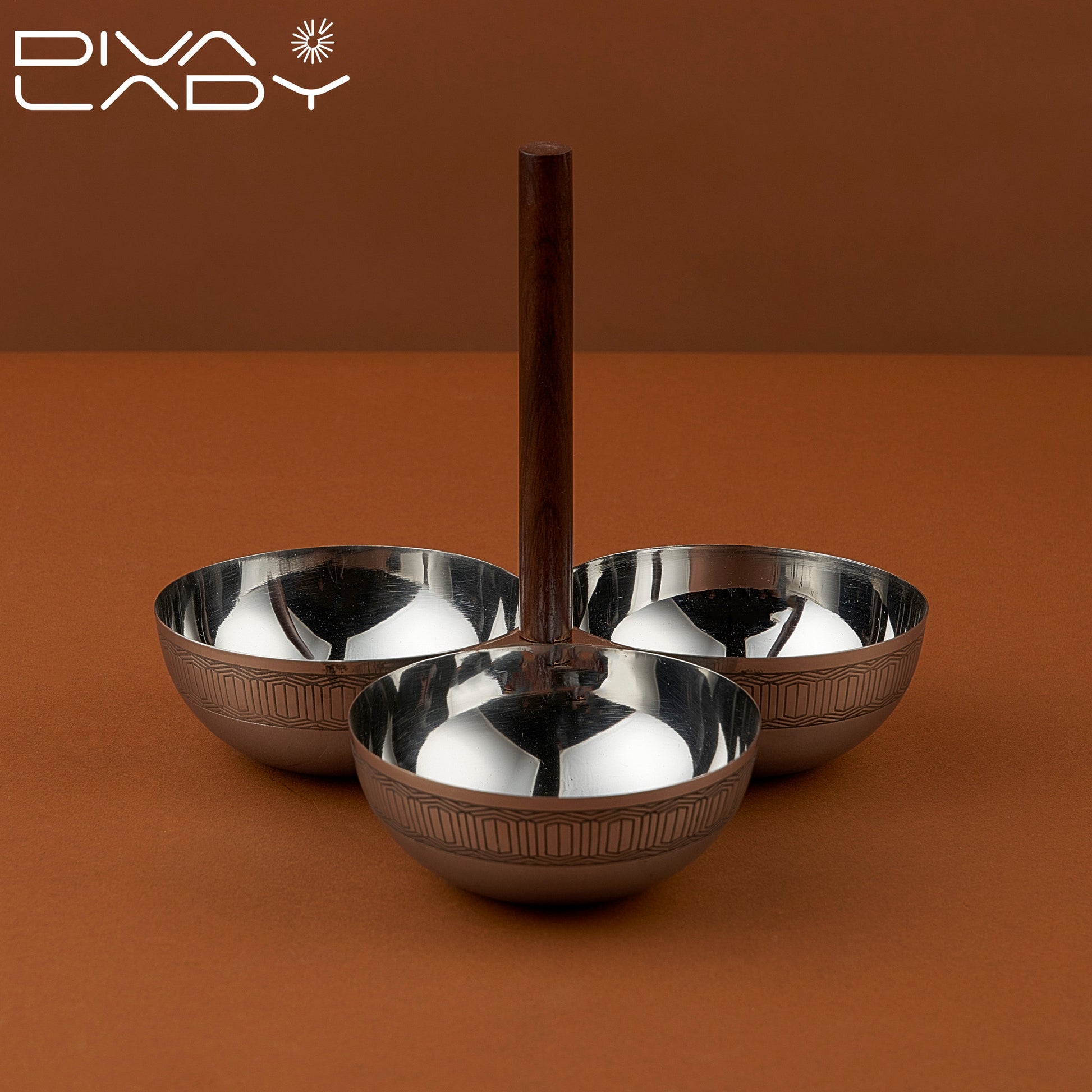 وعاء ثلاثى حامل خشبى يتكون من ثلاث اوعية صغيرة مستديرة مثبتة على قاعدة خشبية الاوعية مزخرفة بنقوش دقيقة تعطيها مظهرا كلاسيكيا