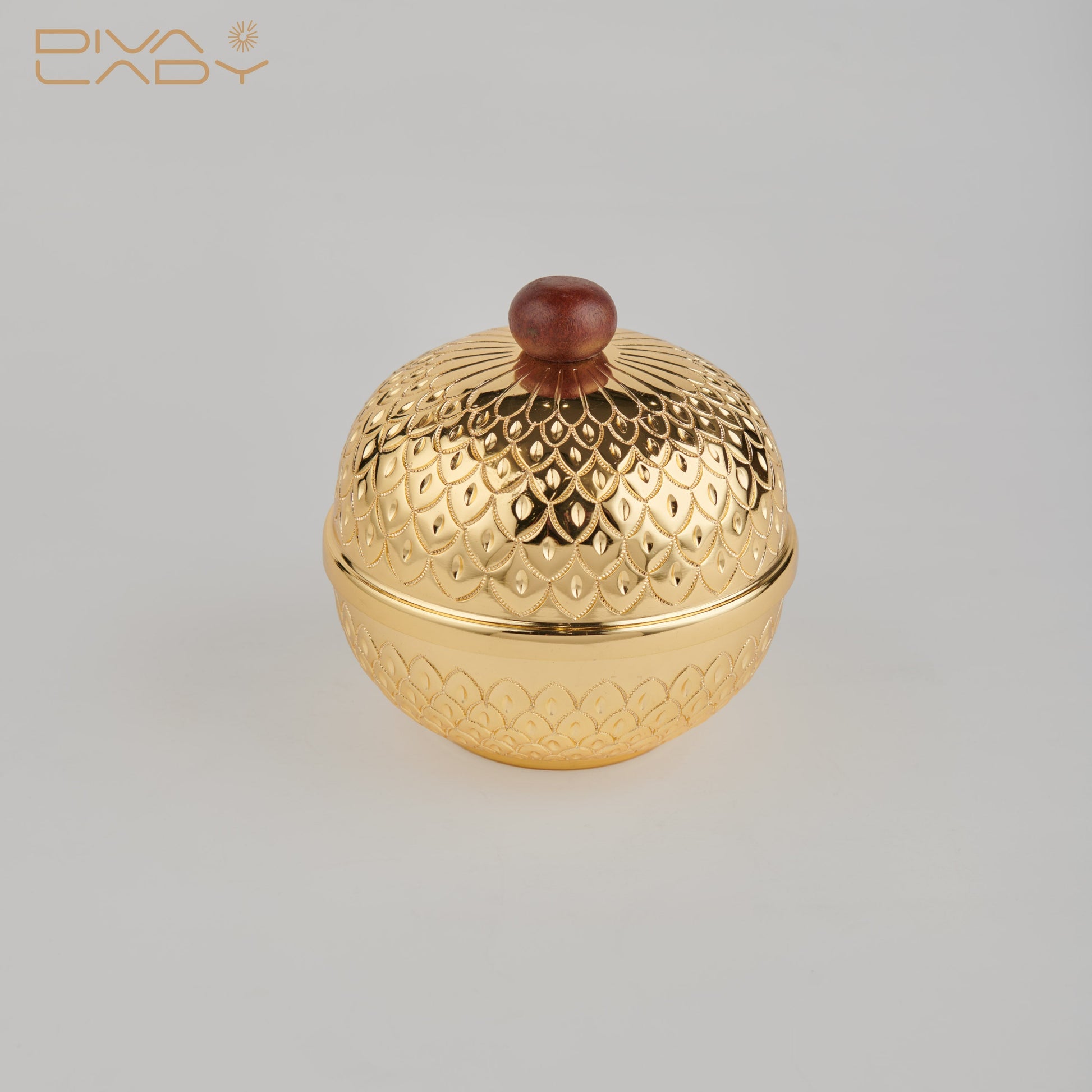 أضف لمسة من الفخامة العربية إلى مائدتك مع هذا الطقم الذهبي الفاخر المكون من ثلاث تمرّيات بأحجام مختلفة. يتميز بتصميم محفور بدقة بنقشة هندسية فاخرة وغطاء مزود بمقبض خشبي يعزز الطابع الكلاسيكي.