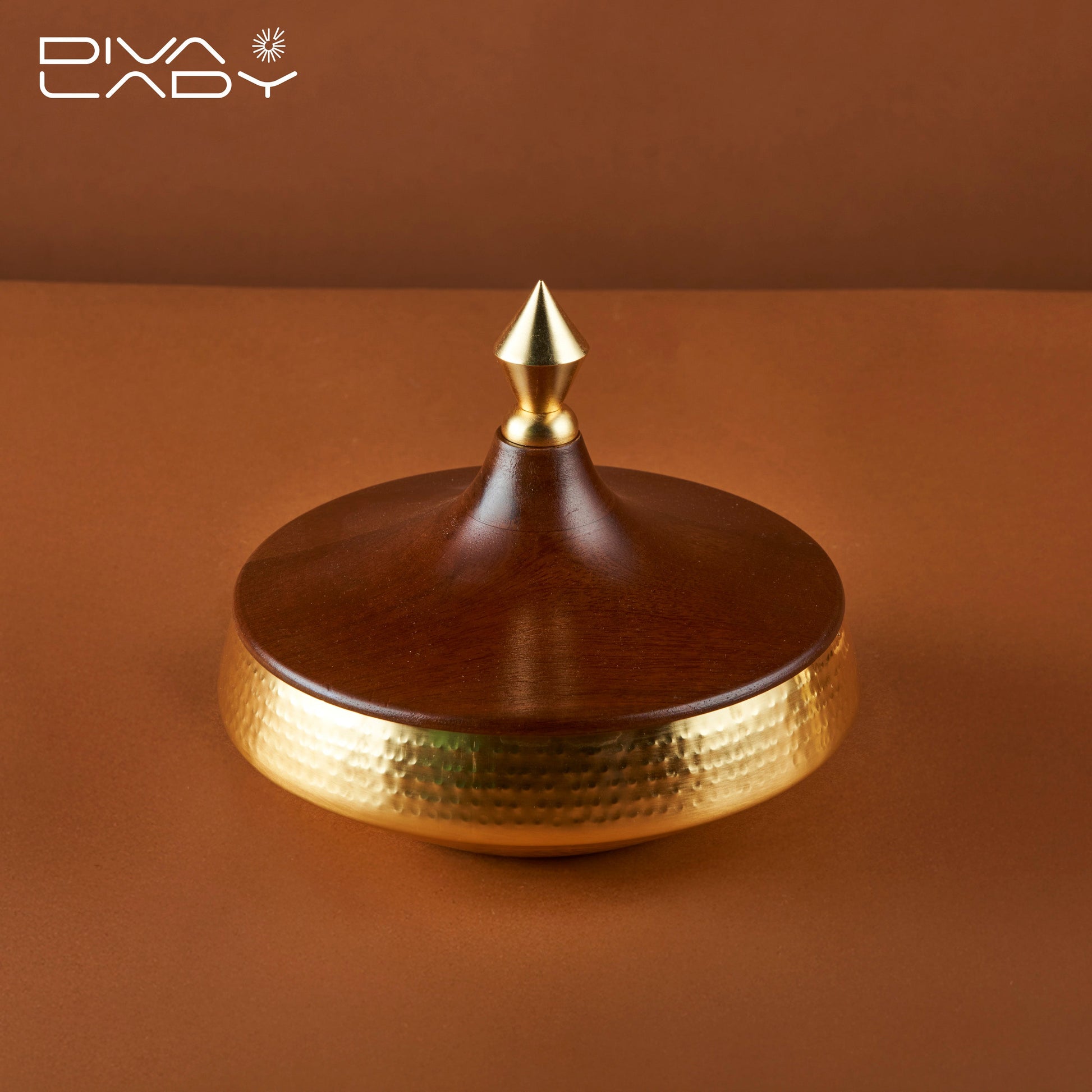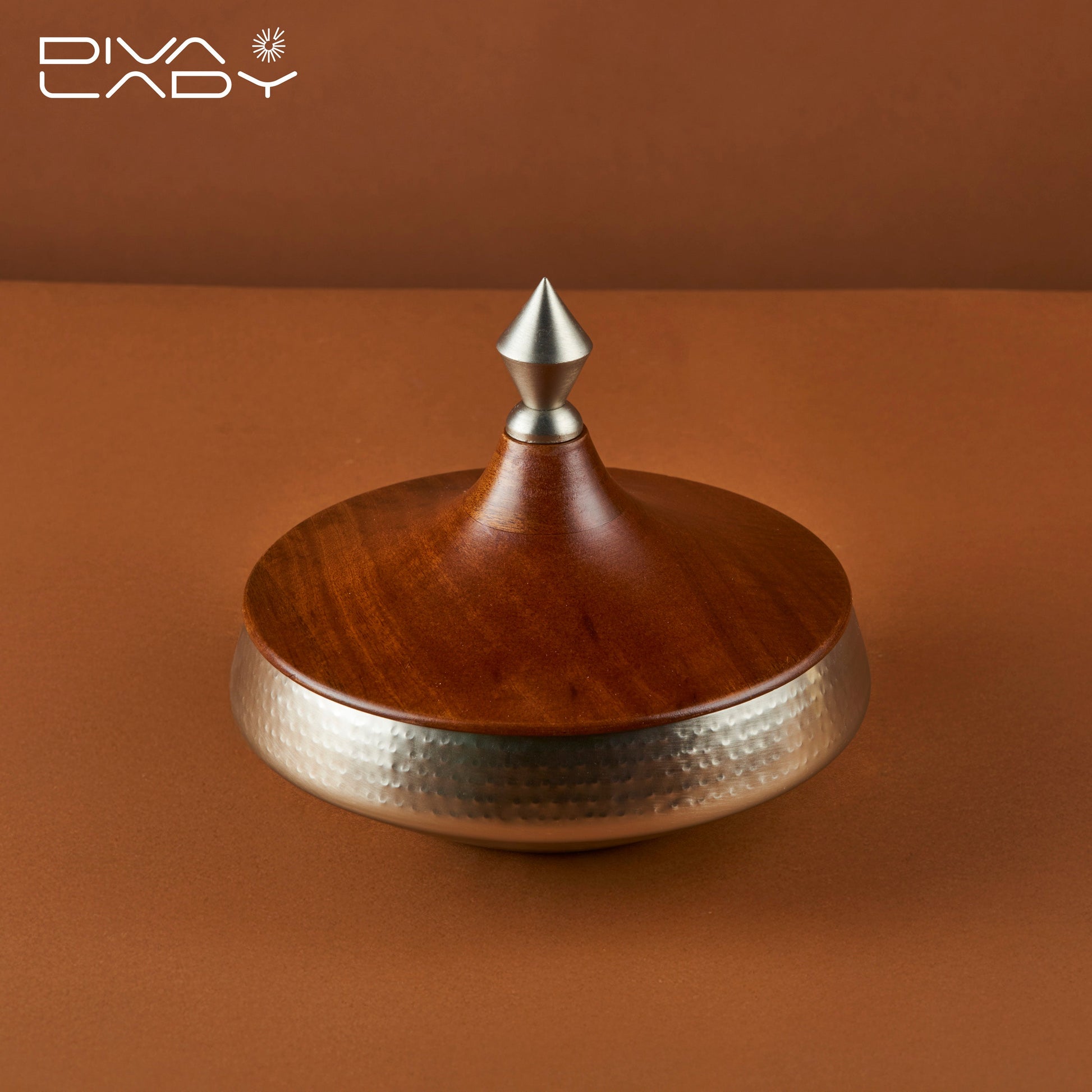 وعاء لتخزين التمر . يتميز بتصميم أنيق وعصري، الغطاء مزود بقبضة معدنية تضيف لمسة من الفخامة.