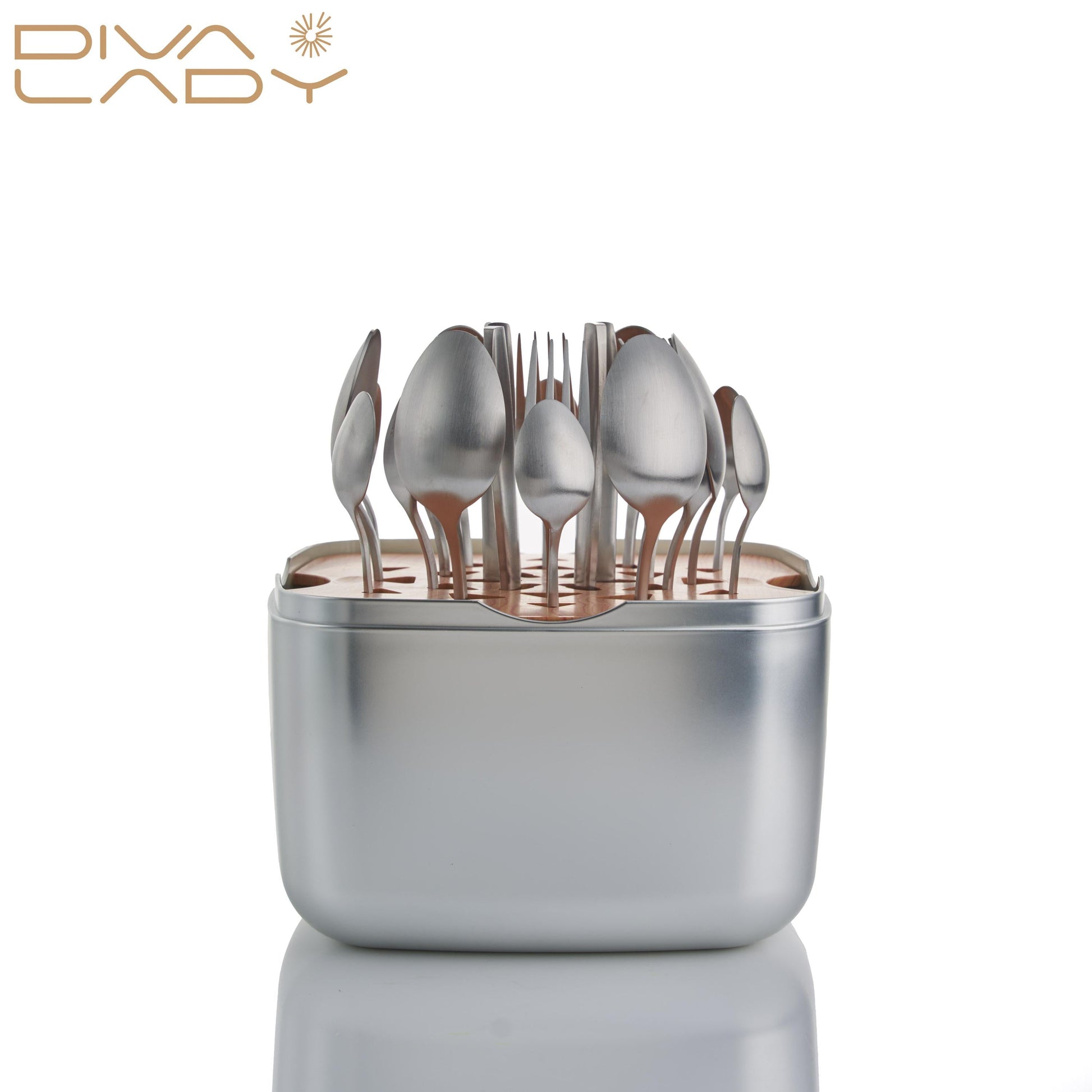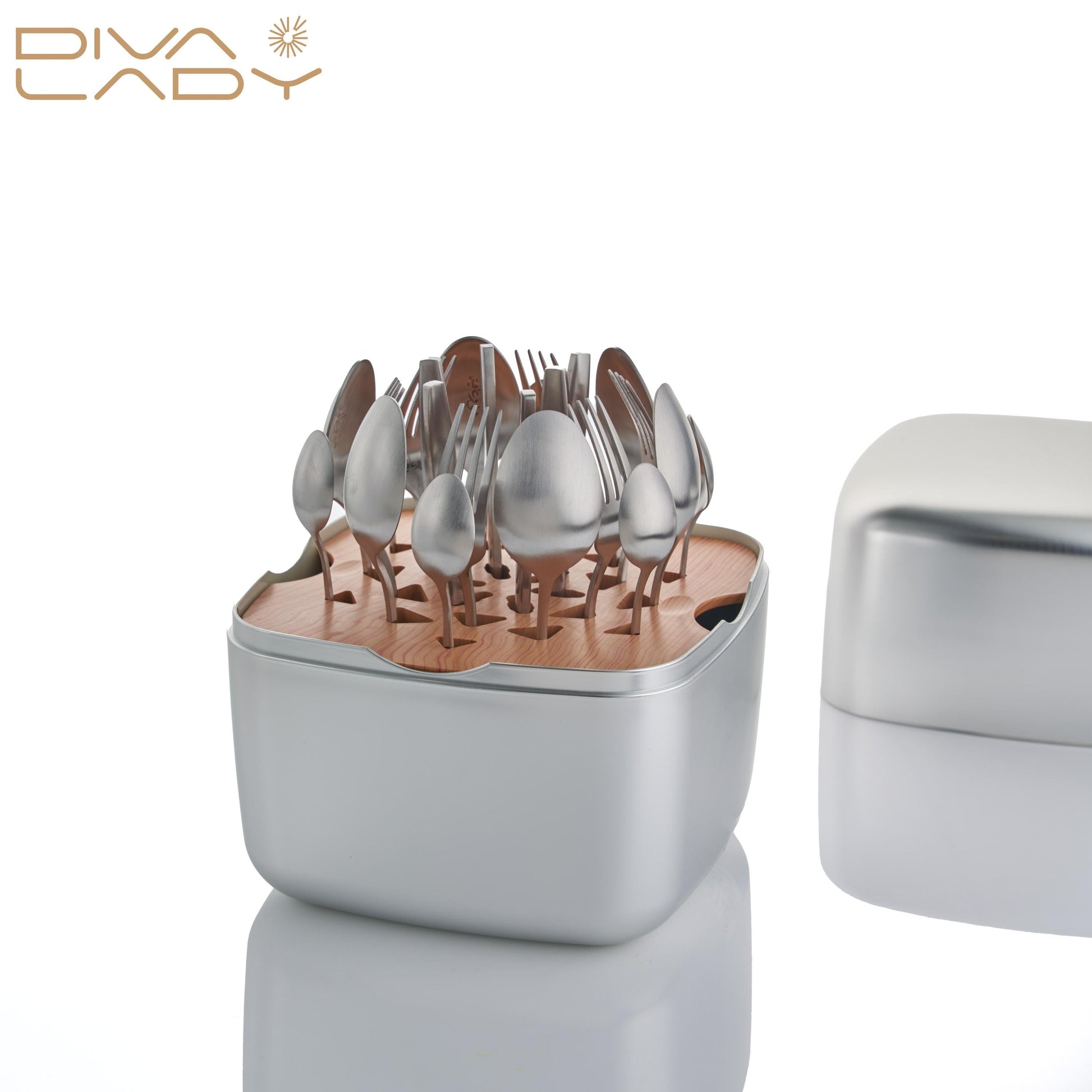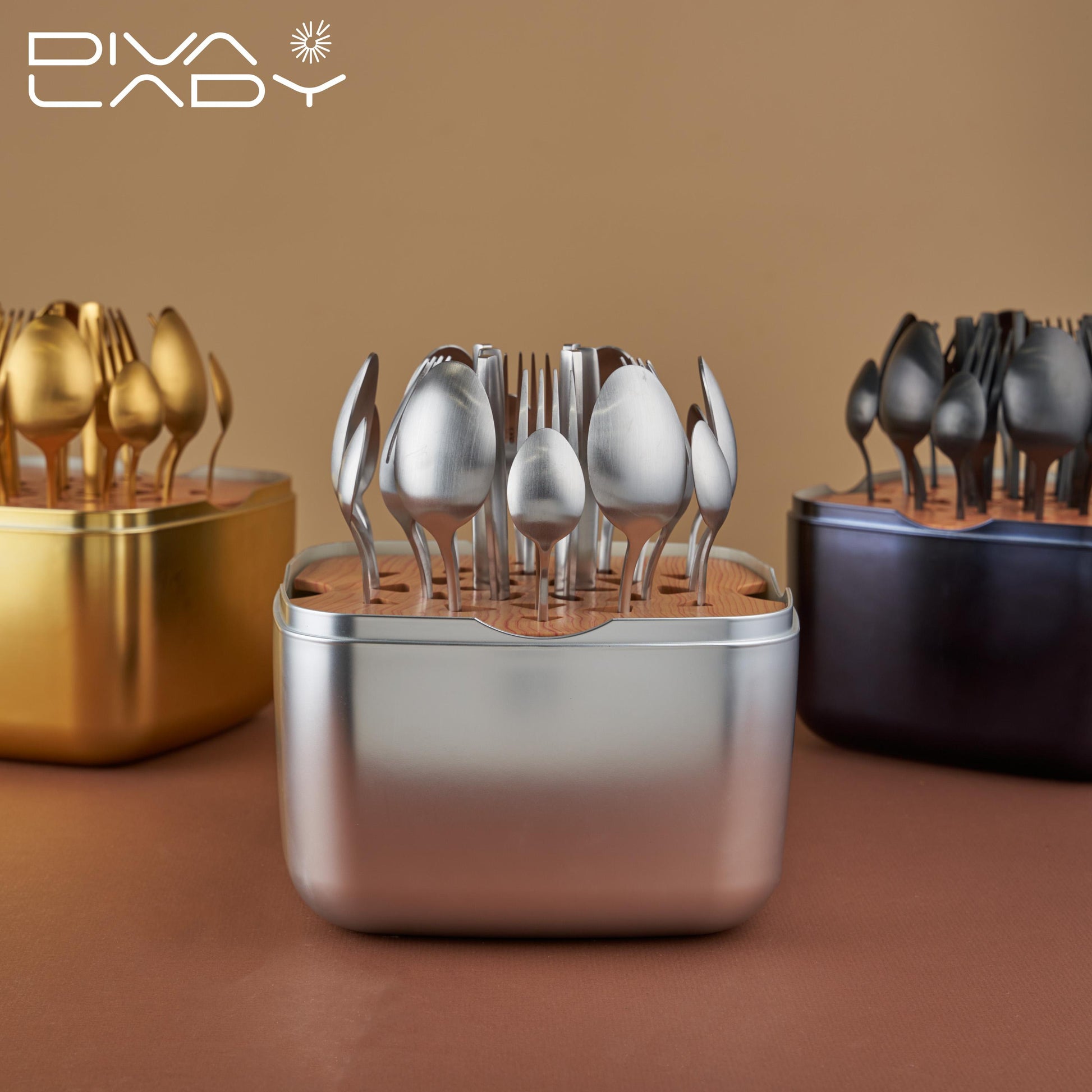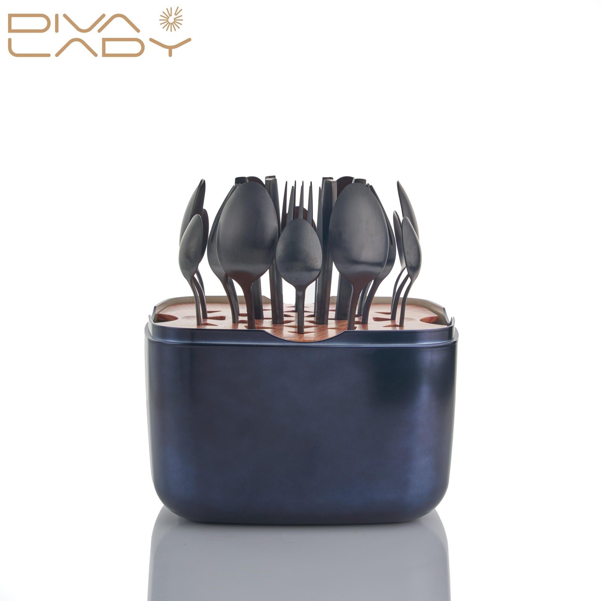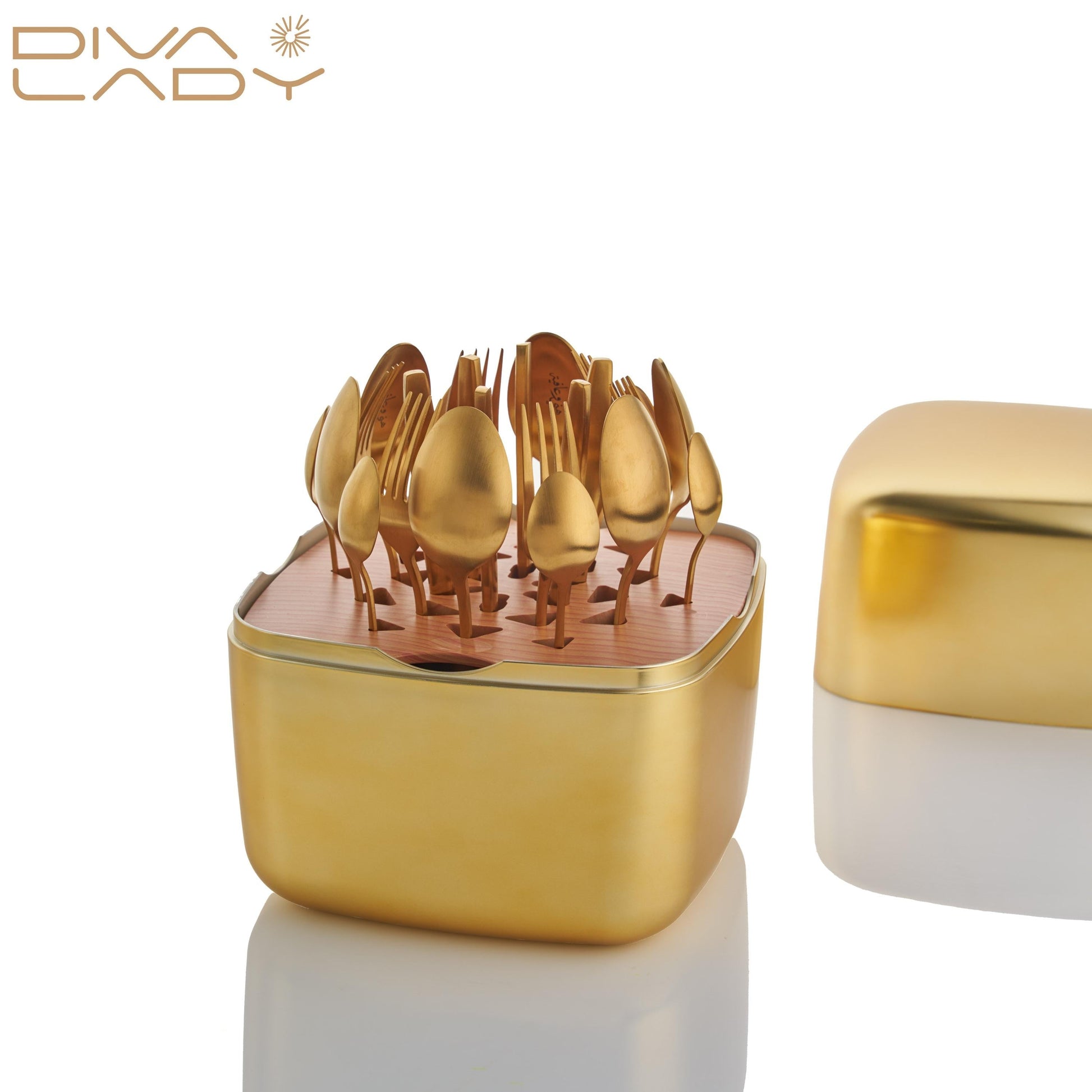 طقم أدوات مائدة فاخر – 24 قطعة مع قاعدة خشبية وصندوق معدني أنيق
