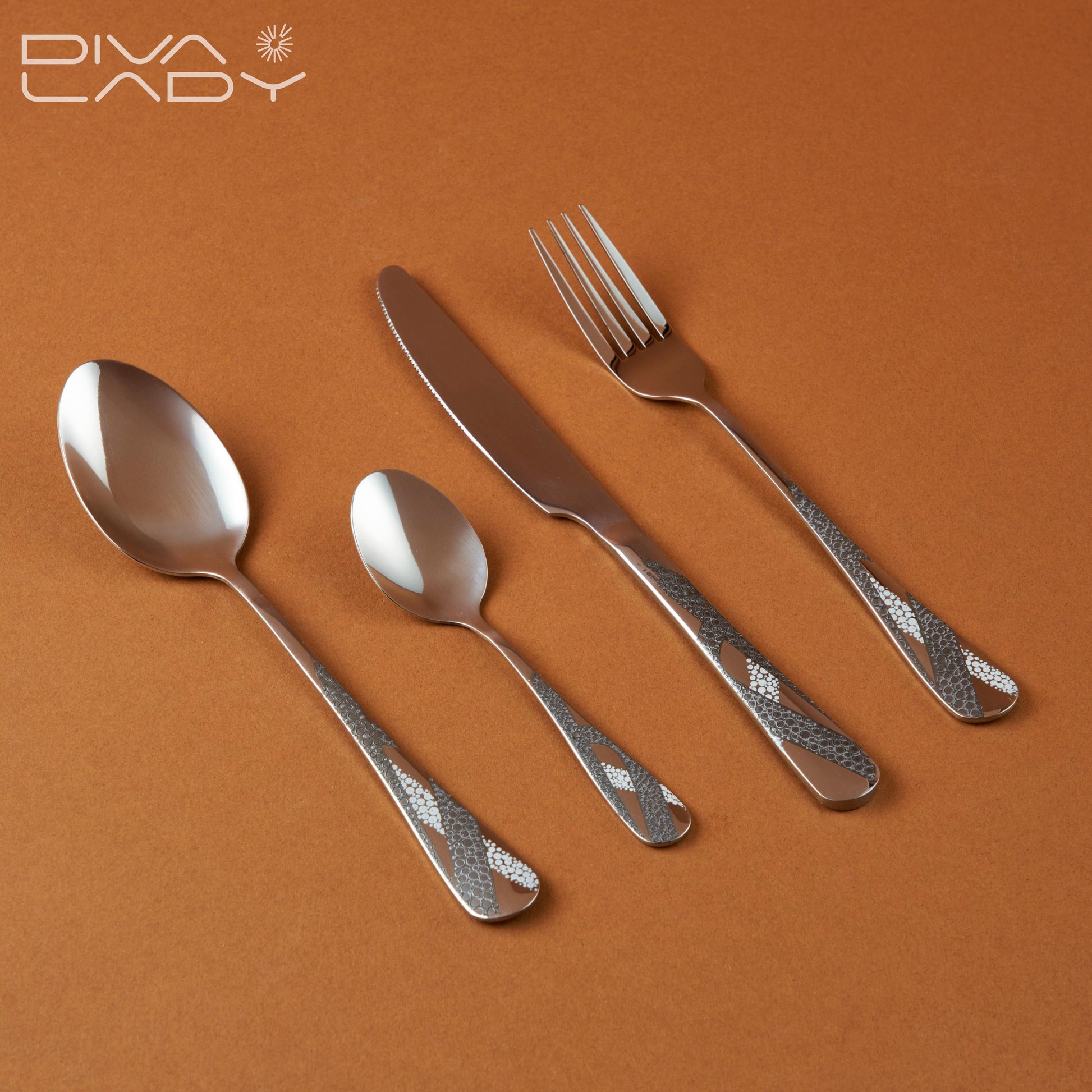 جهّزي طاولة سفرتكِ بكل أناقة باعتماد طقم أدوات المائدة الفاخر هذا يضم 24 قطعة بما في ذلك ملاعق طاولة، ملاعق شاي، شوك وسكاكين