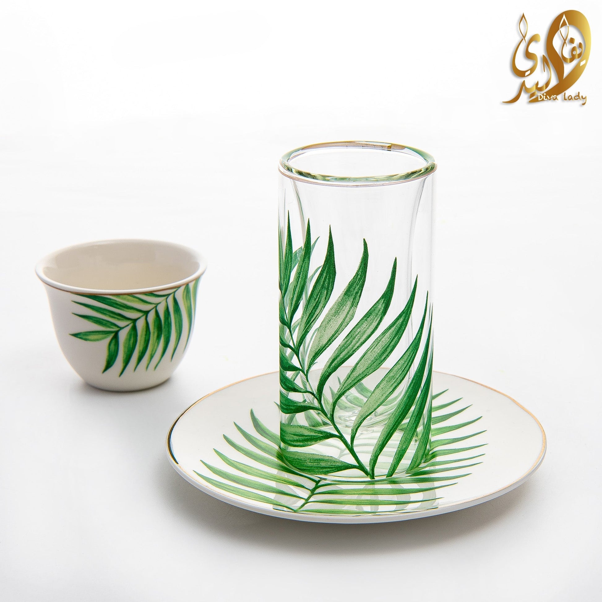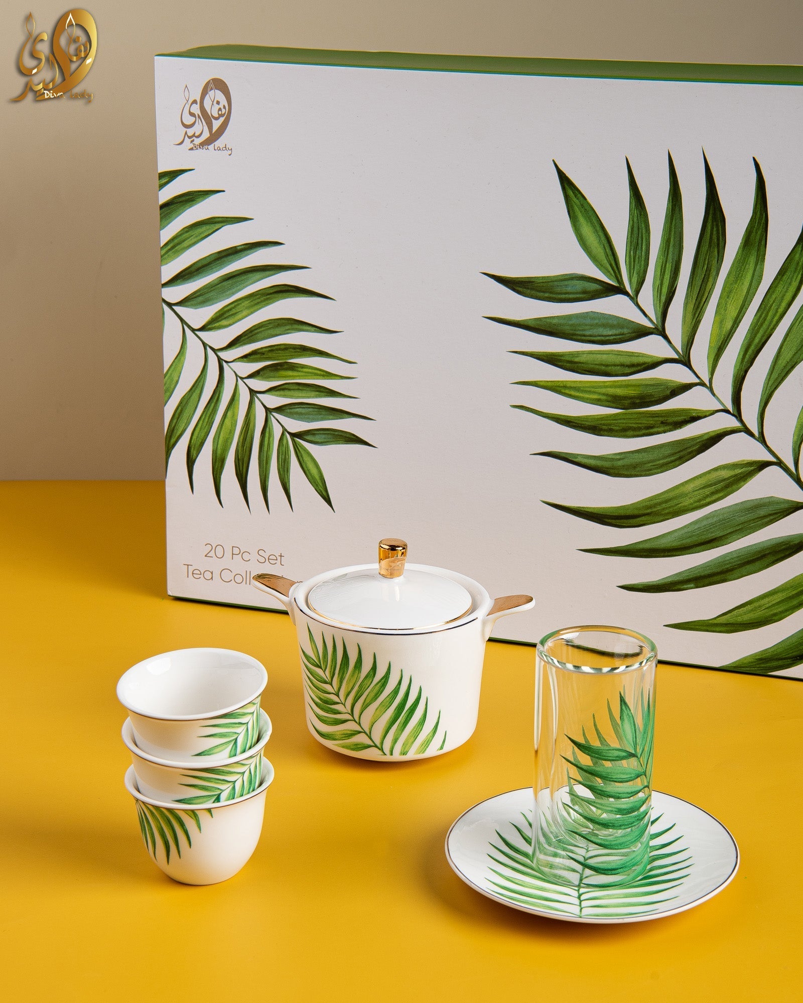 استمتع بأوقات الشاي مع طقم الشاي الفاخر المكوّن من 19 قطعة، بتصميم مستوحى من الطبيعة بنقشة أوراق خضراء تضيف لمسة انتعاش وأناقة إلى طاولتك.