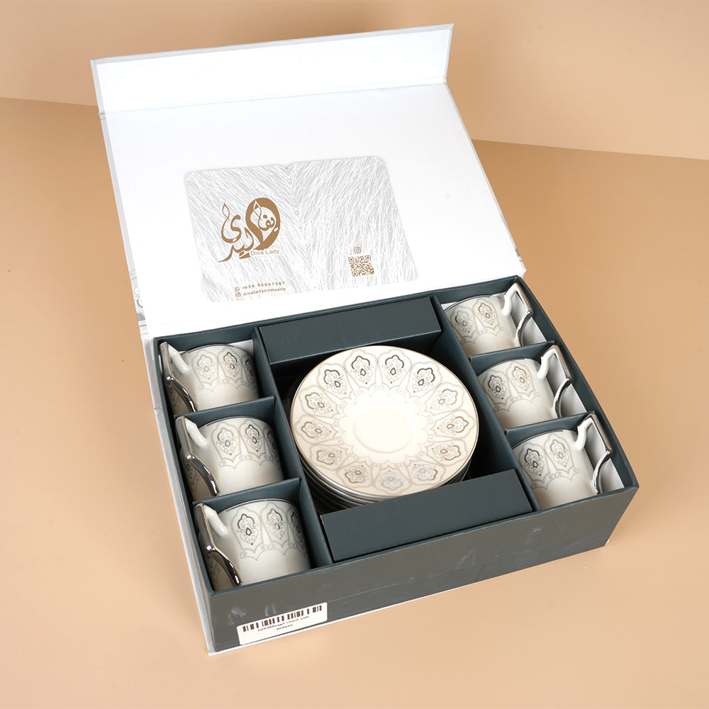 طقم فناجين قهوة أنيق يأتي بتصميم فاخر يعكس روح الضيافة العربية. يحتوي على ستة فناجين مزخرفة بنقوش كلاسيكية جذابة مع ستة صحون متناسقة، معبأ بعناية داخل علبة هدايا فاخرة مثالية للتقديم أو الإهداء. جودة عالية وتفاصيل دقيقة تضيف لمسة من الفخامة إلى كل مناسبة.