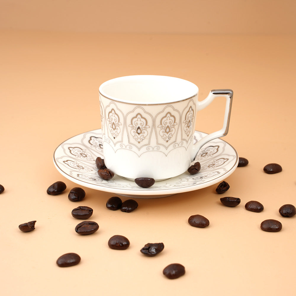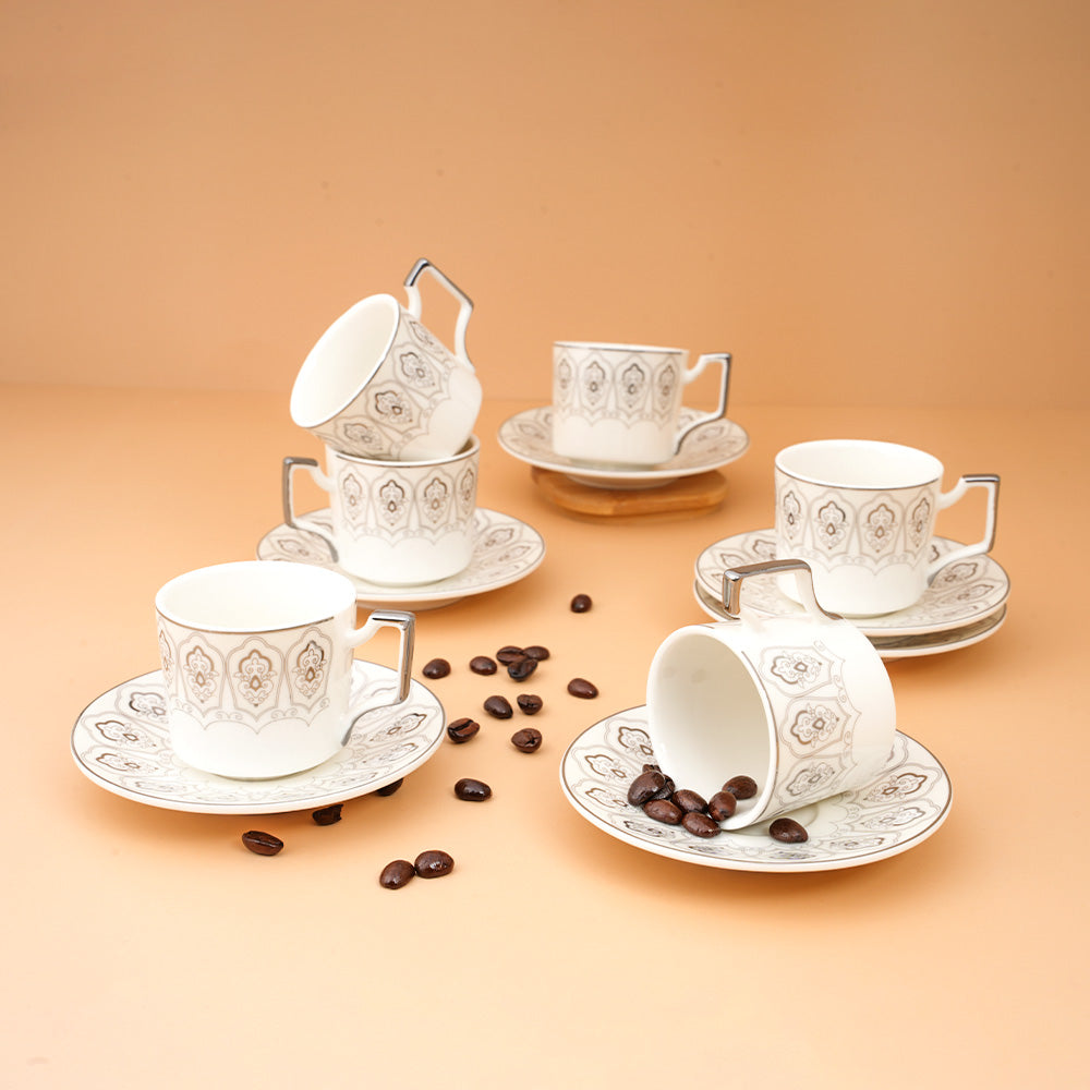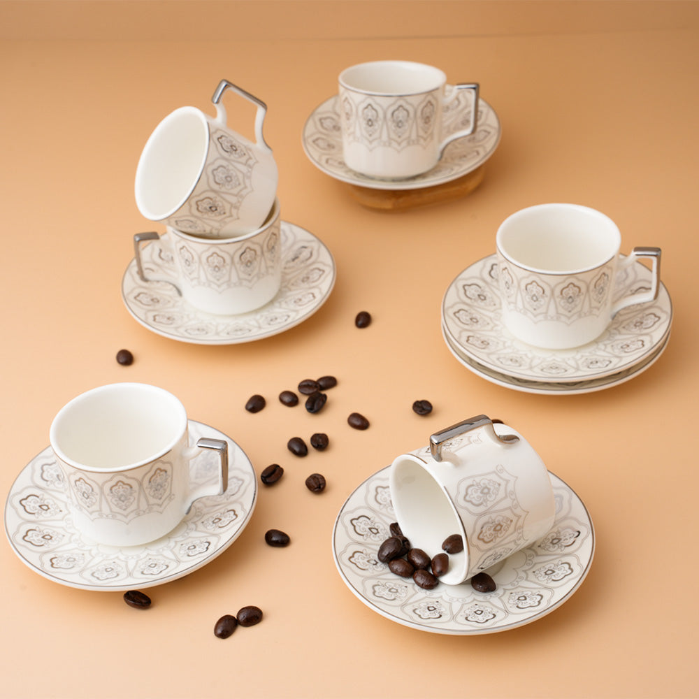 اكتشف طقم فناجين القهوة الفاخر مع صحون مزخرفة، تصميم أنيق مثالي لضيافة مميزة أو كهدية راقية.