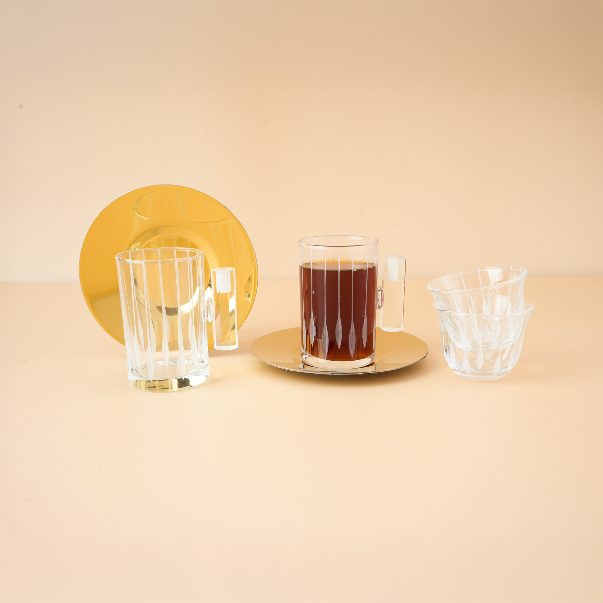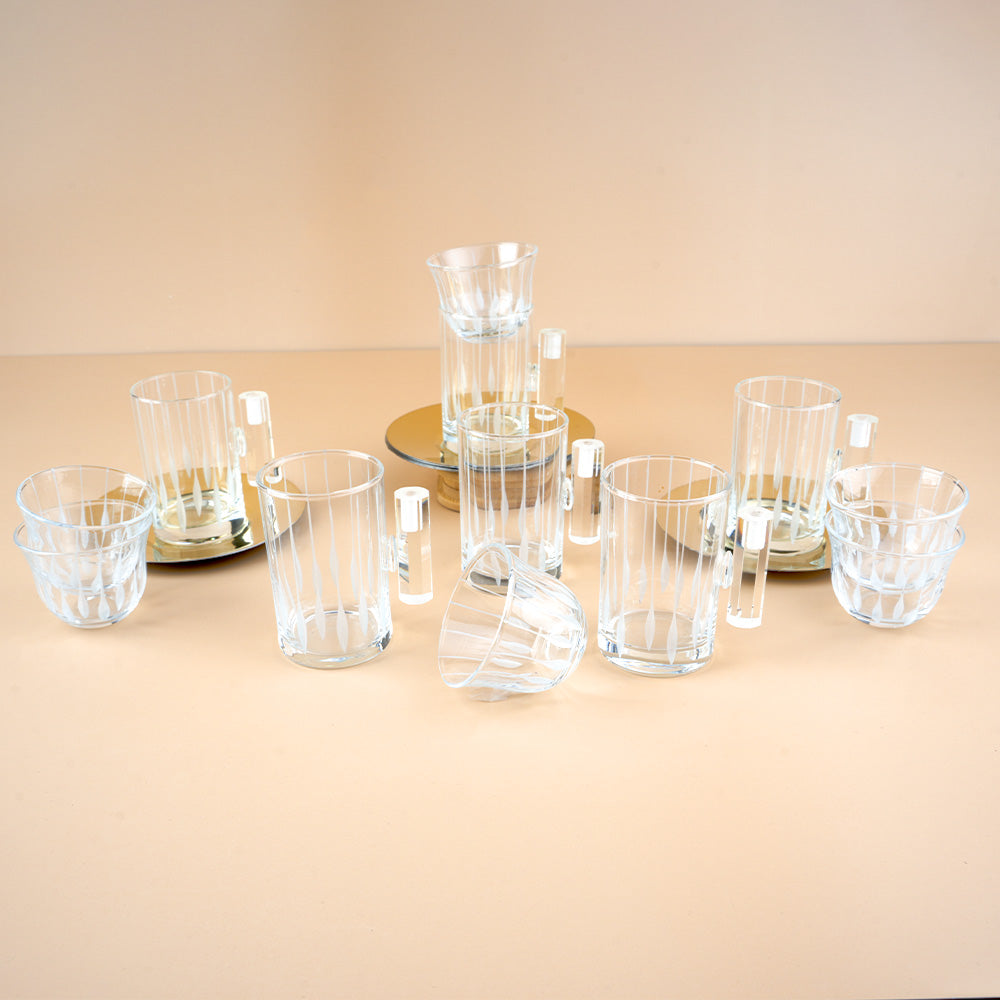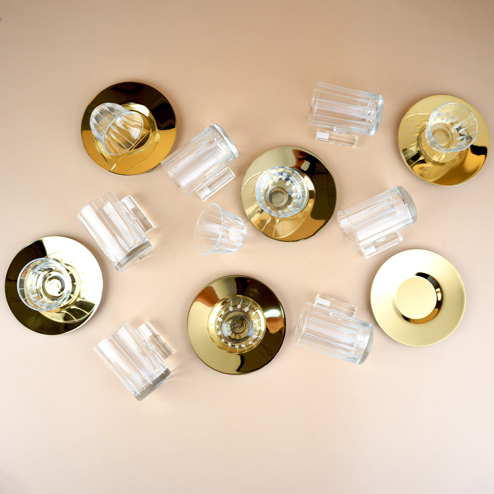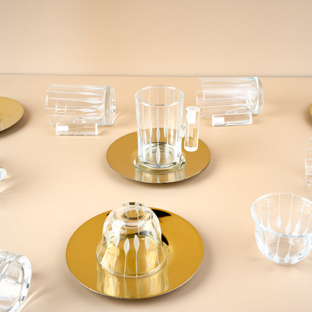 أضف لمسة من الرقي إلى ضيافتك مع طقم الكاسات الفاخر المكون من 18 قطعة بتصميم هندسي عصري جذاب. يحتوي الطقم على تشكيلة متنوعة من الكاسات والأكواب مع مقابض أنيقة تضمن راحة الاستخدام، بالإضافة إلى صحون تقديم دائرية تعكس الذوق الرفيع.