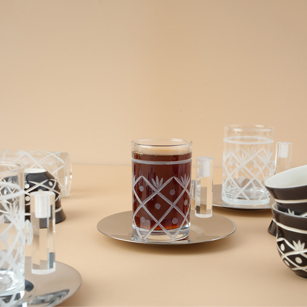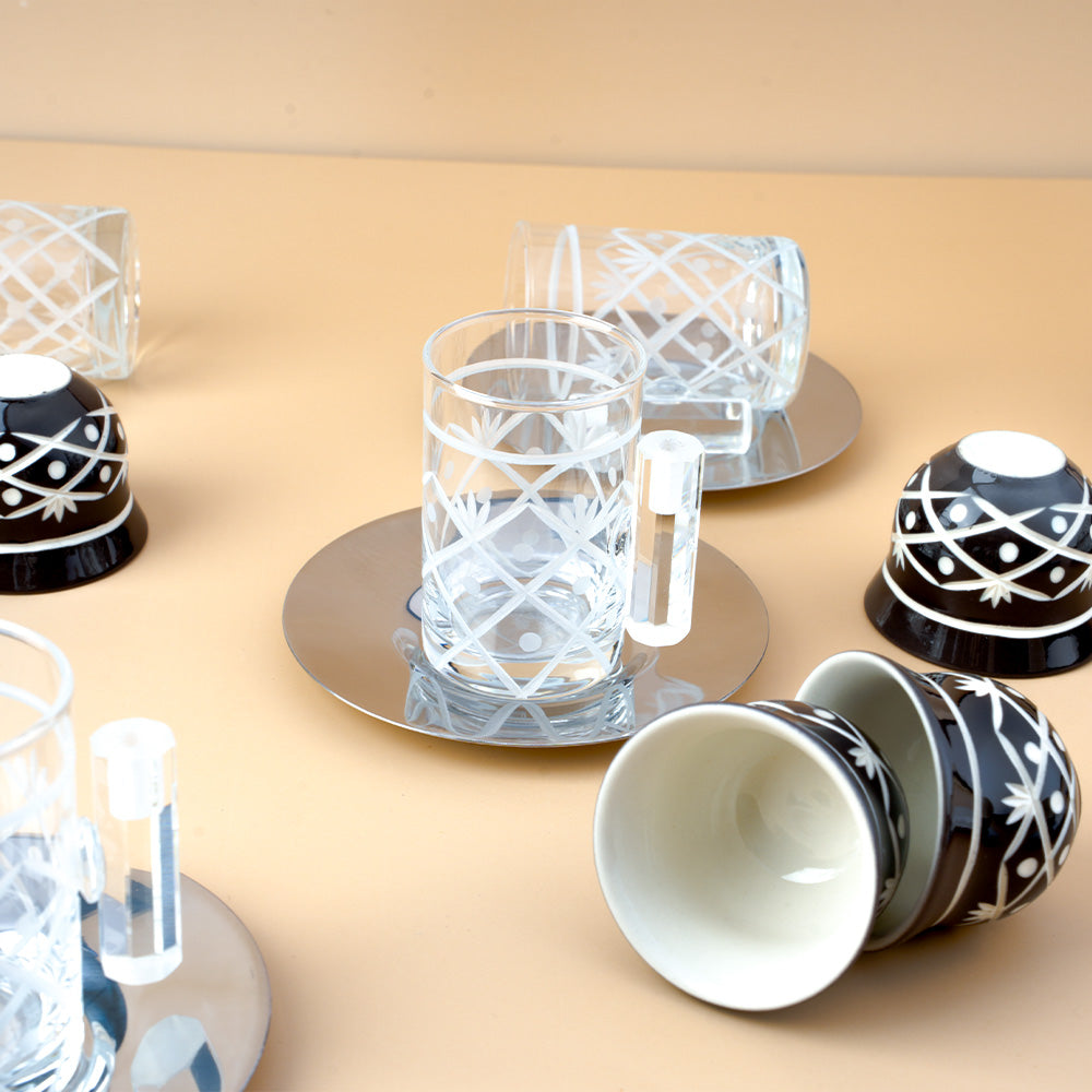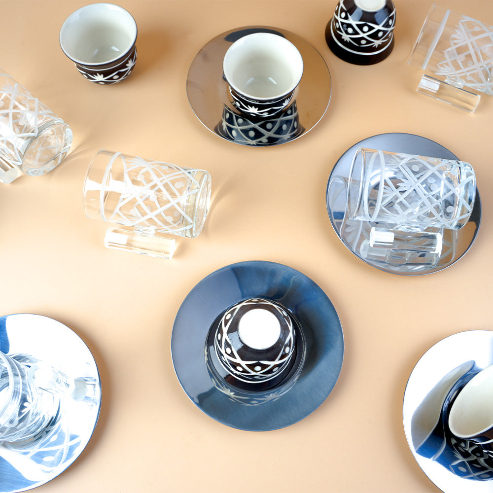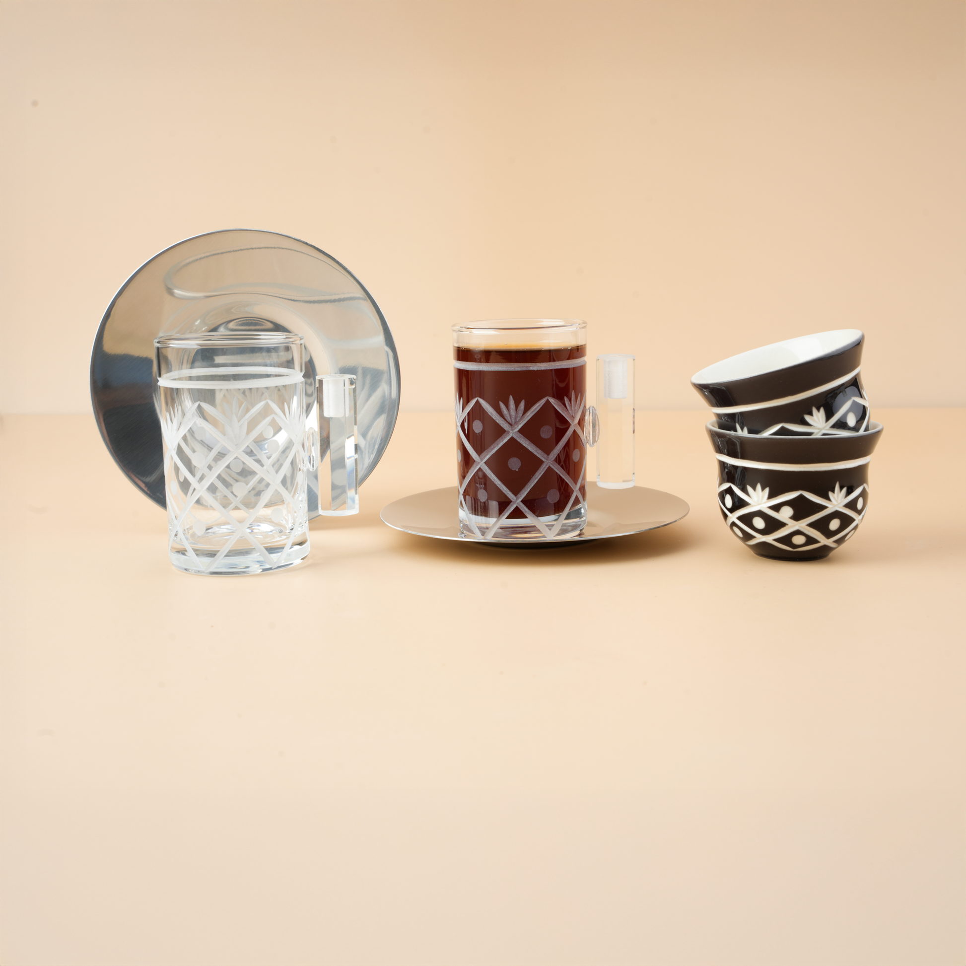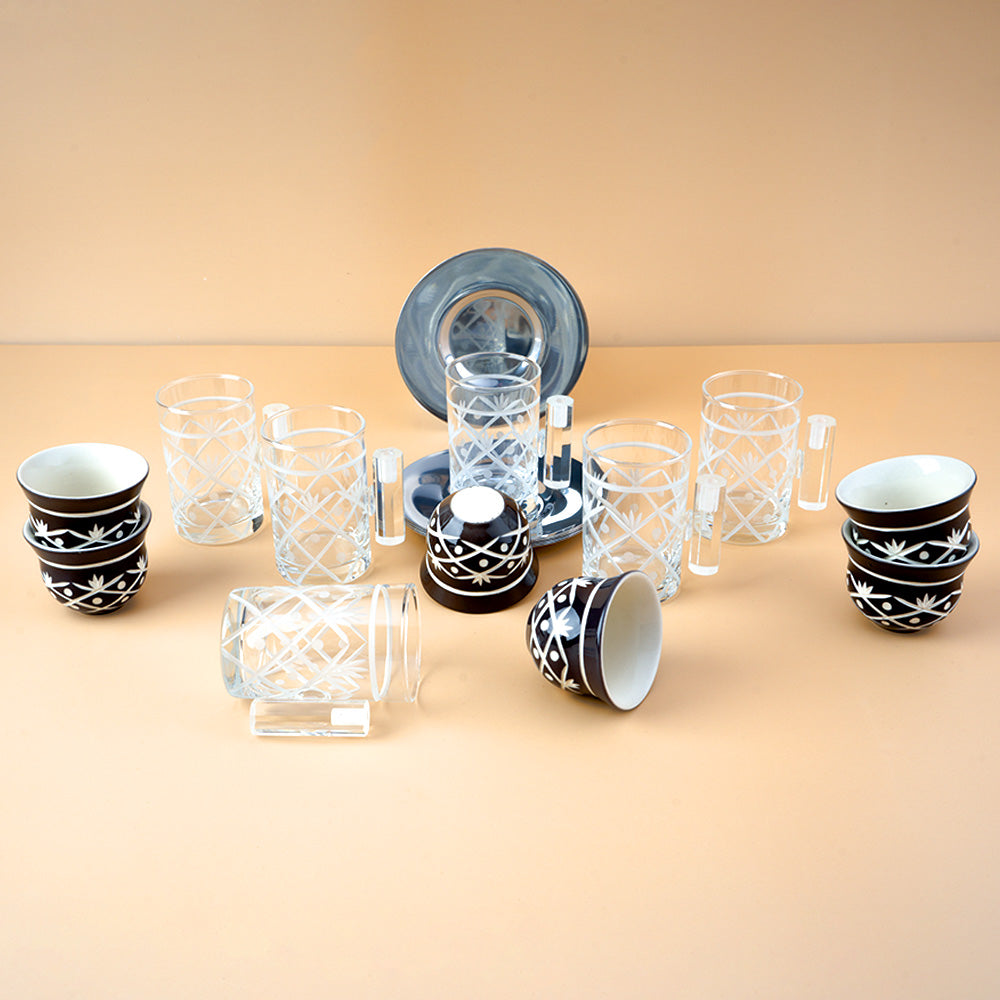 أضف لمسة من الرقي إلى ضيافتك مع طقم الكاسات الفاخر المكون من 18 قطعة بتصميم هندسي عصري جذاب. يحتوي الطقم على تشكيلة متنوعة من الكاسات والأكواب مع مقابض أنيقة تضمن راحة الاستخدام، بالإضافة إلى صحون تقديم دائرية تعكس الذوق الرفيع.