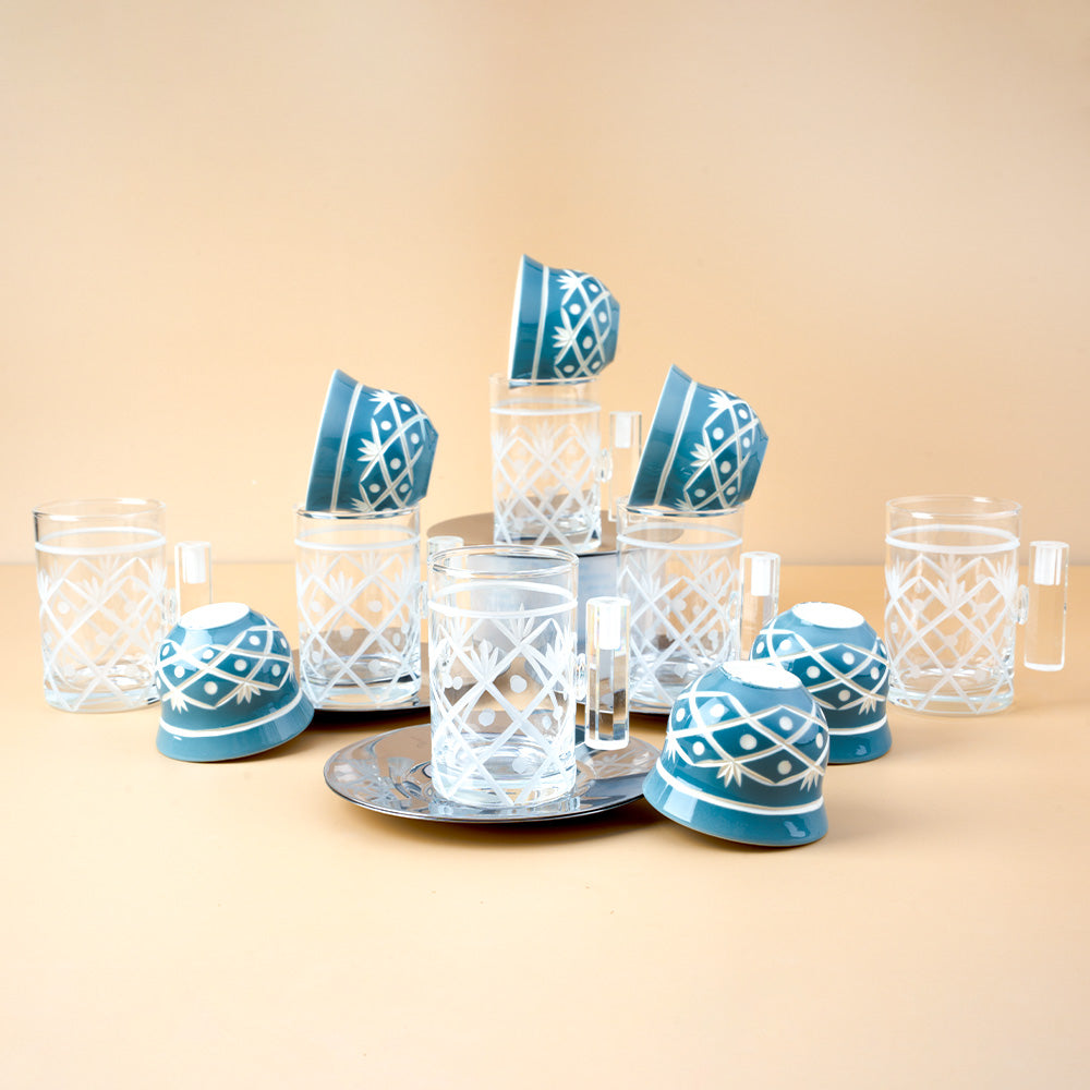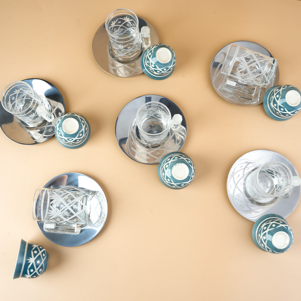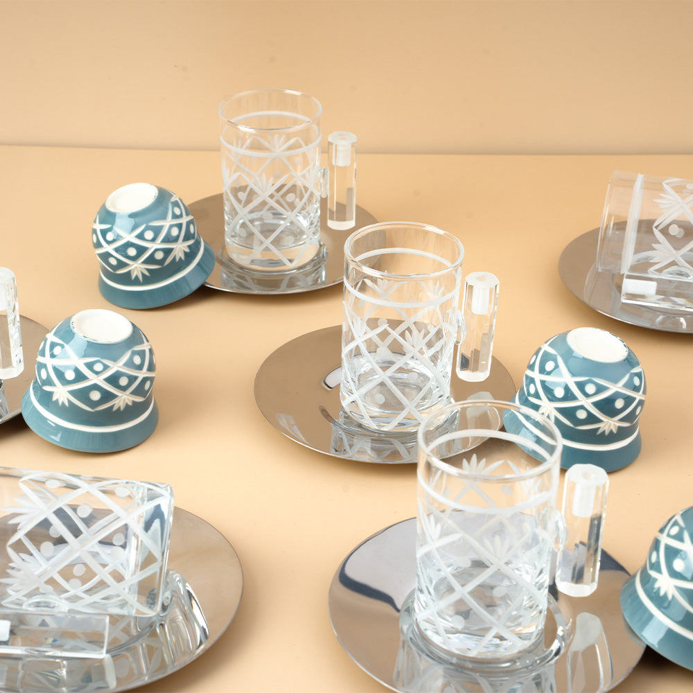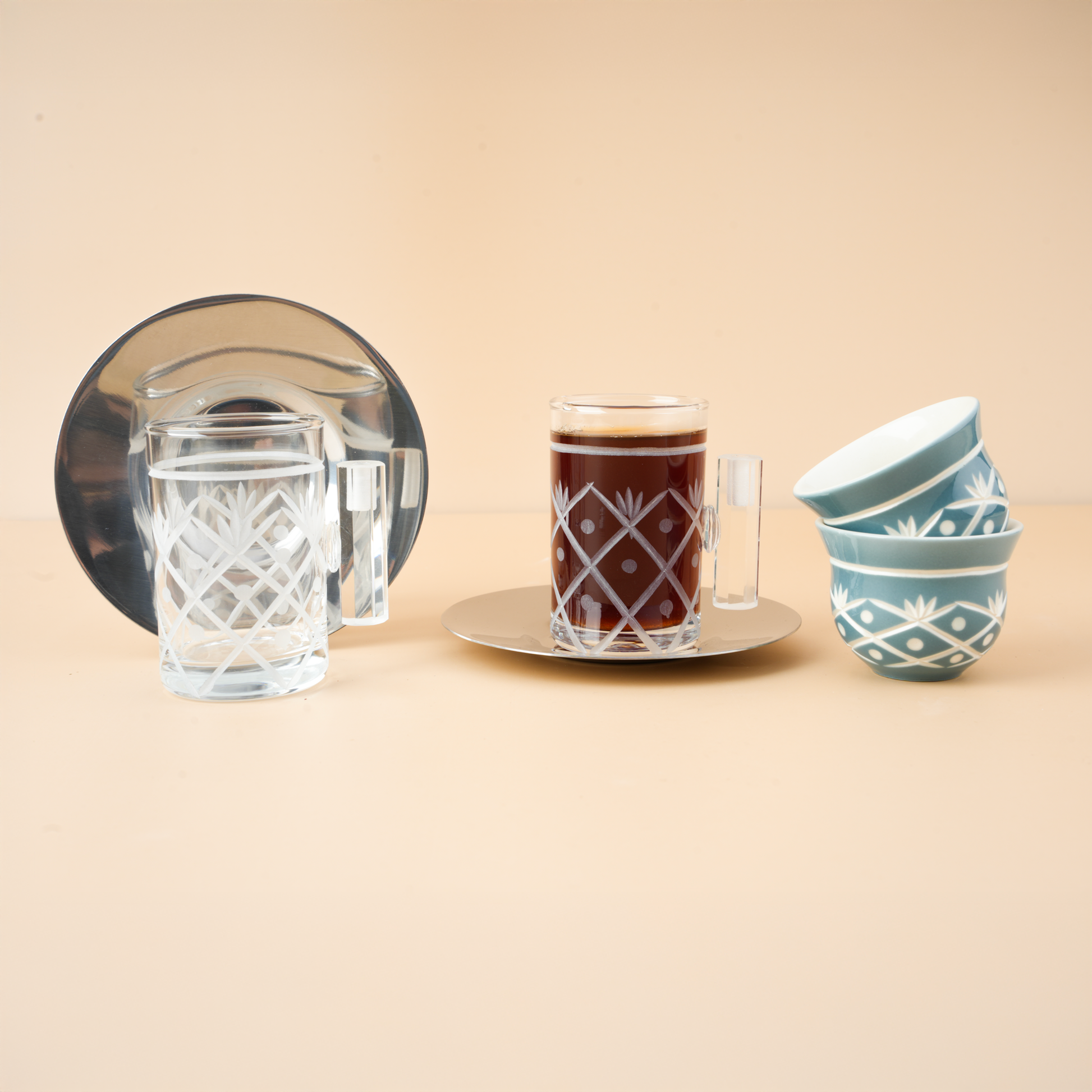 أضف لمسة من الرقي إلى ضيافتك مع طقم الكاسات الفاخر المكون من 18 قطعة بتصميم هندسي عصري جذاب. يحتوي الطقم على تشكيلة متنوعة من الكاسات والأكواب مع مقابض أنيقة تضمن راحة الاستخدام، بالإضافة إلى صحون تقديم دائرية تعكس الذوق الرفيع.
