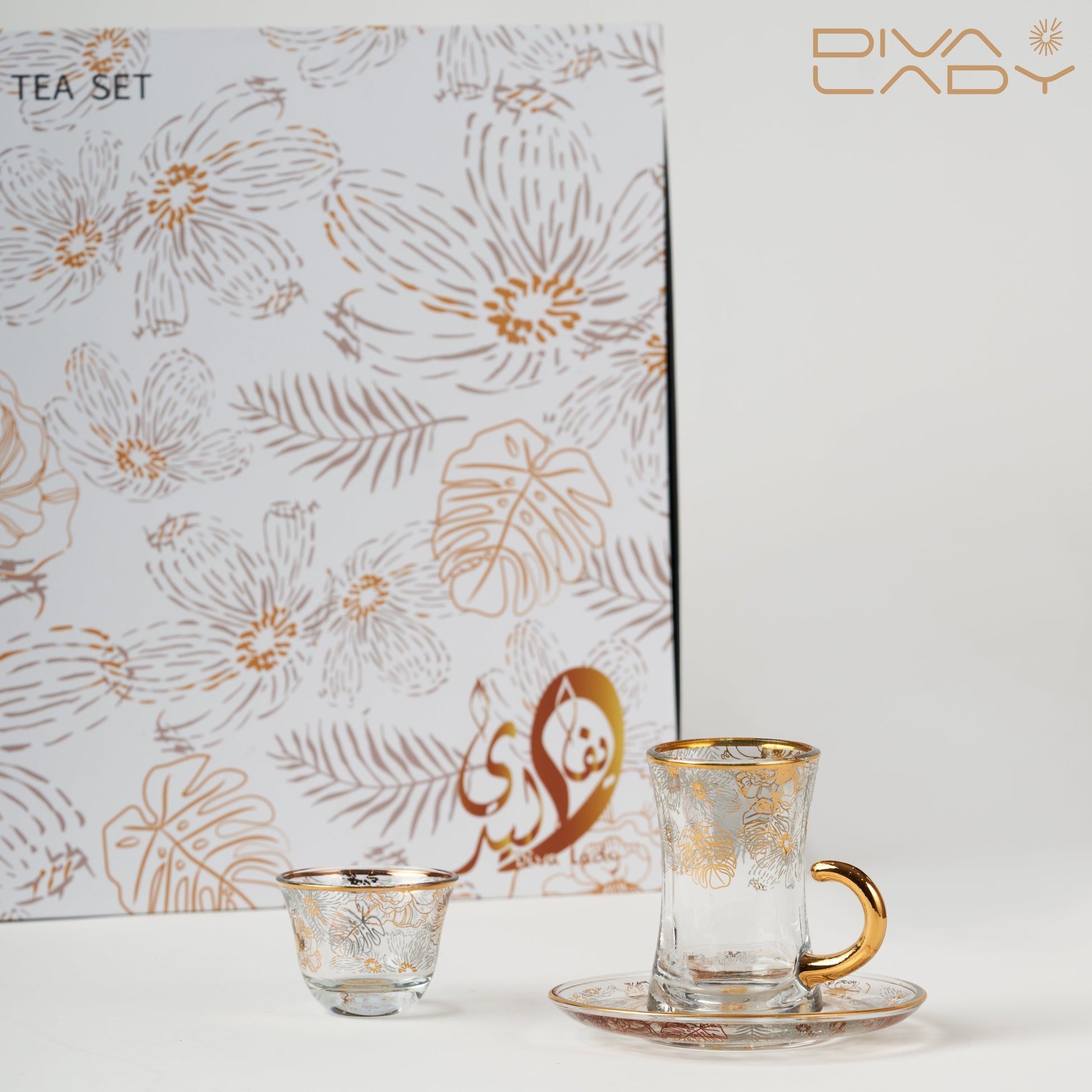 استمتع بجمال الطبيعة مع طقم الشاي الراقي من Diva Lady بتصميم أوراق وزهور مذهّبة على الزجاج، مع حواف ذهبية أنيقة تضيف فخامة لكل لحظة ضيافة.