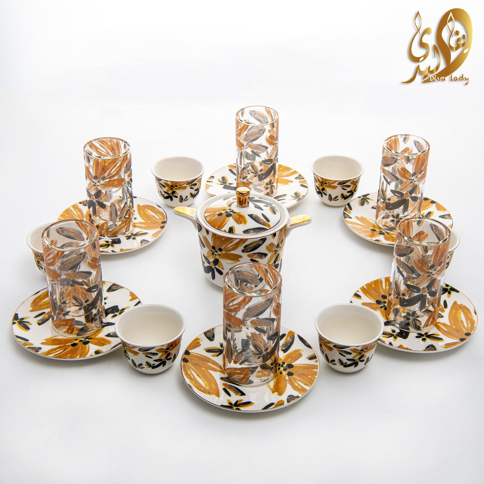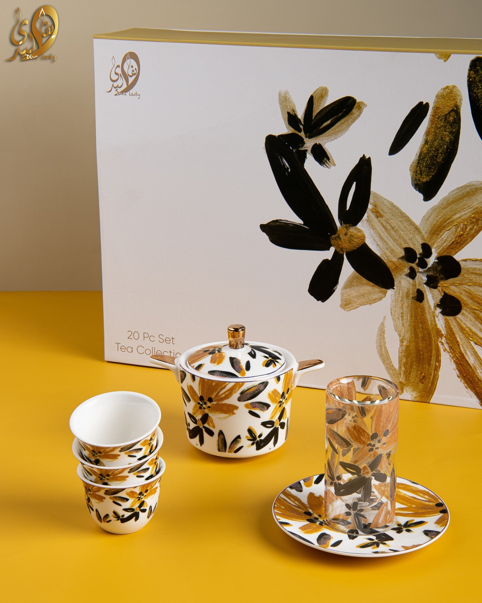 طقم شاي أنيق ، مثالي لجلسات الشاي الراقية أو كهديّة مميزة. تصميمه المتناسق بين الزجاج والبورسلان يضفي لمسة من الرقي والجمال.