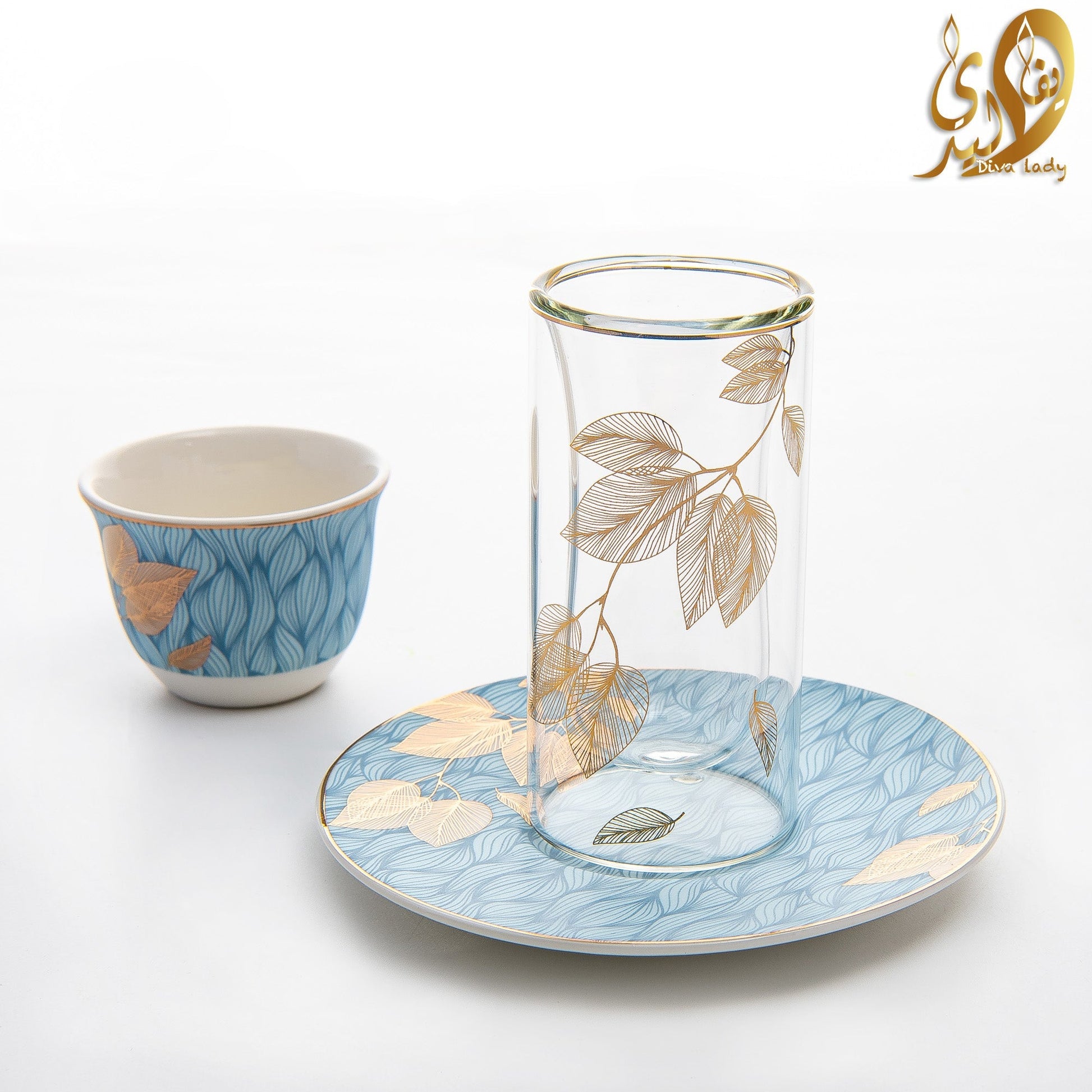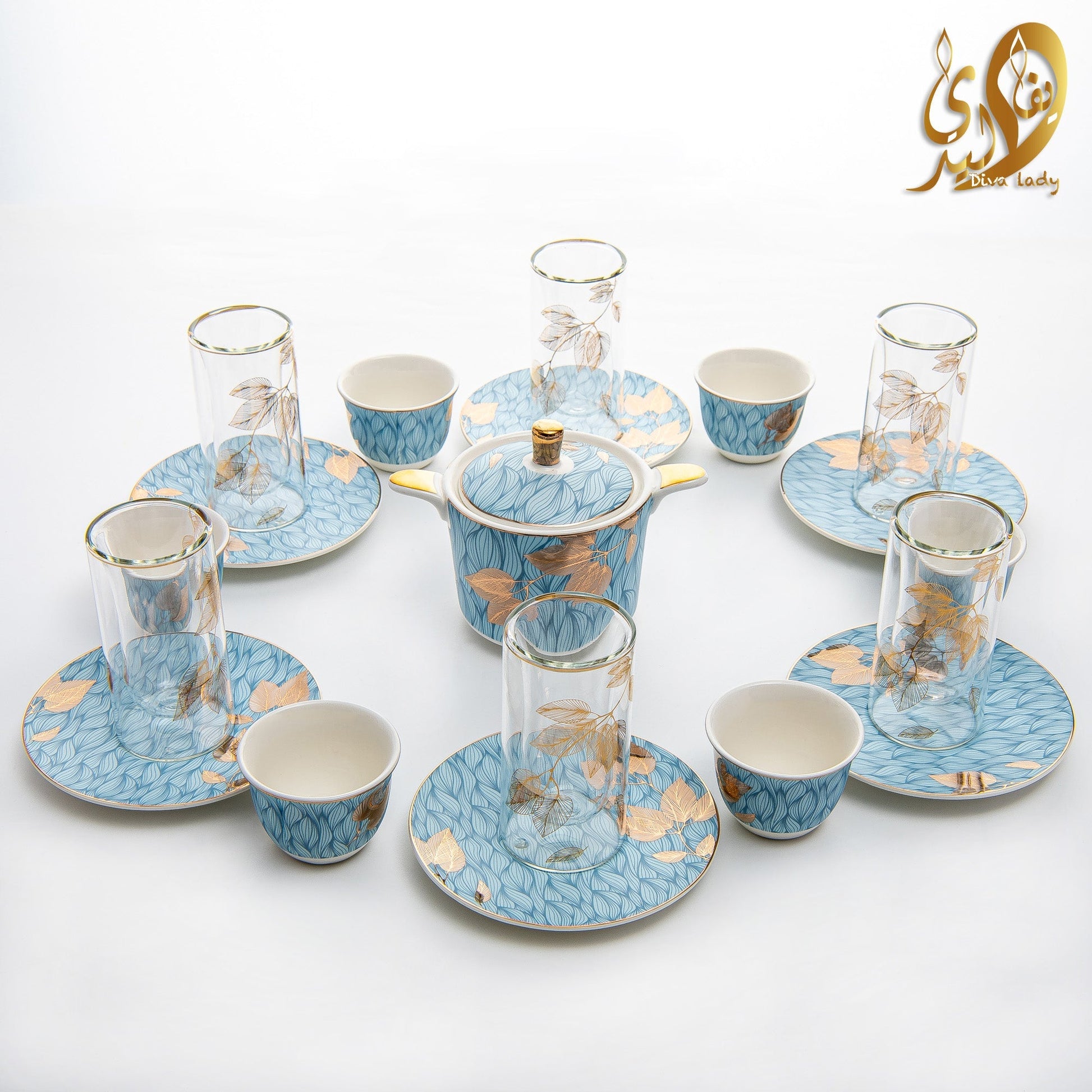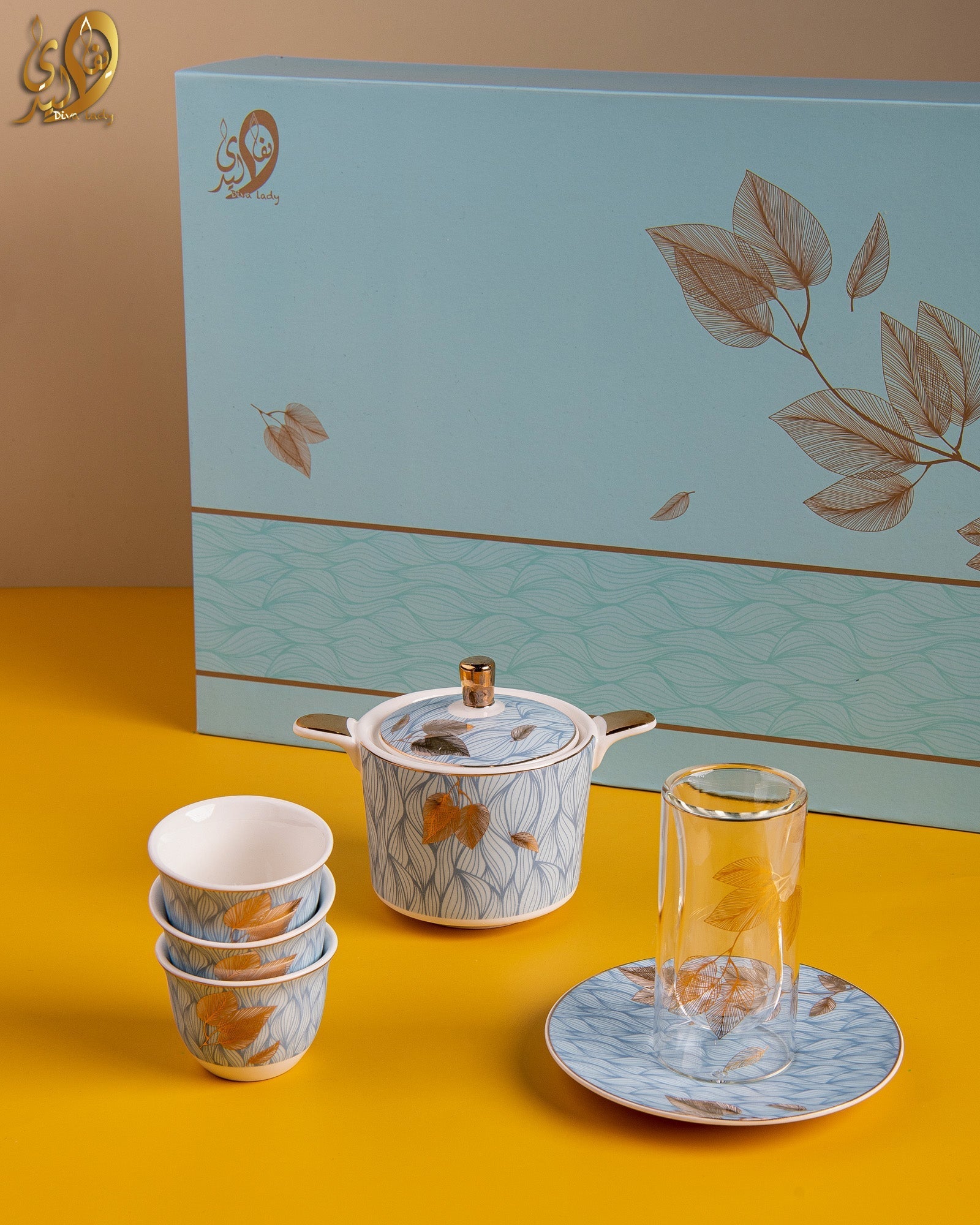 طقم شاي أنيق ، مثالي لجلسات الشاي الراقية أو كهديّة مميزة. تصميمه المتناسق بين الزجاج والبورسلان يضفي لمسة من الرقي والجمال.