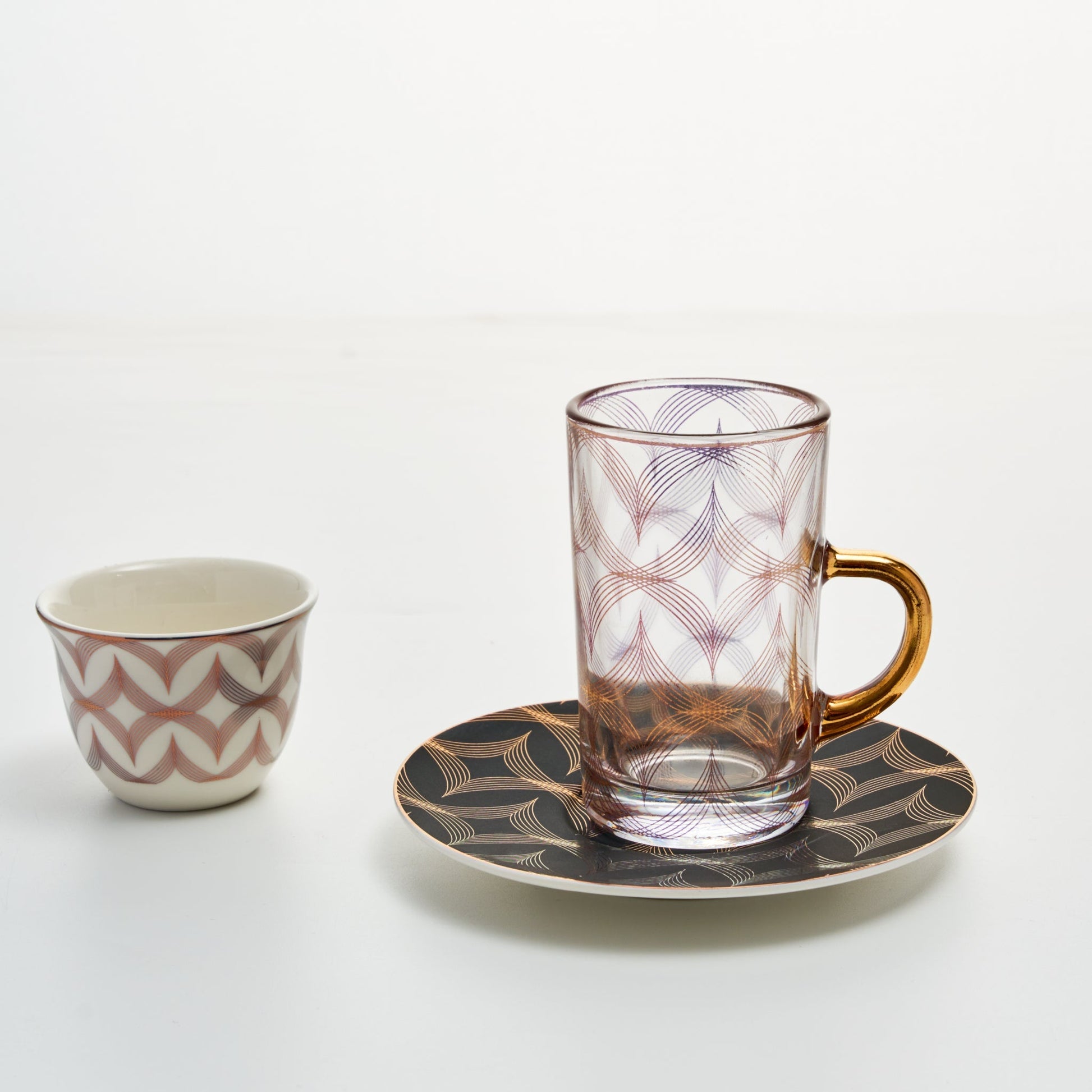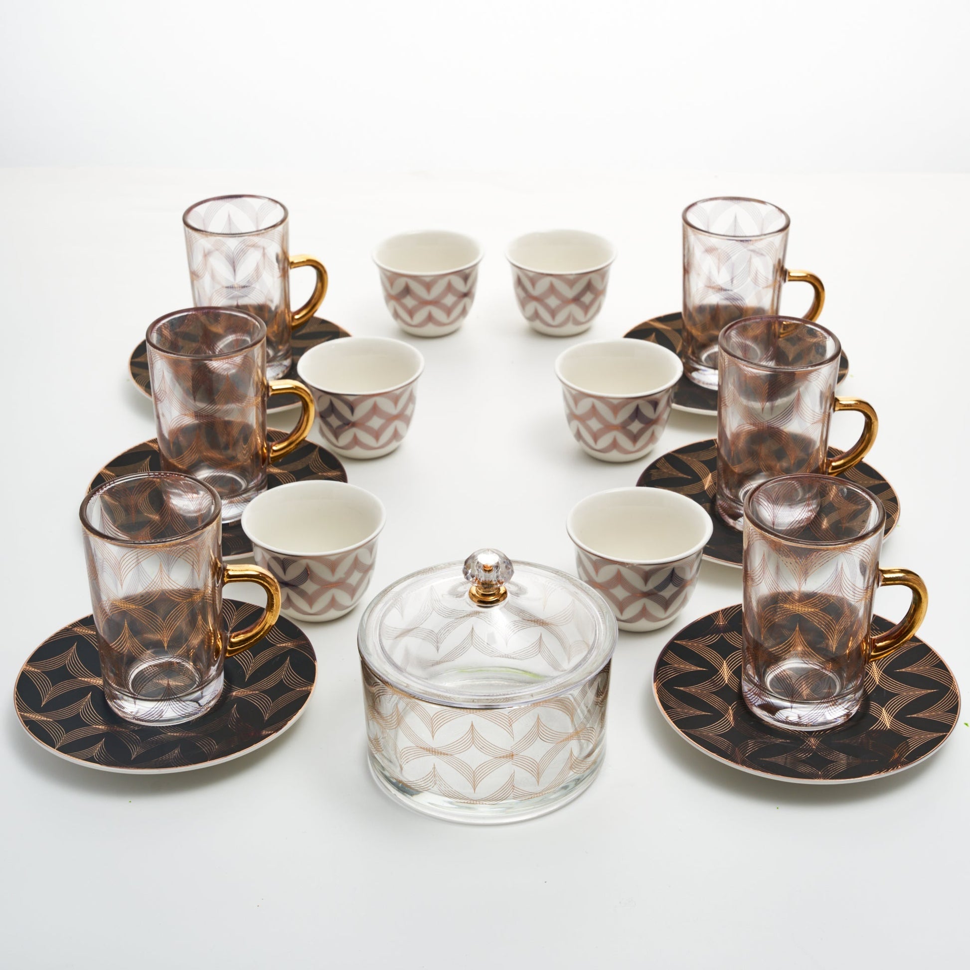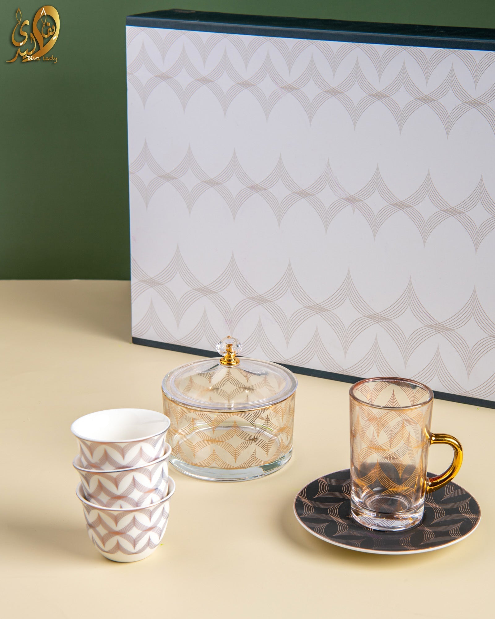 طقم شاي أنيق مثالي لجلسات الشاي الراقية أو كهديّة مميزة. تصميمه المتناسق بين الزجاج والبورسلان يضفي لمسة من الرقي والجمال.