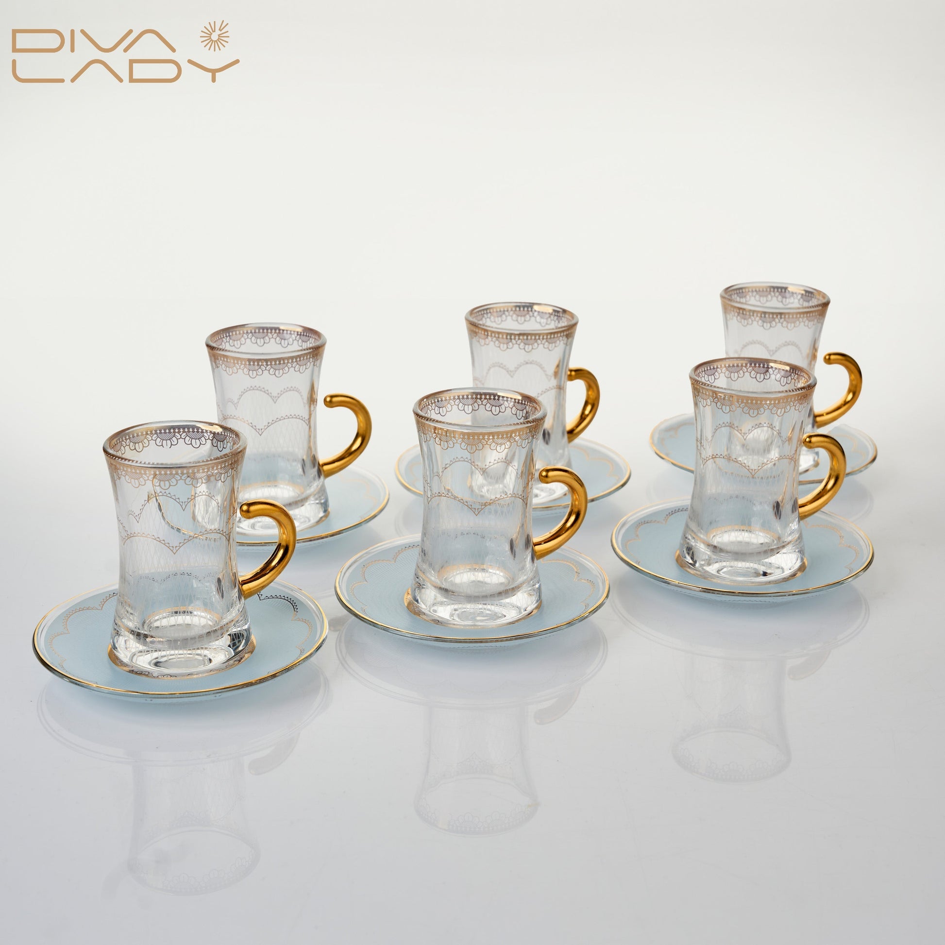 عدد 6 استكانات +6 فناجين قهوة عربية + 6 صحون باللون الازرق السماوى و مزينة باللون الذهبى