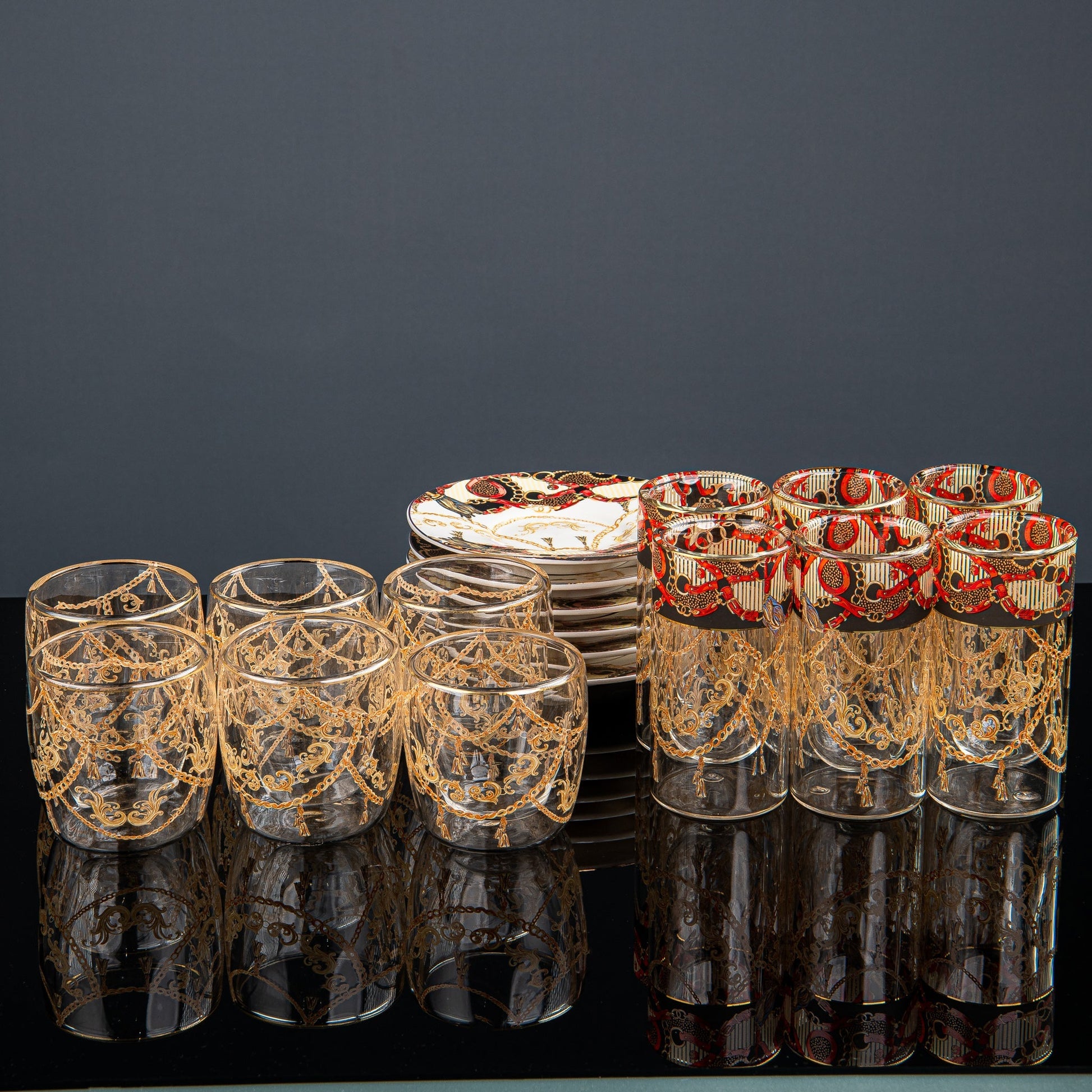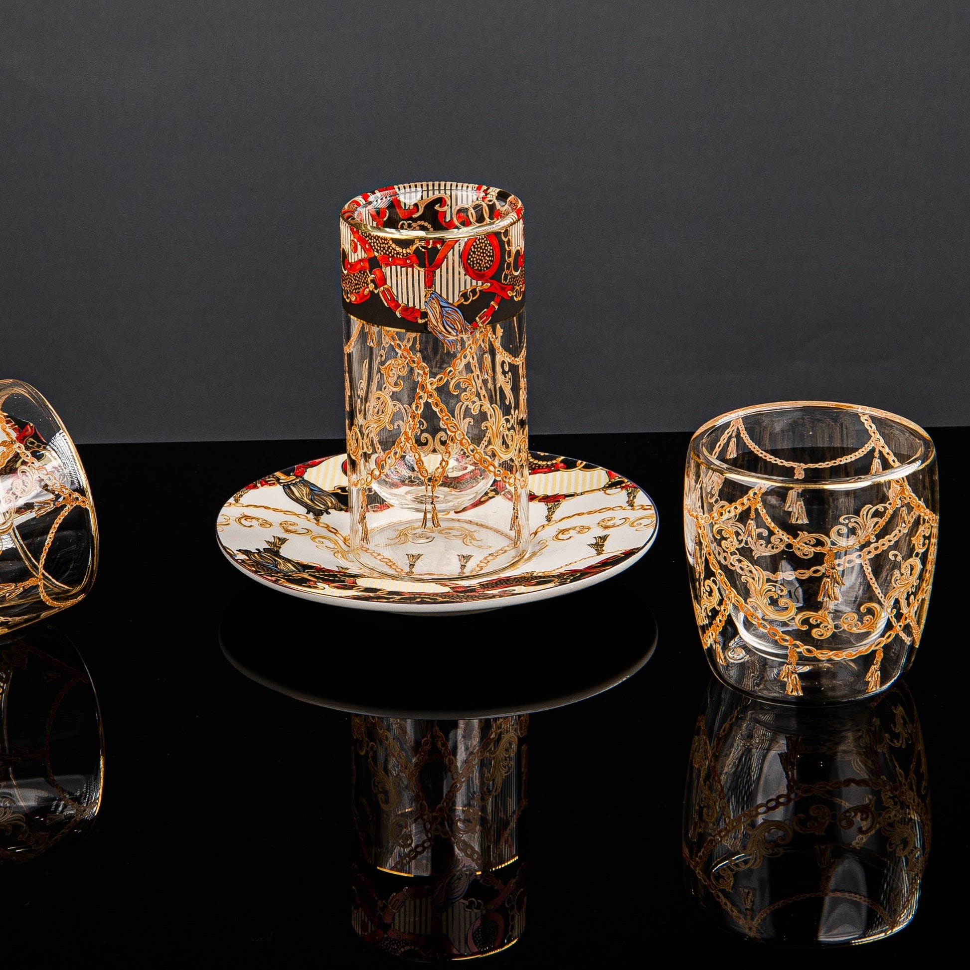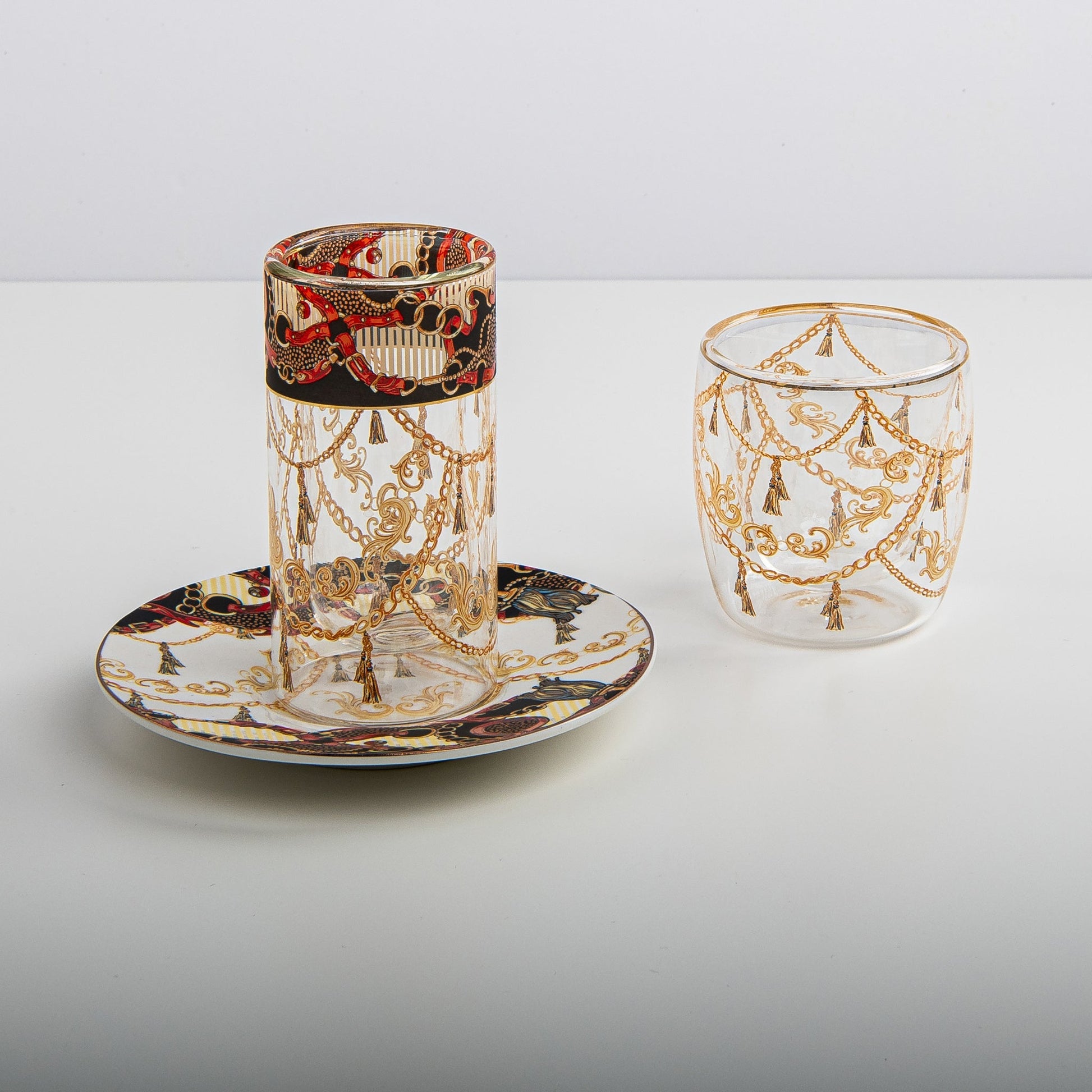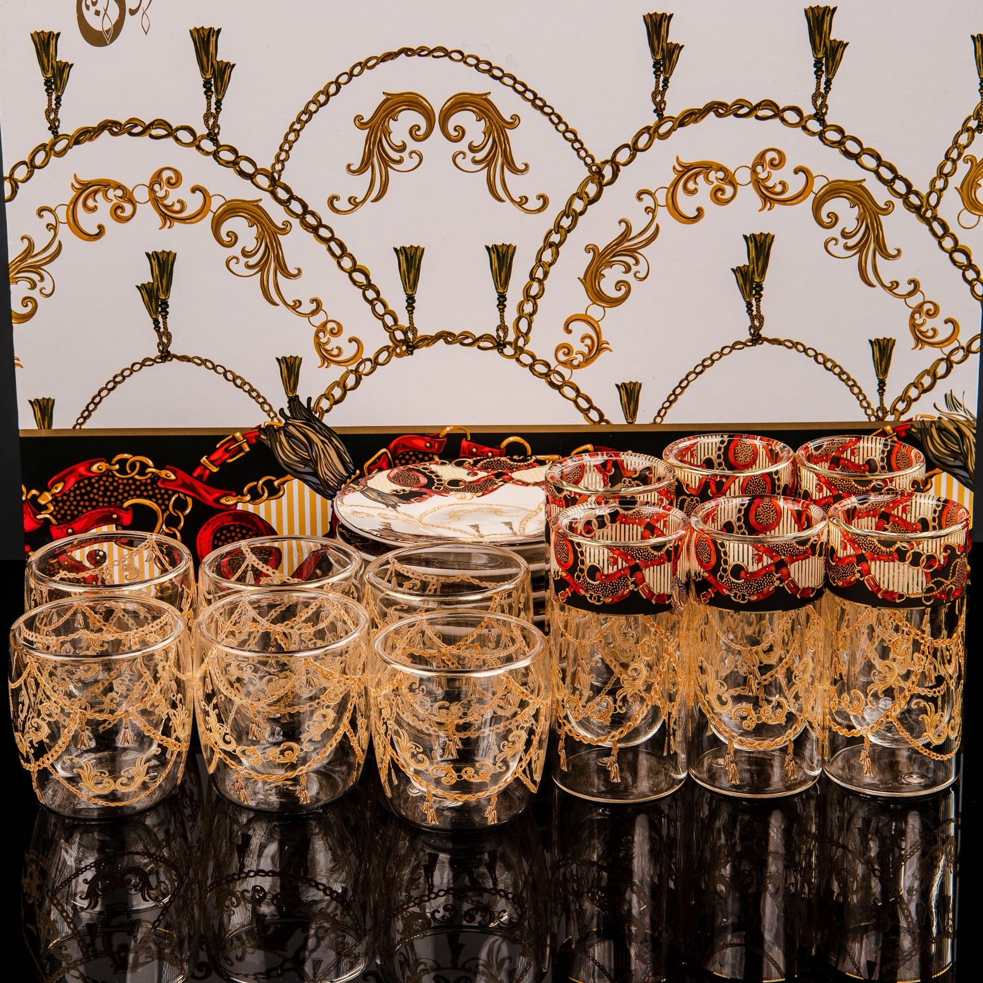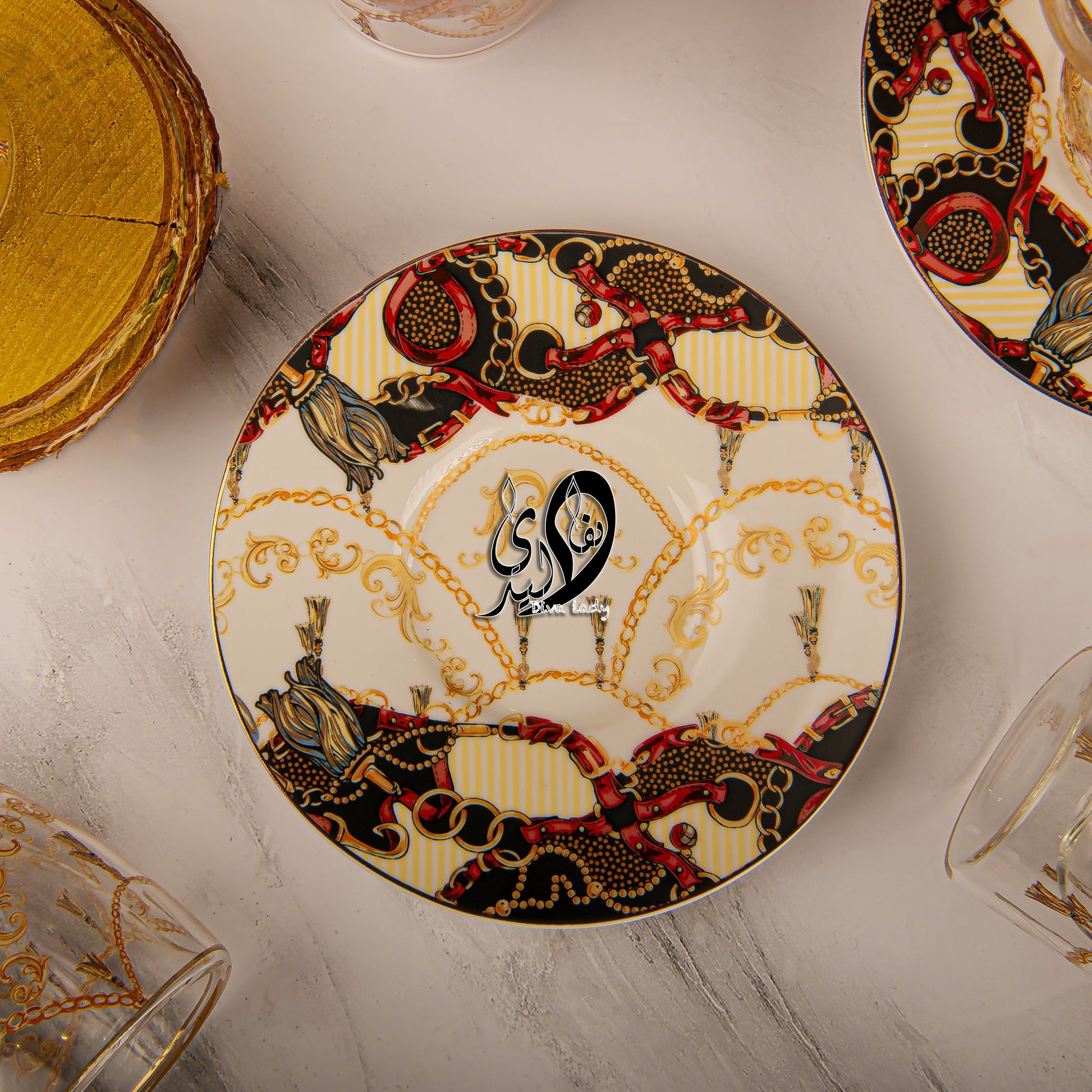 تميّزي في ضيافتك مع طقم أنيق وراقي بنقشة مستوحاة من الفخامة الملكية، مزخرف بتفاصيل دقيقة باللون الذهبي والأسود والأحمر.