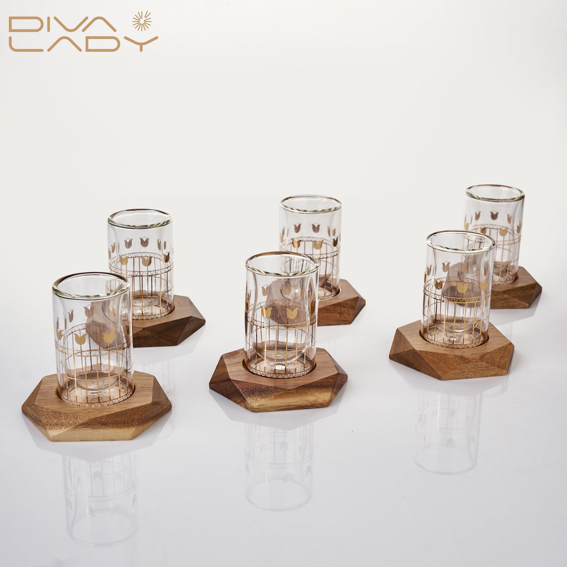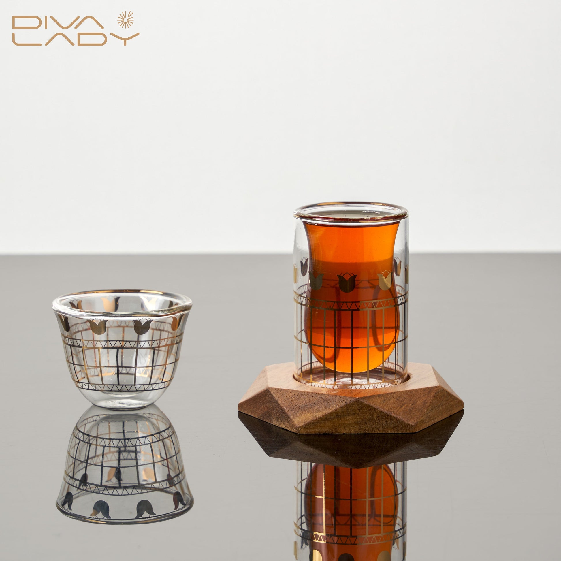 عدد 6 استكانات +6 فناجين قهوة عربية + 6 صحون خشبية