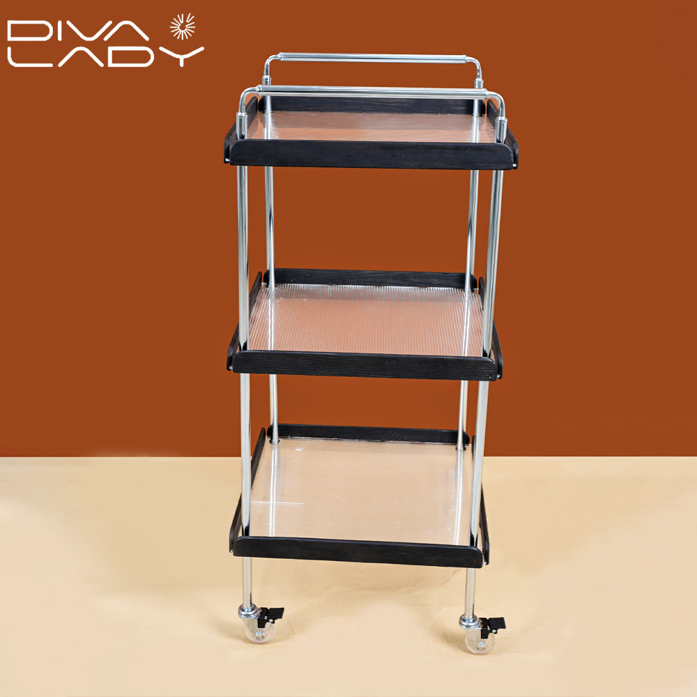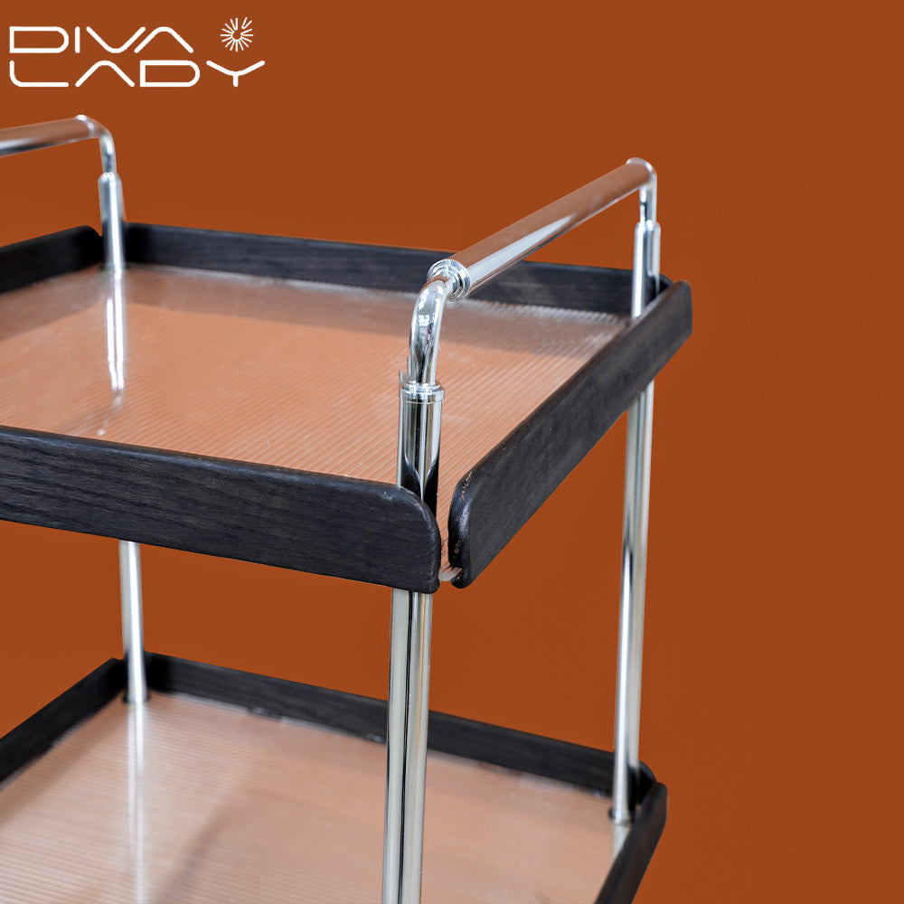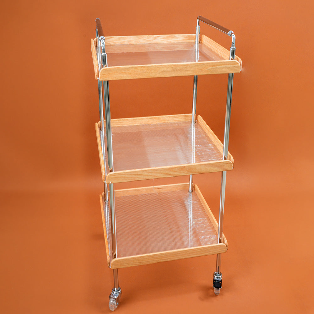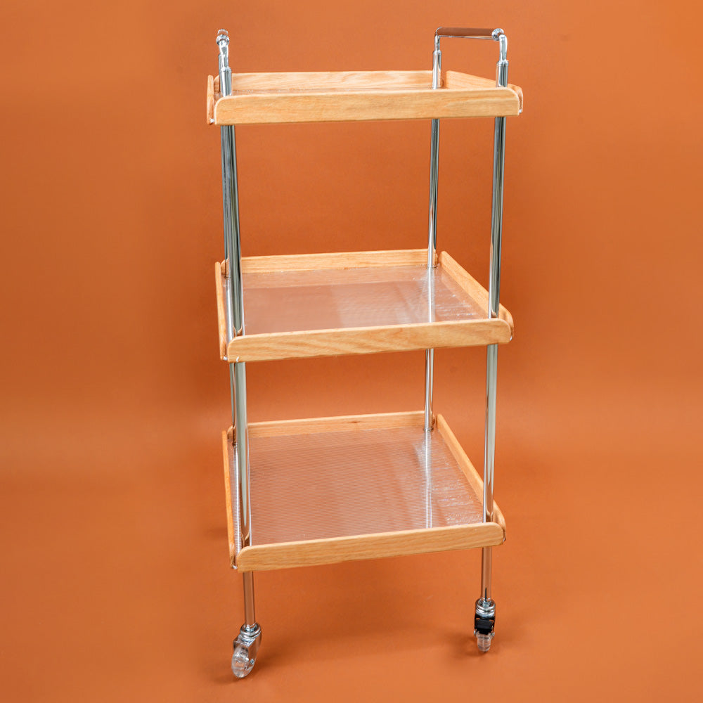 * ثلاثة أرفف واسعة: يوفر ثلاثة أرفف واسعة مساحة كافية لتخزين وتنظيم مجموعة متنوعة من الأغراض، مثل أدوات المائدة، الأطباق، المشروبات، الكتب، النباتات، أو أي شيء آخر ترغب في عرضه أو نقله بسهولة.