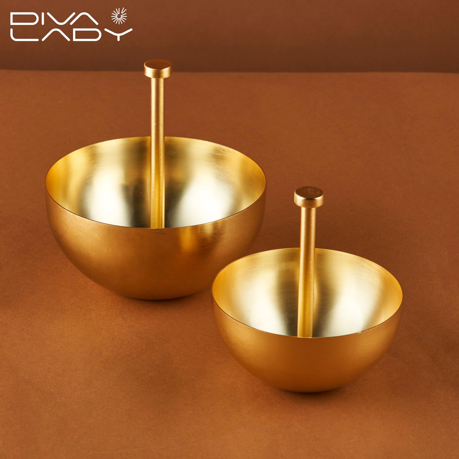 وعاء معدني من الفولاذ المقاوم للصدأ على شكل نصف كرة. يتميز بلمعة معدنية (ربما نحاسية أو برونزية) وله قاعدة مسطحة مع دبوس بارز من المنتصف.