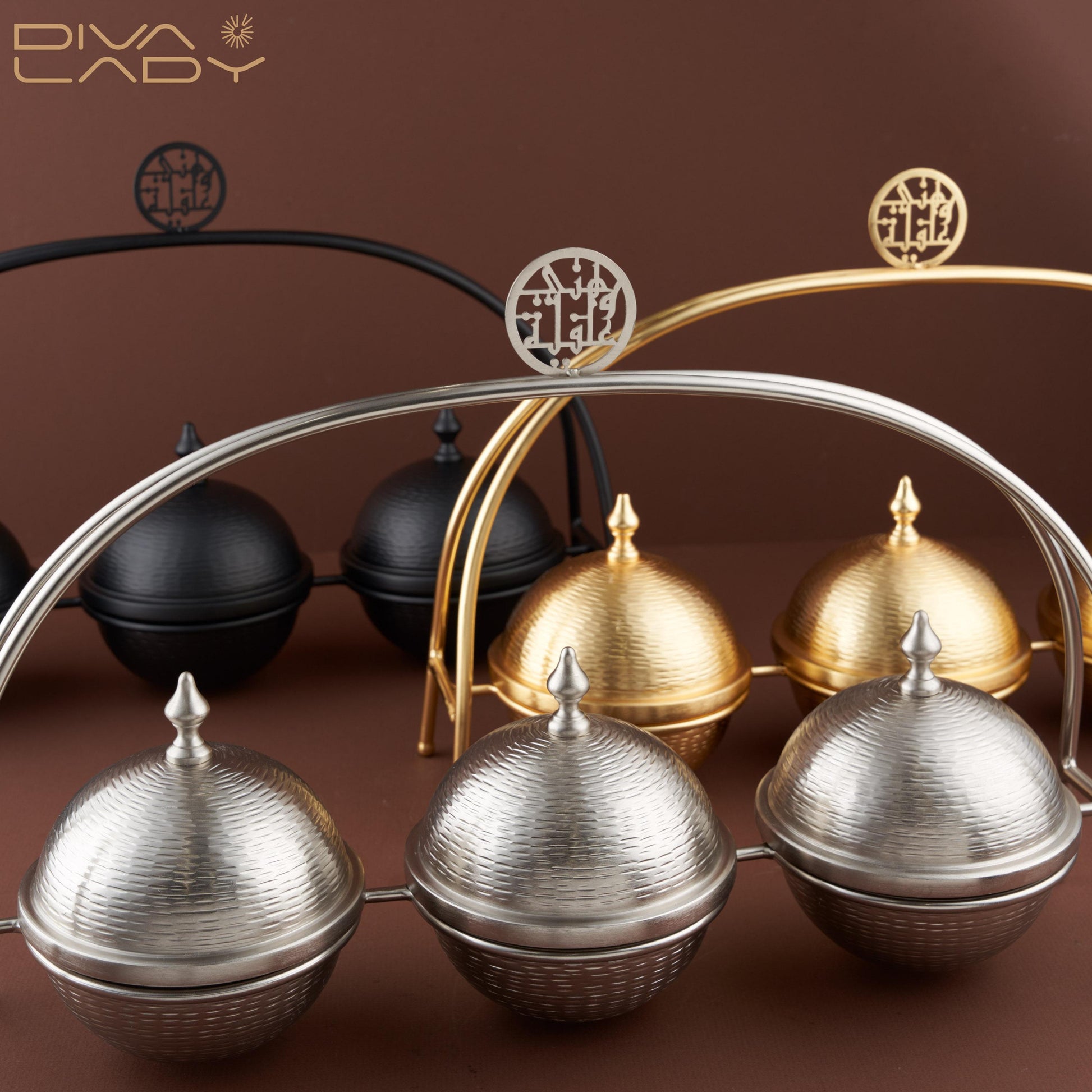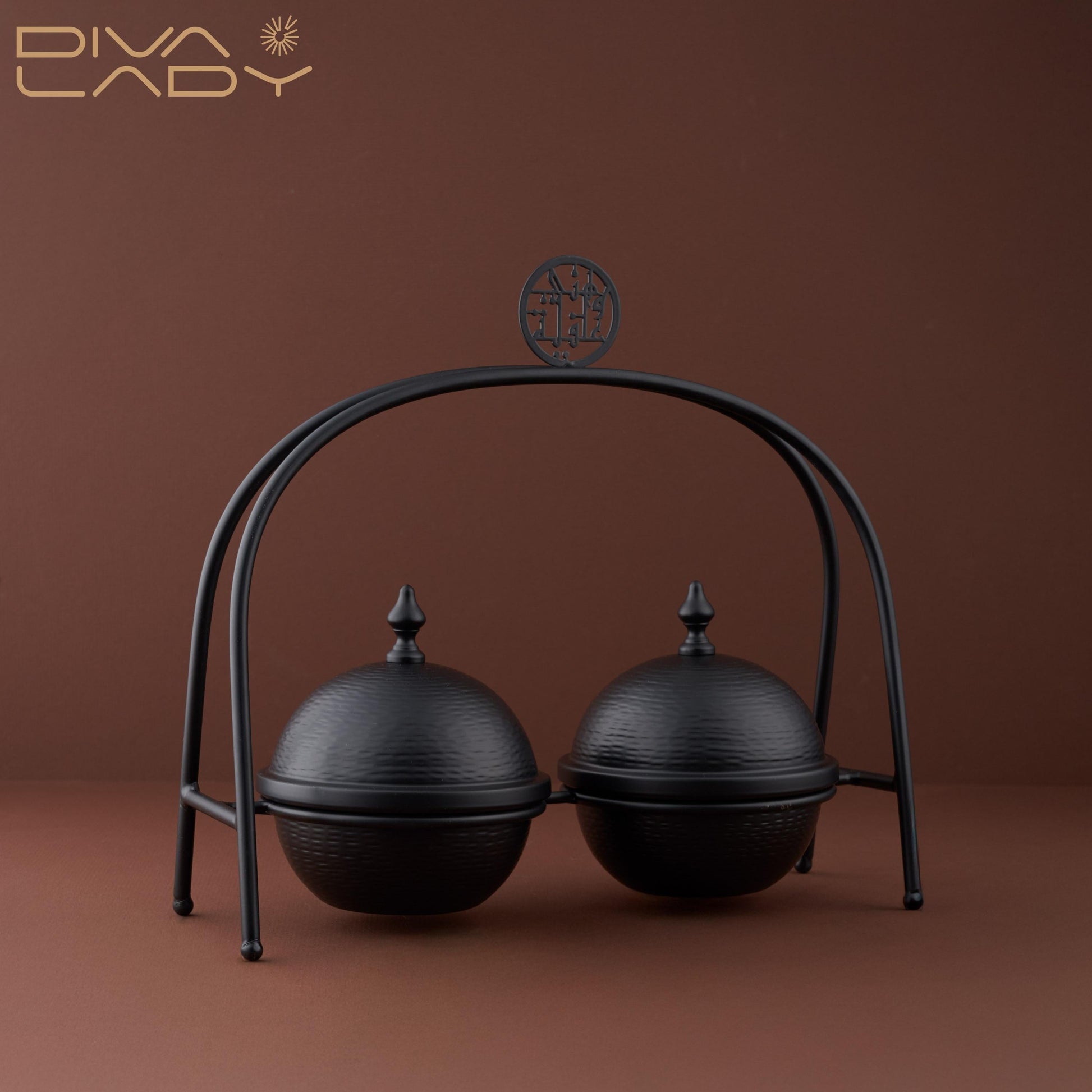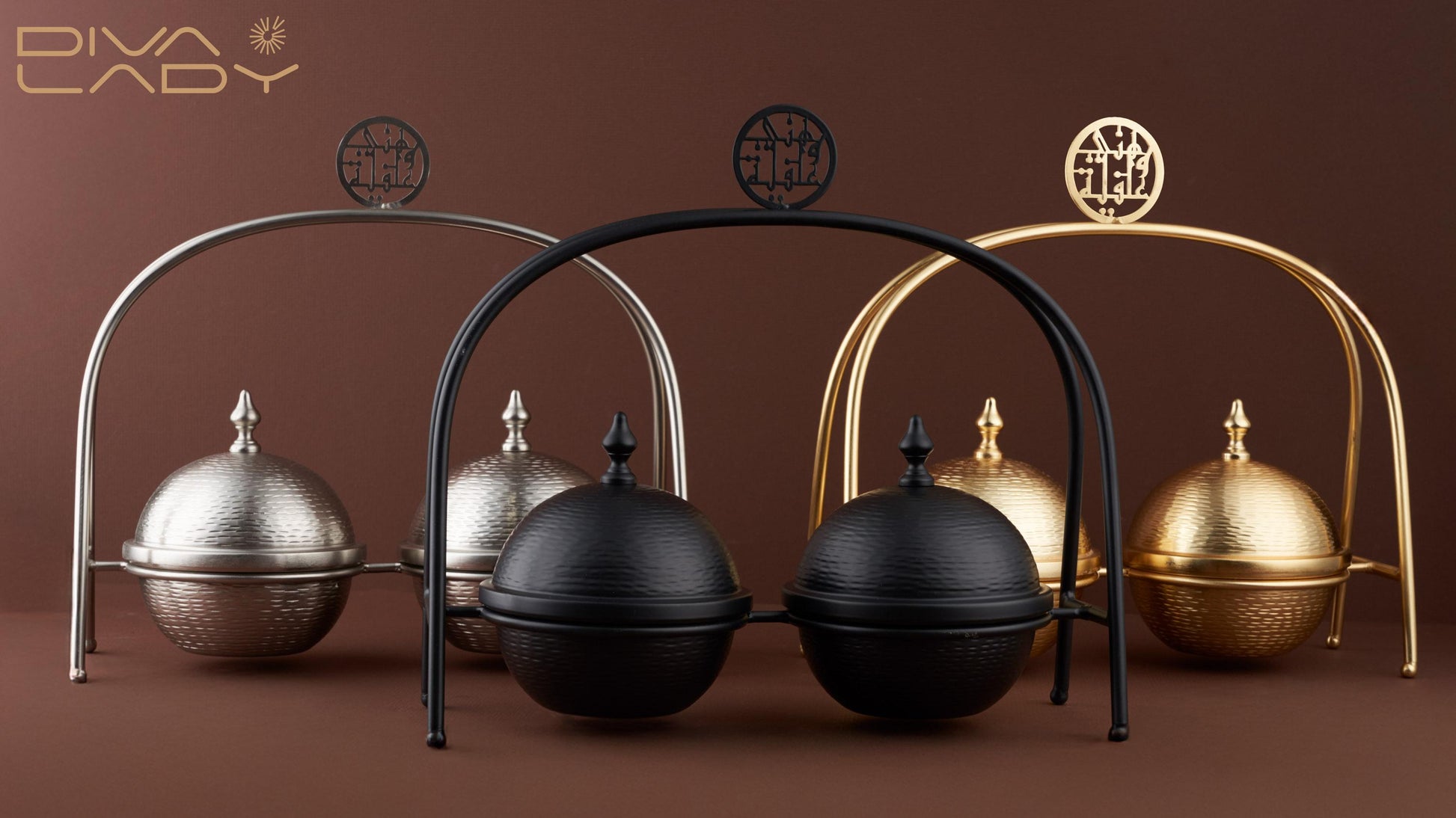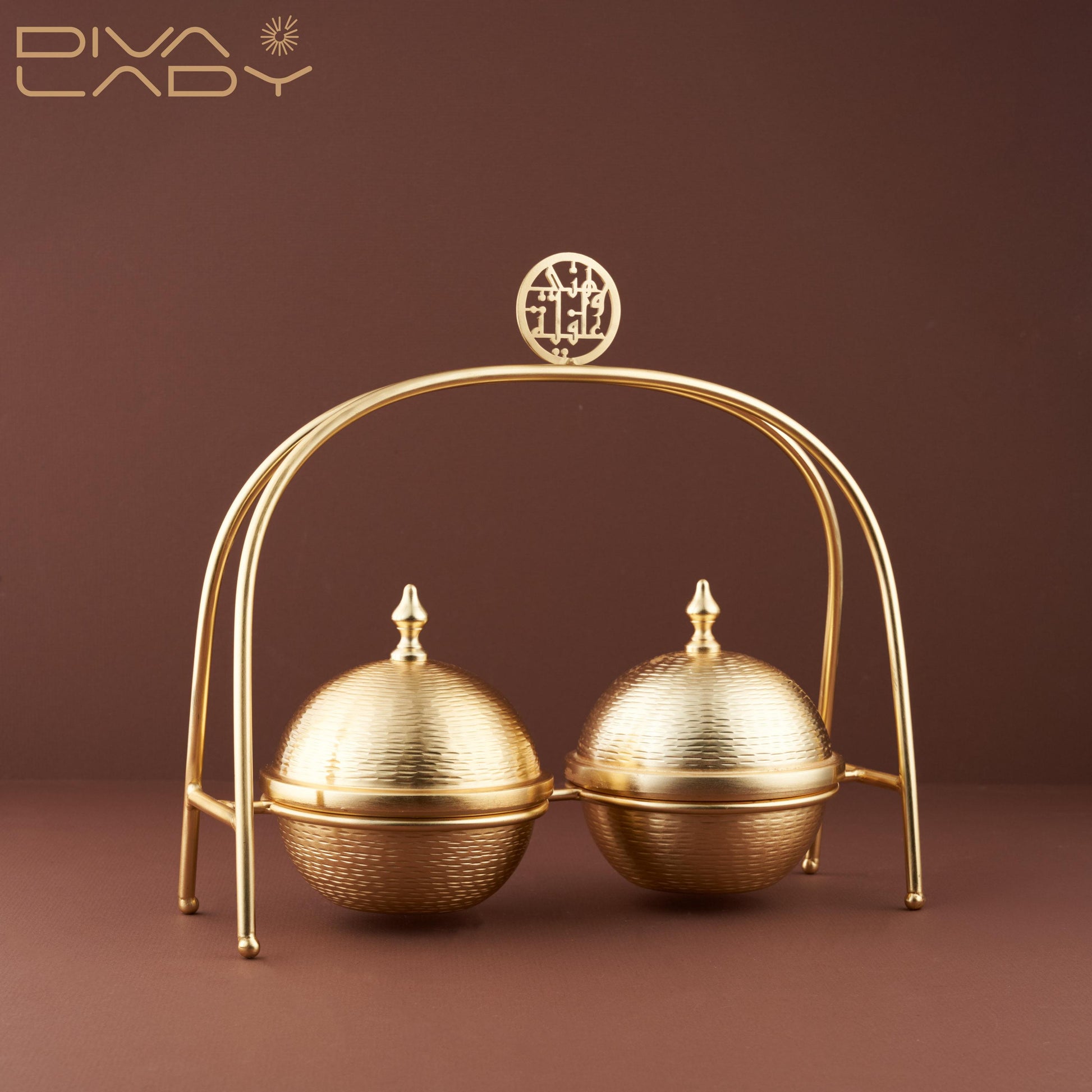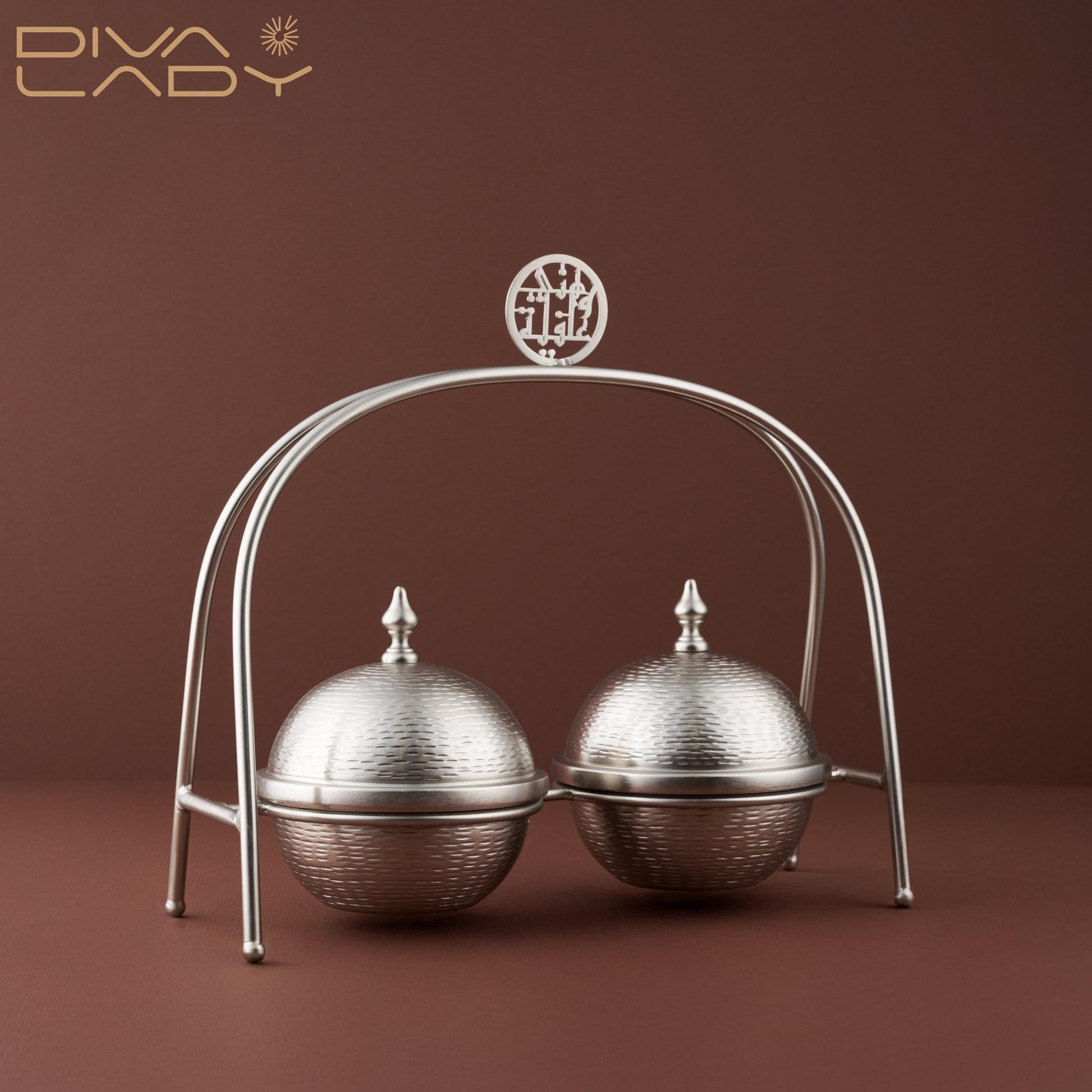 وعاء التمر هذا يبدو أنه قطعة أنيقة وعملية في نفس الوقت يتكون الوعاء من قاعدة عريضة تحمل وعائين كروي الشكل الأوعية الكروية مزودة بأغطية مما يساعد على الحفاظ على التمر طازجًا تصميم الوعاء يعكس طابعًا تقليديًا وعربيًا