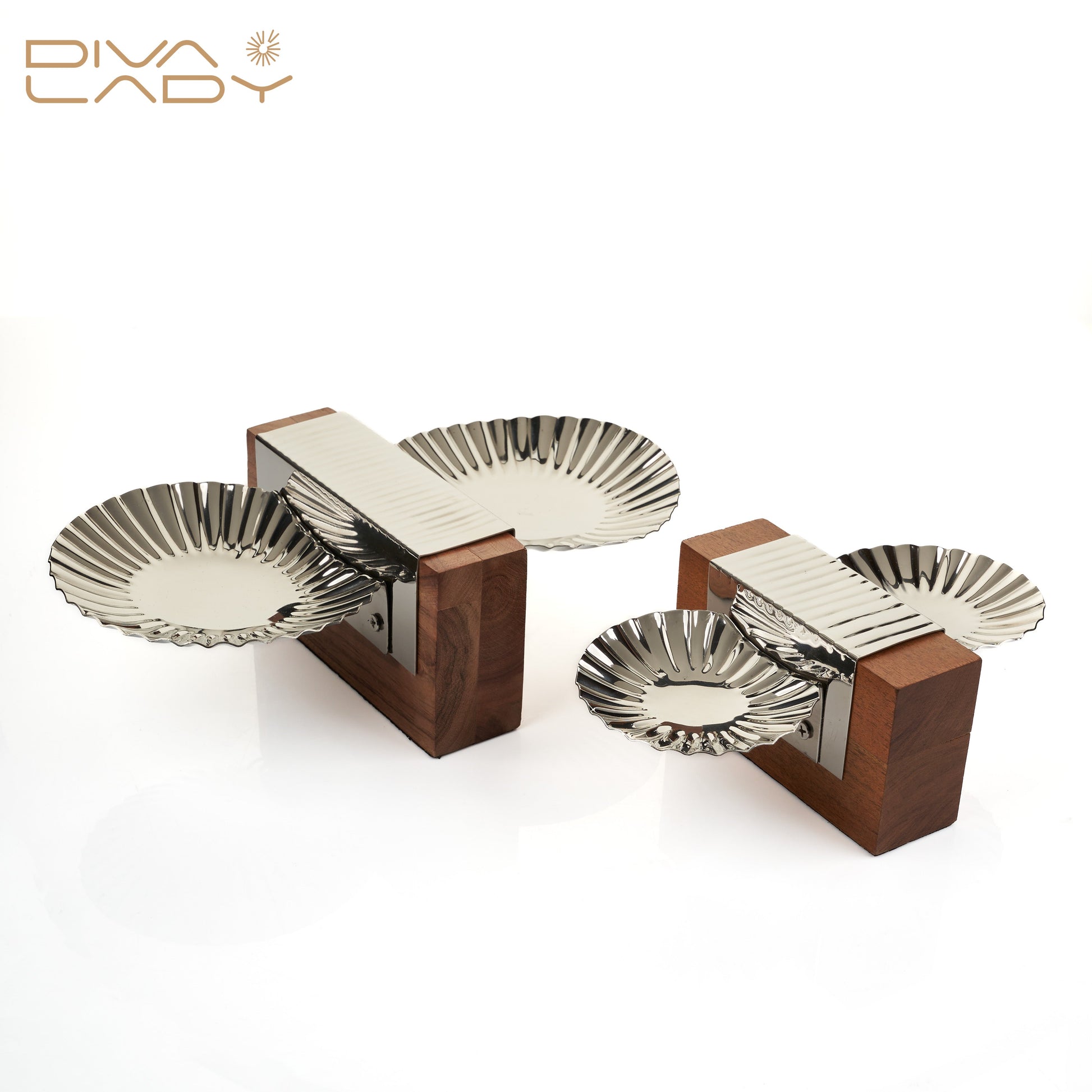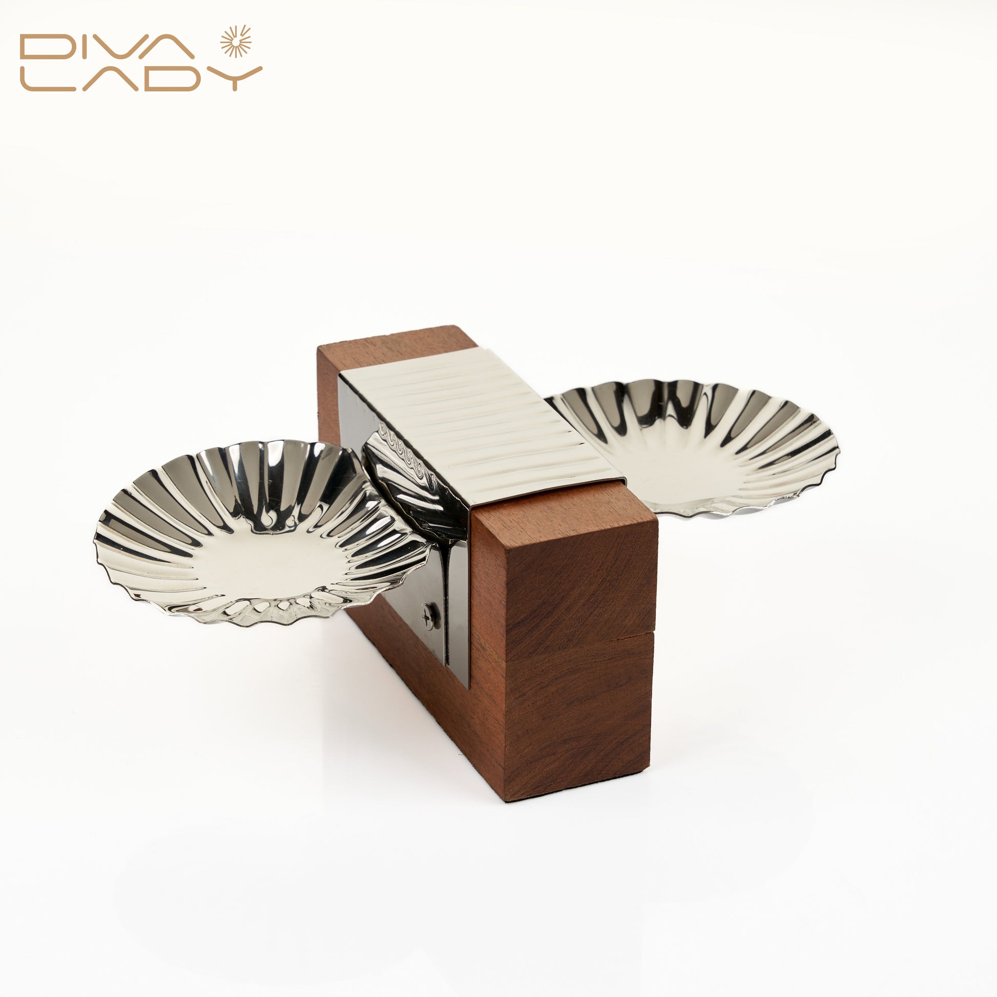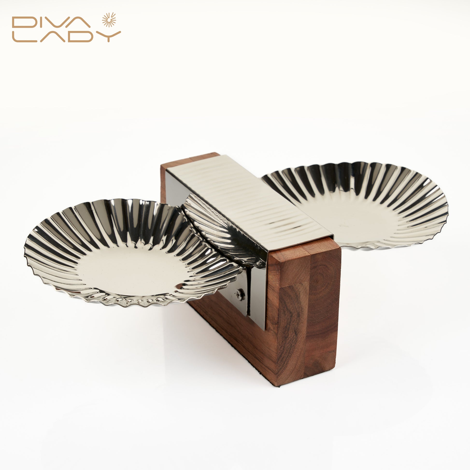 وعاء تقديم مزدوج باللون الفضى مزود بقاعدة خشبية