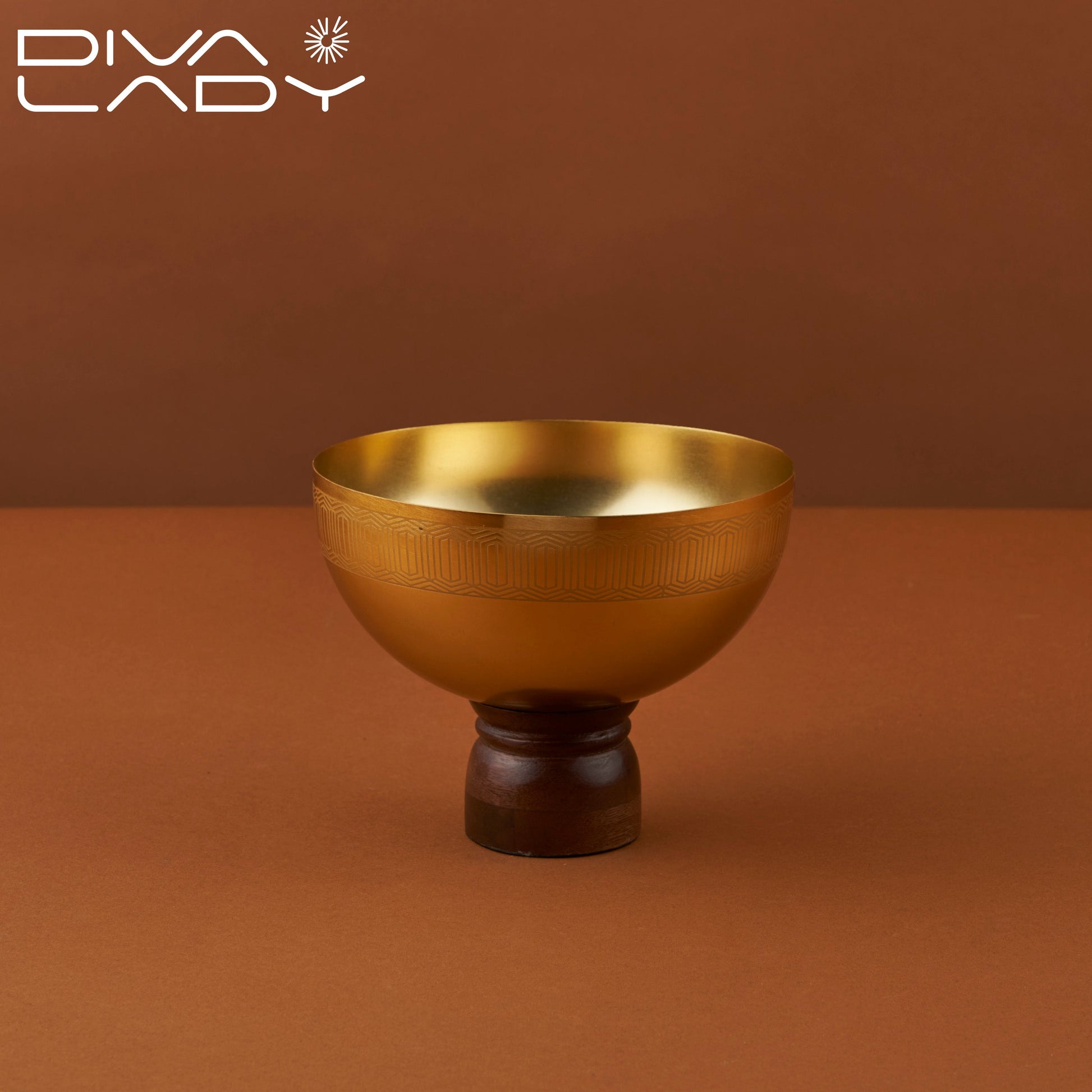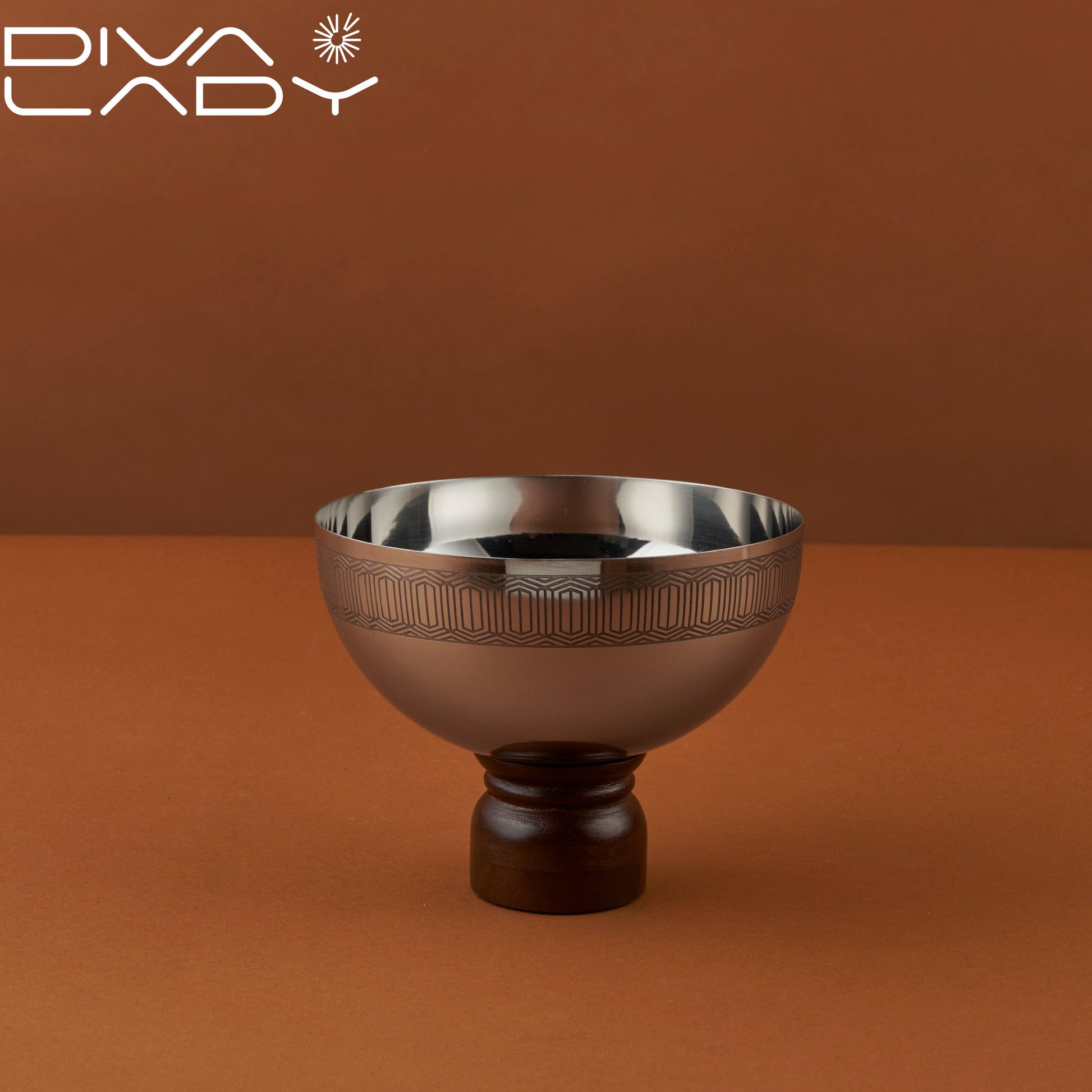 وعاء تقديم استيل بقاعدة خشب . الوعاء مصنوع من الاستاليس استيل الامع . يستخدم هذا الوعاء لاغرض زخرفية او عملية , مزود بقاعدة خشبية سهل التنظيف